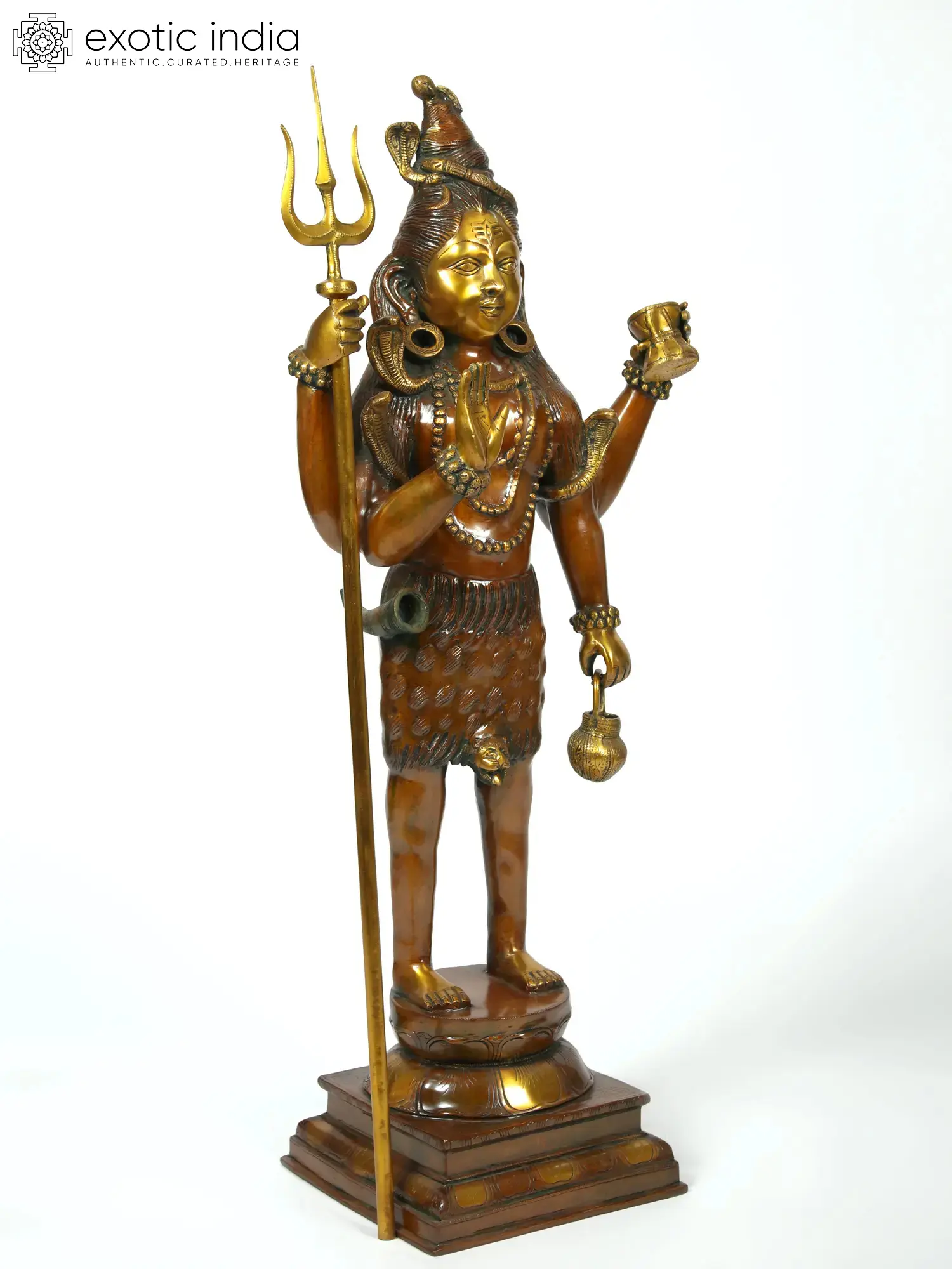 In the hands of this Mahadeva big statue are a quantum of blessing in the aashirvaad mudra and the kamandalu in the anterior hands, and trishoola va damroo in the posterior hands. It is a monotone brass composition that would look great both in the outdoors (say, in the garden or at the entrance to your home) and indoor.