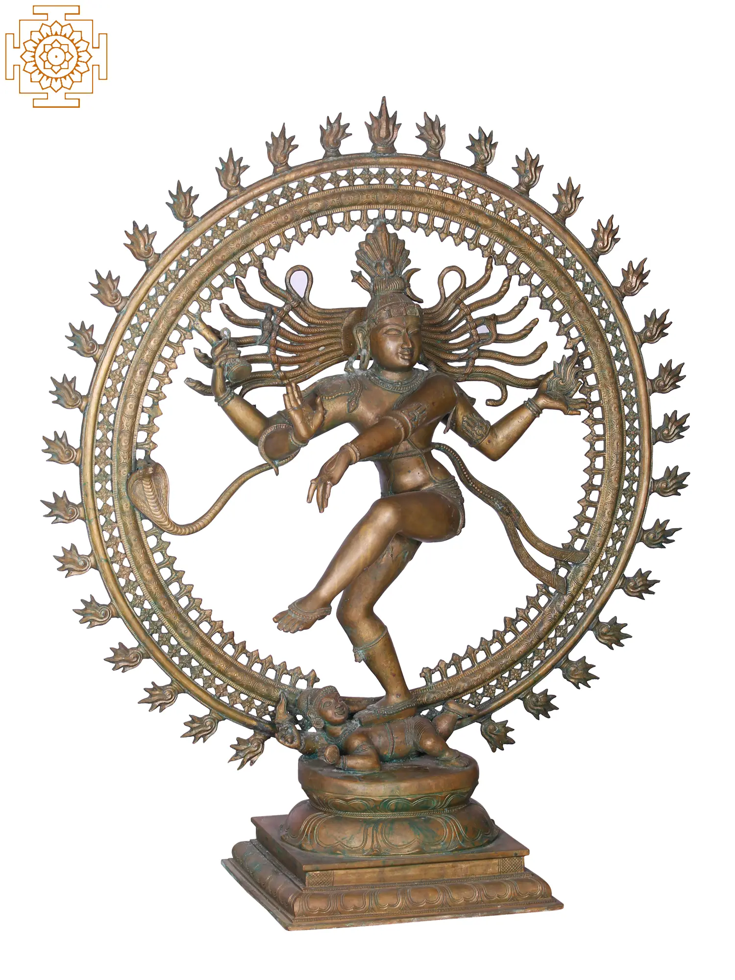 The icons of Nataraja hold a revered place in the imagination of Bhakti poets and artists, who have evoked the beauty of the dancing Shiva in their poems, the lyricism of which seems to be translated into solid form, in this magnificent Panchaloha bronze statue of Nataraja, which emanates from its form a riveting dynamism and supreme serenity.