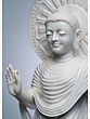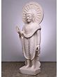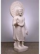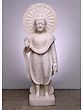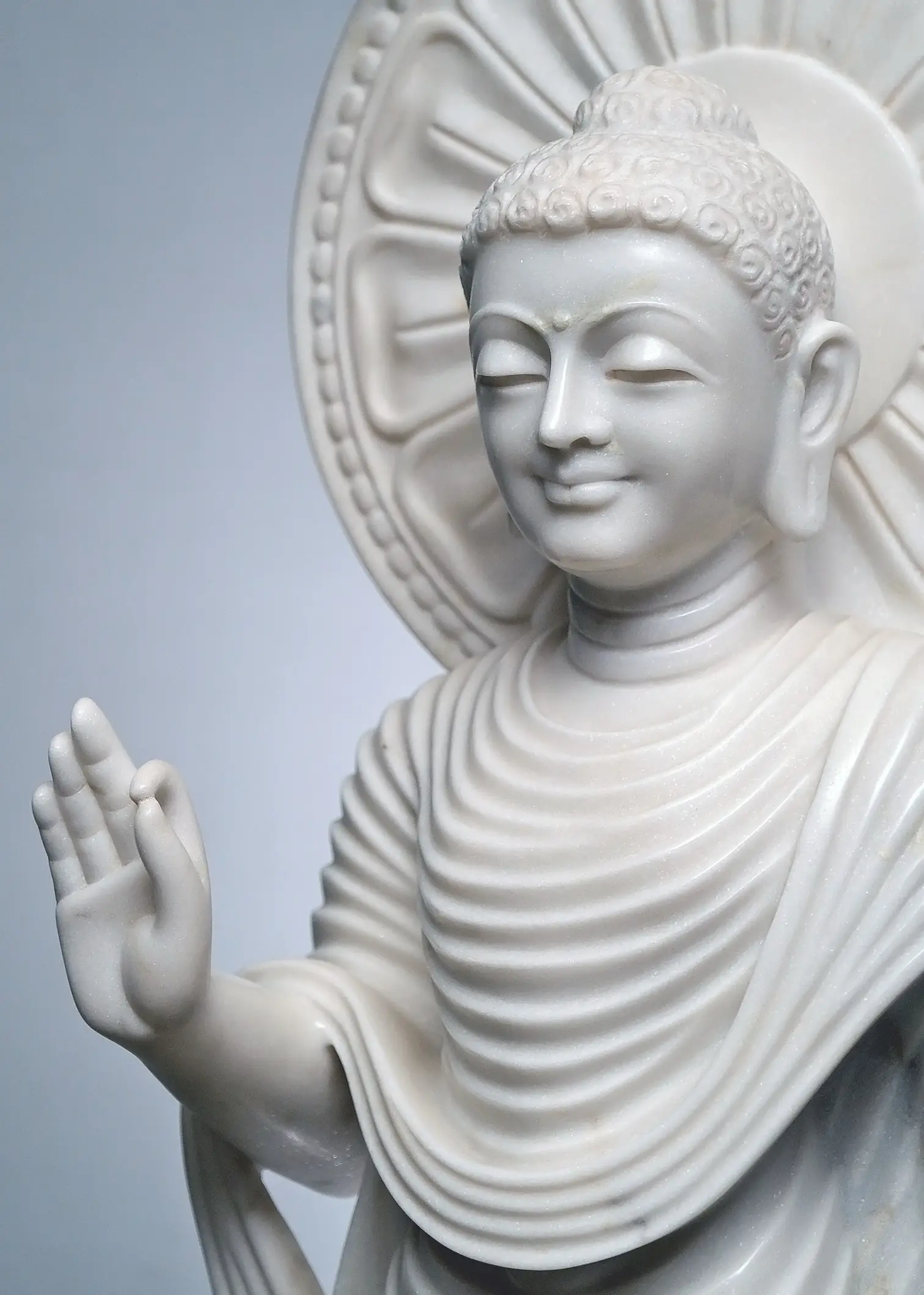 This large white marble stone statue of Buddha depicts him in a heavenly mood, dressed in monks' attire which forms ripple-like patterns on the statue, adding magnificence to it.