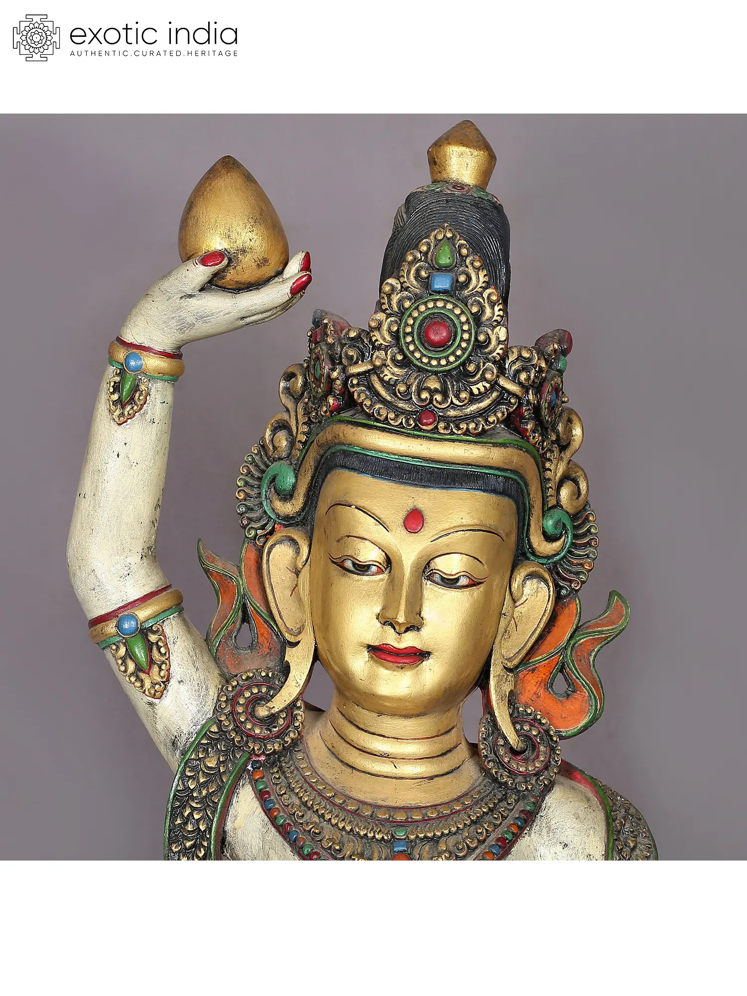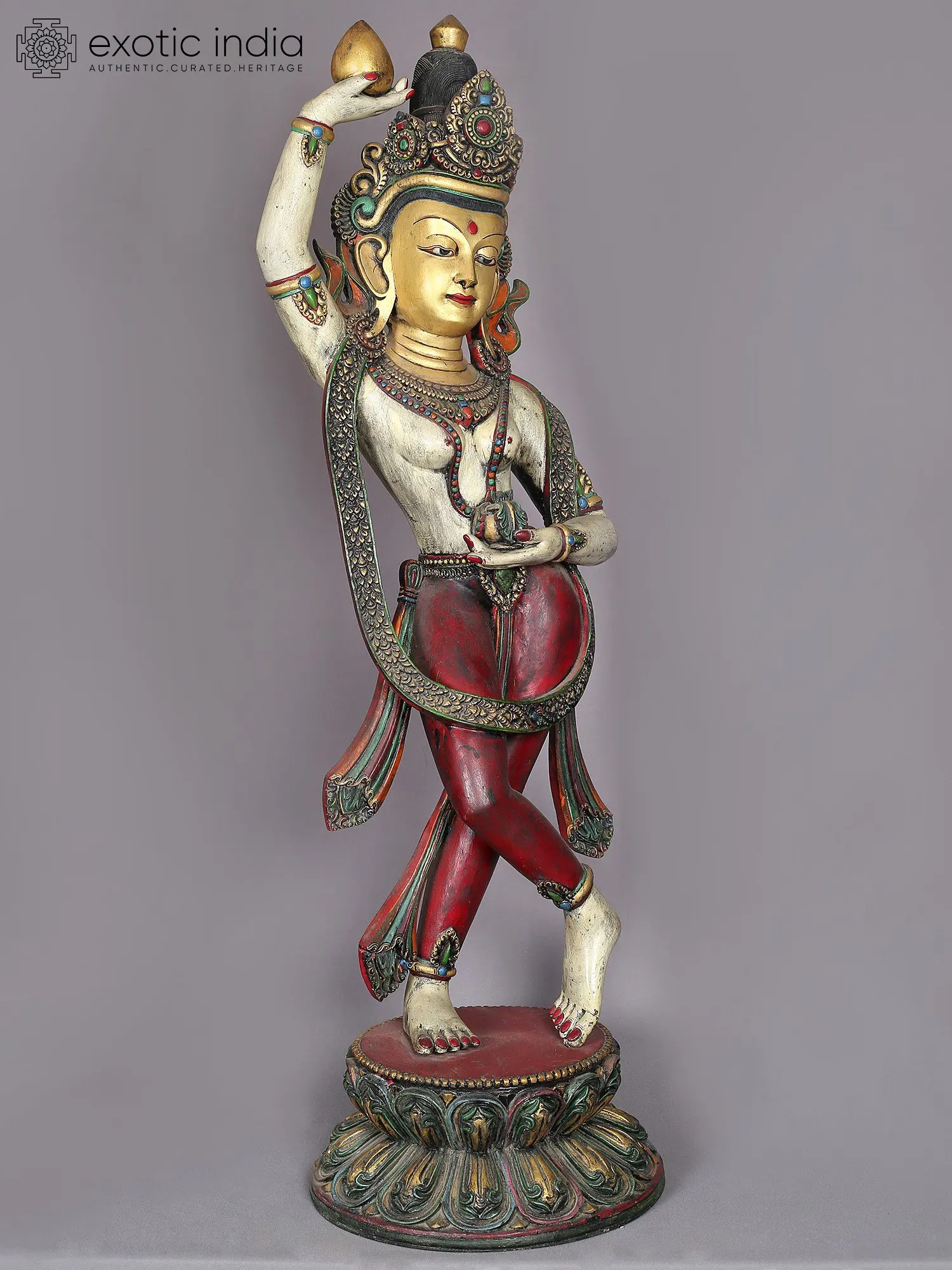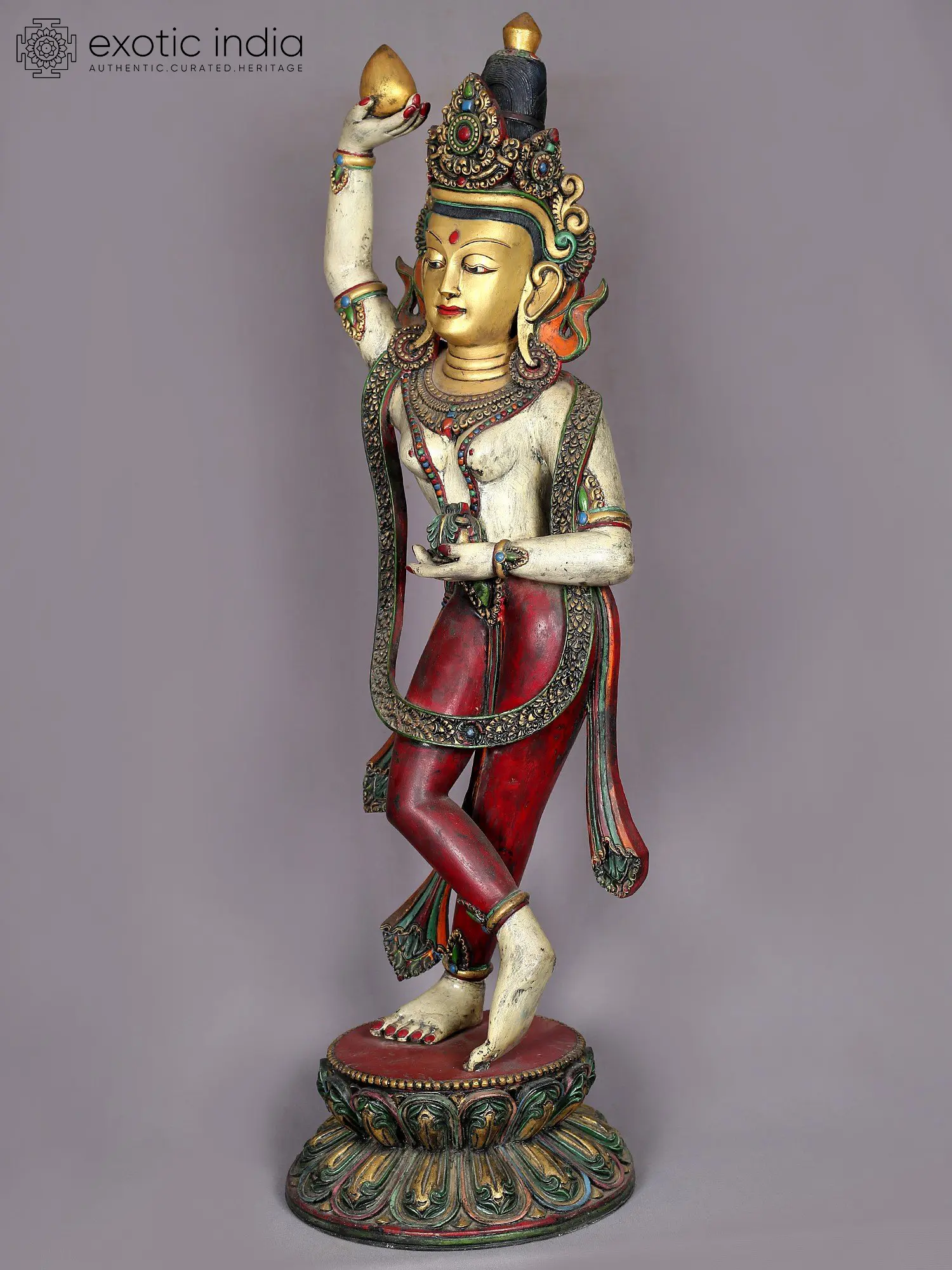 Chintamani Lokeshvara, the aspect of Bodhisattva Lokeshvara presented in this wooden Nepalese statue is a potent form of the deity, in which Avalokiteshvara becomes the manifestation of Chintamani or the wish-fulfilling jewel. On a lotus pedestal, Chintamani Lokeshvara stands in a triple-bent posture, wearing a snug red dhoti, exquisite ornaments, an adorned scarf, and a jeweled crown. In his upraised hand, Lokeshvara holds the Chintamani, and on his face, the glow of thousand jewels.