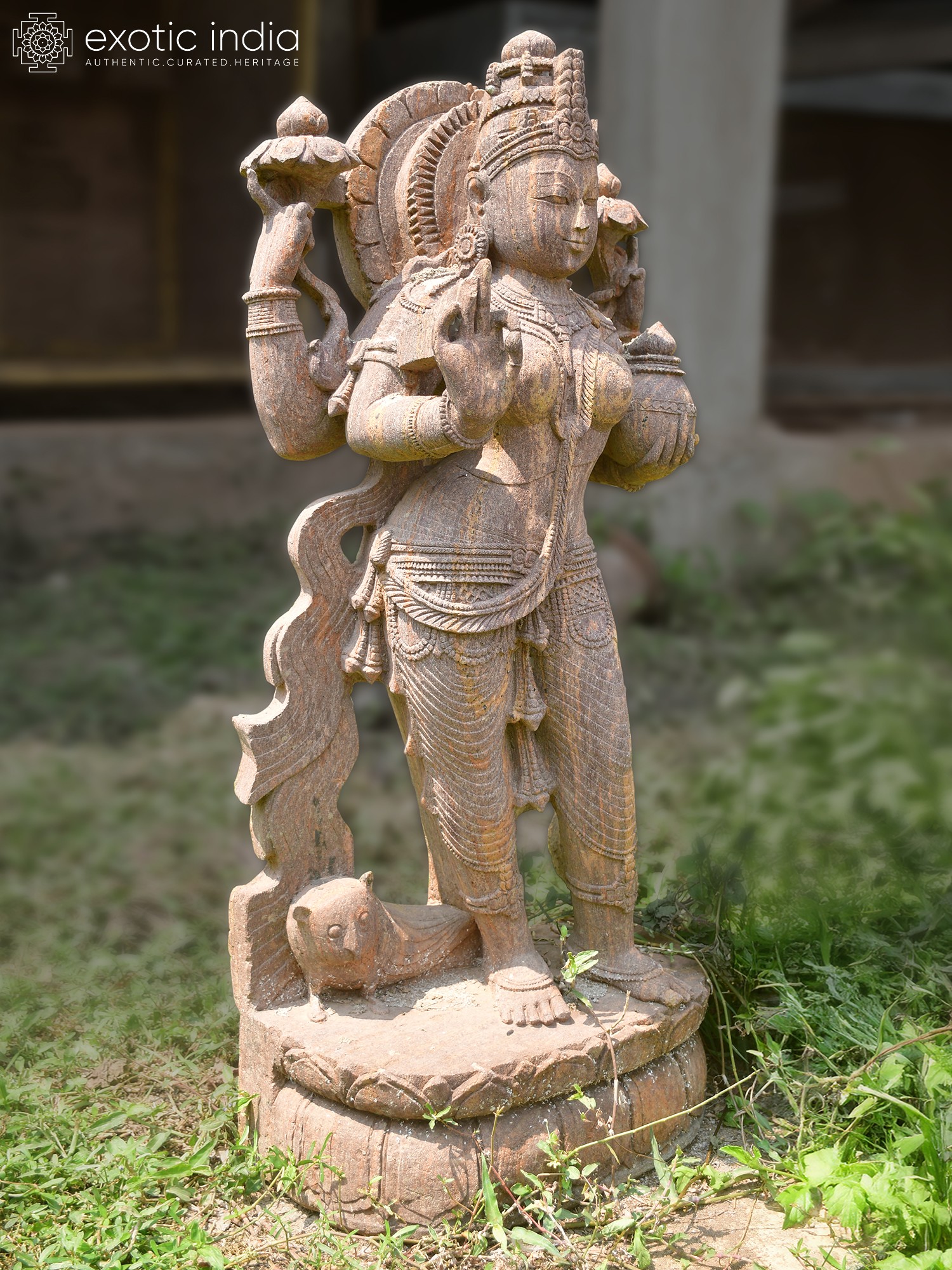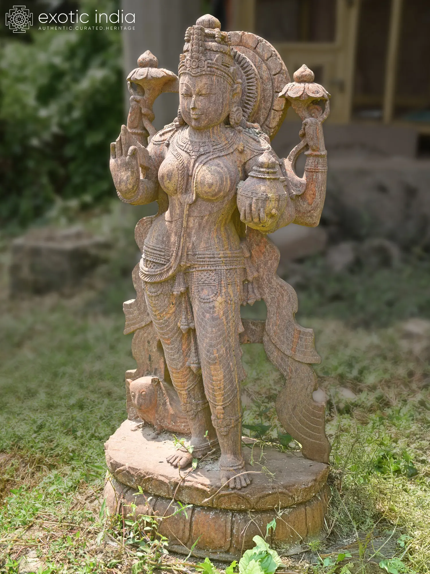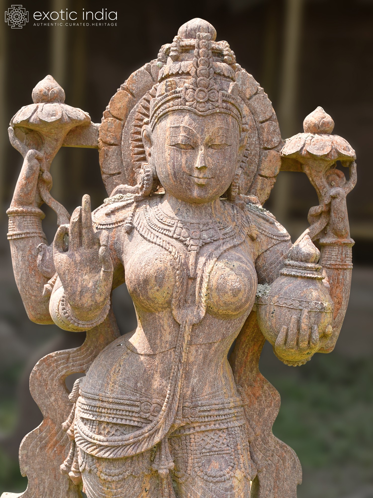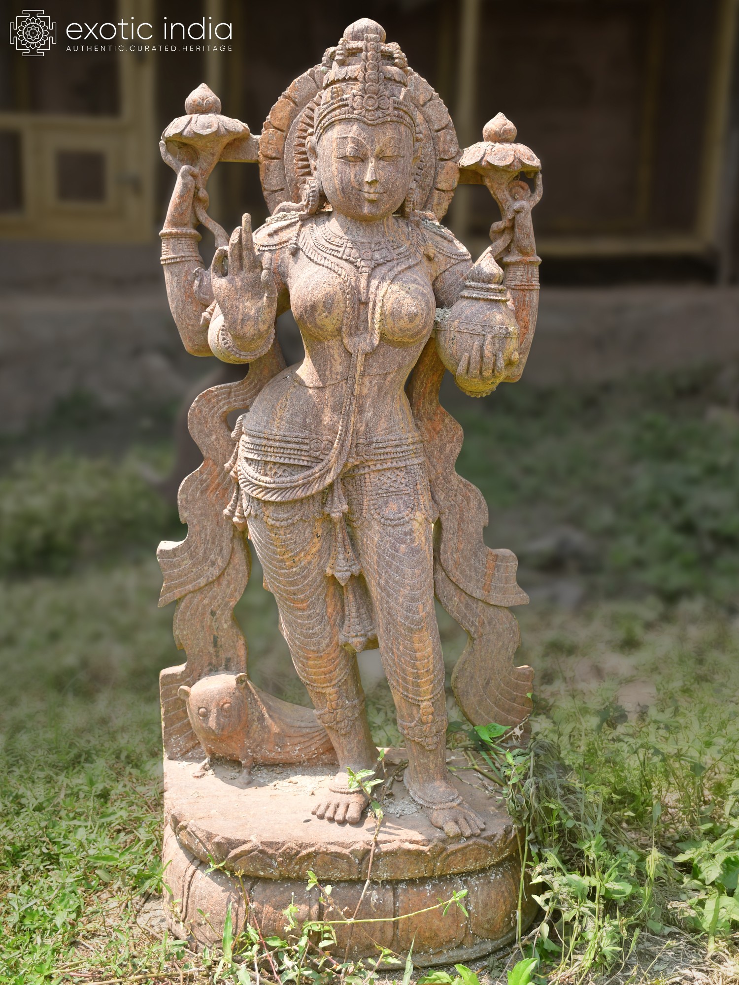 Observe the goddess holding a pot, symbolizing wealth and fertility, and a lotus, representing purity and spiritual enlightenment. Her graceful posture and the intricate adornments speak to a rich artistic heritage. The subtle textures and the rich, earthy tones of the sandstone enhance its visual appeal, promising a timeless and elegant statement piece.