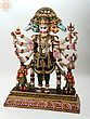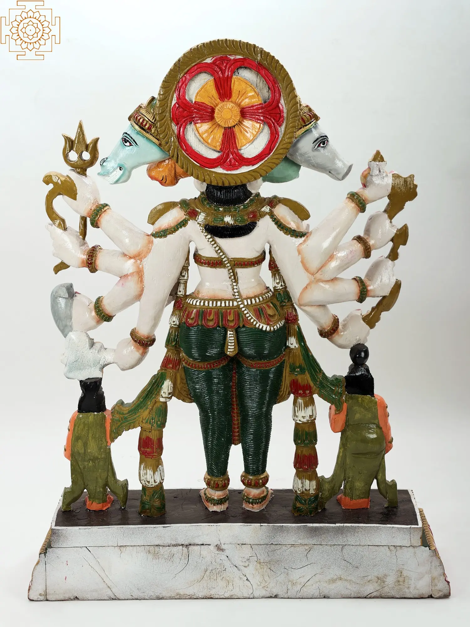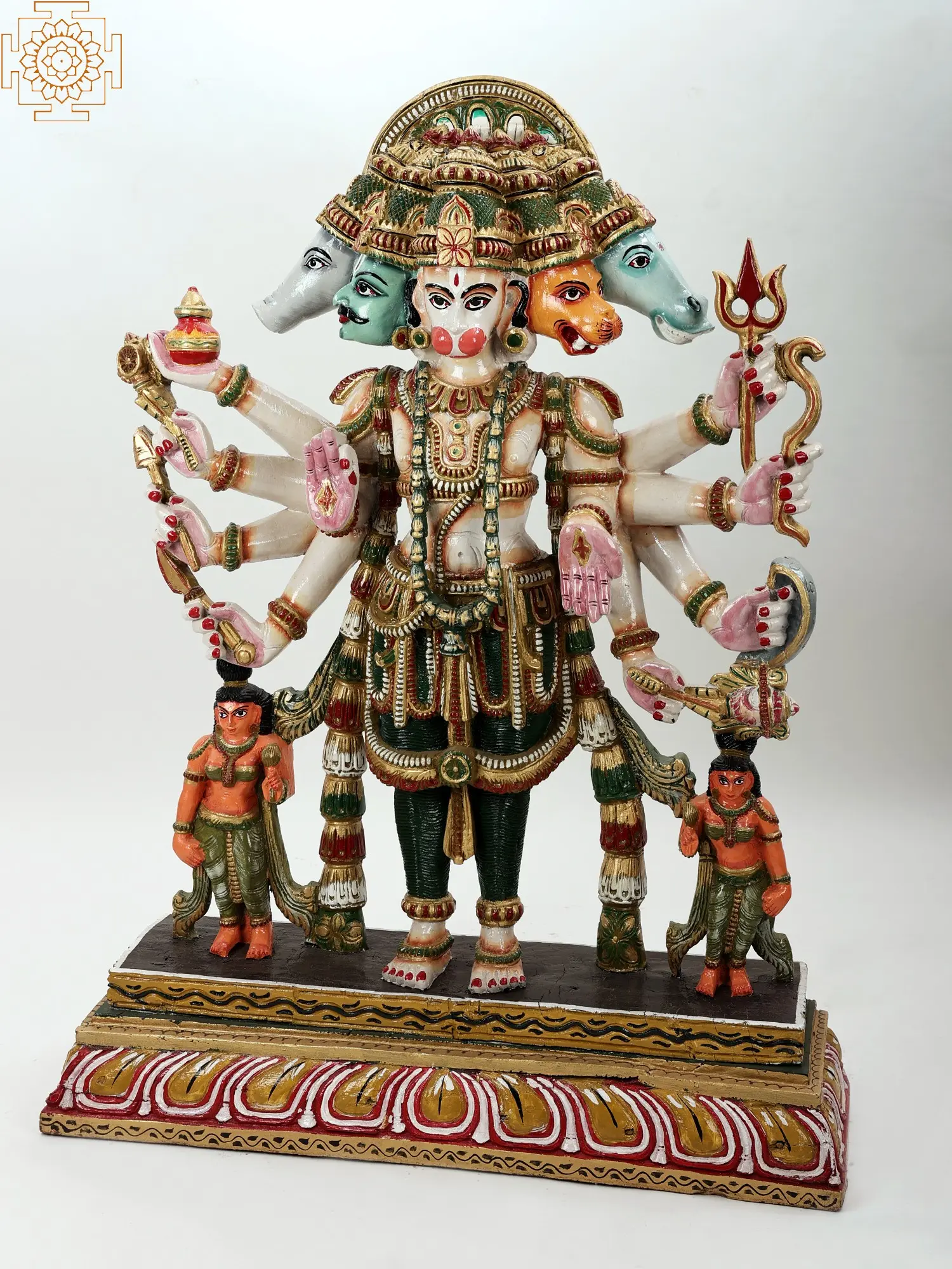 The Panchamukha on this page is possessed of eight arms (the ashtabhujadhari). The multitude of head and limb is symbolic of yogic omnipotence. He stands on a rectangular plinth with lotus petals painted along its edges. A substantial sculpture, it is fashioned from wood and painted with a vibrant palette of green, orange, pink, and blue.
