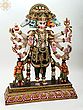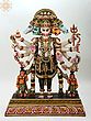 The colours are set off by the pearly complexion of Anjaneya’s face and body. The zeniths of the five crowns of the Panchamukha gather at a point, behind which is a composite halo. A great deal of detail - such as the adornments on His body and the composure of His many faces - has been introduced into the wood medium.