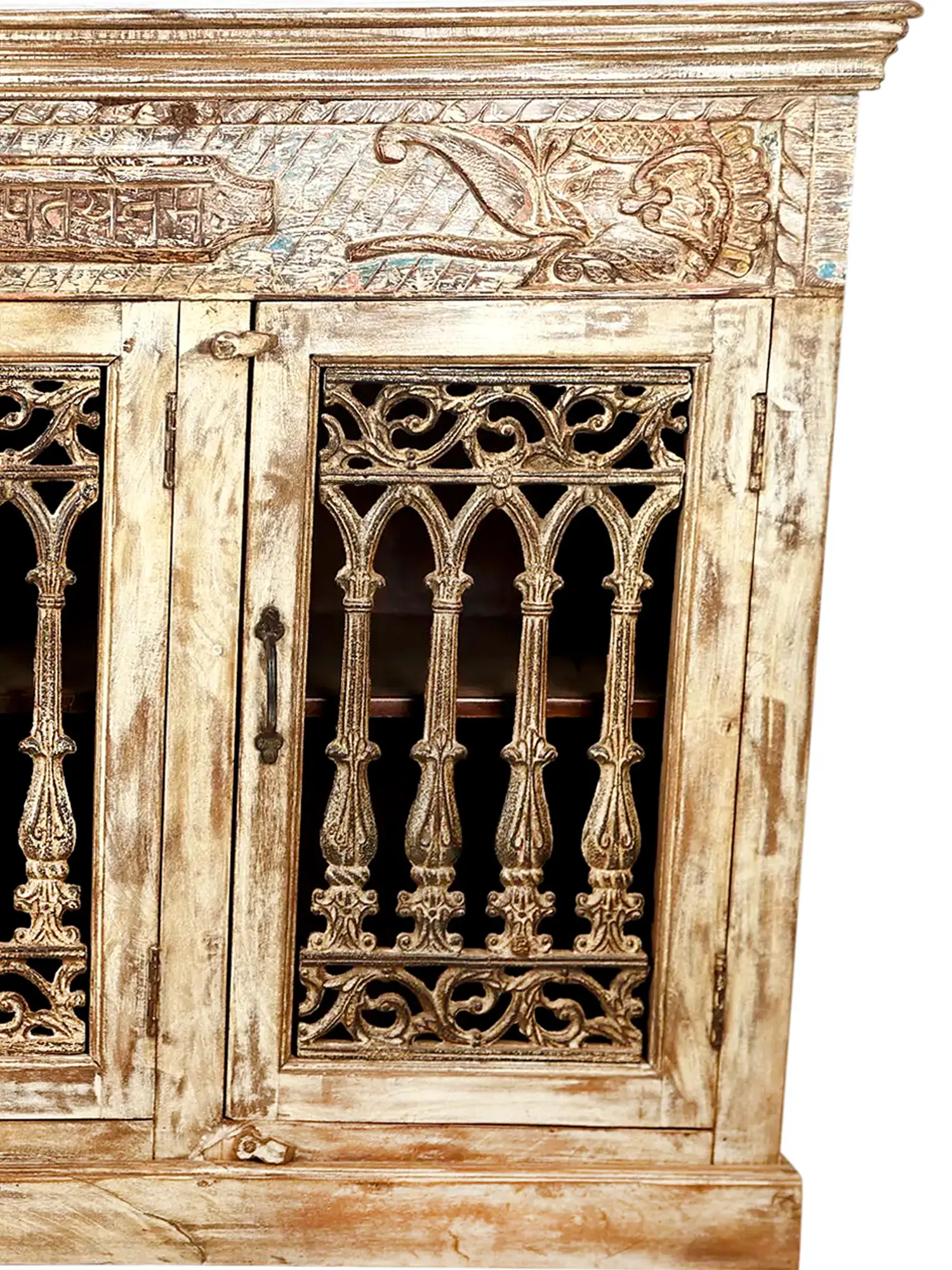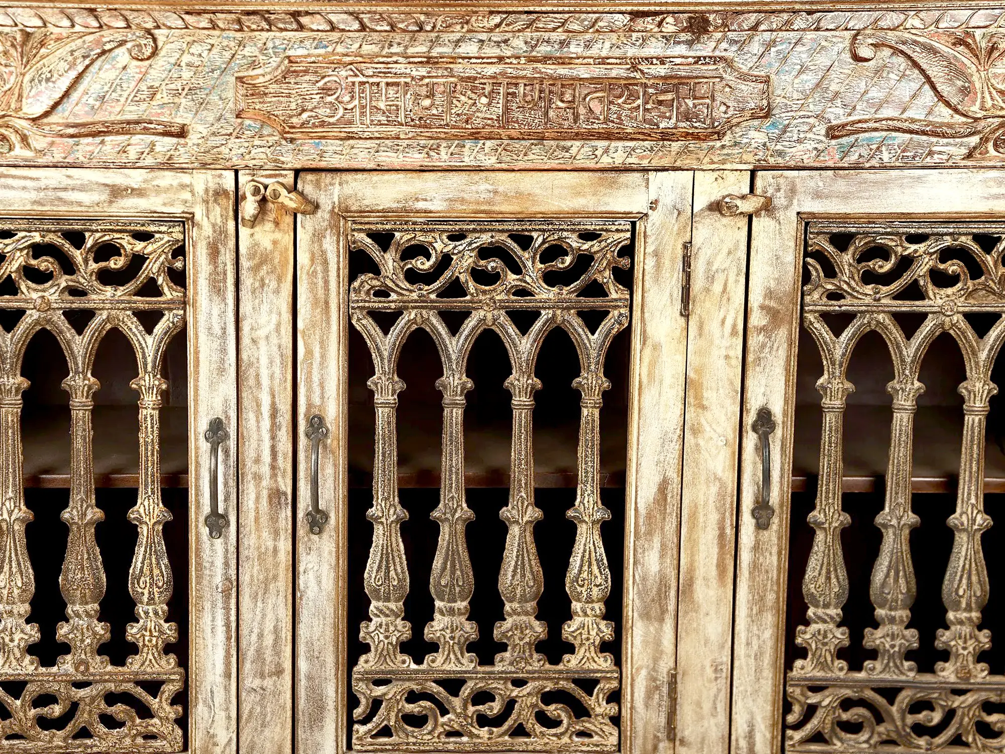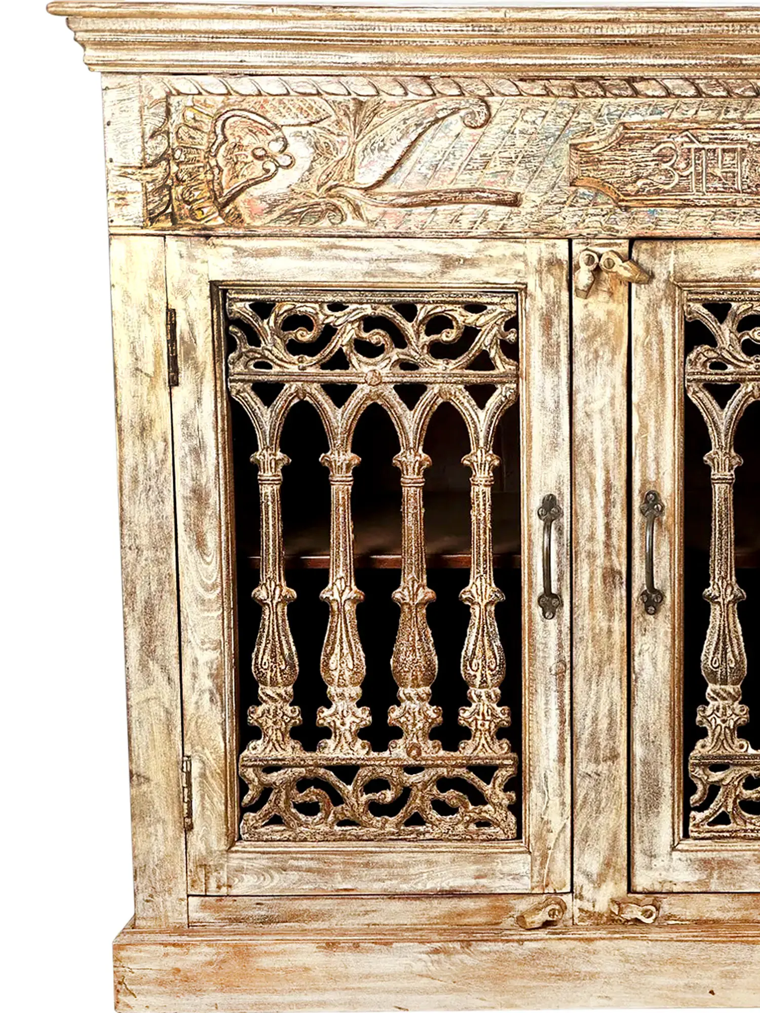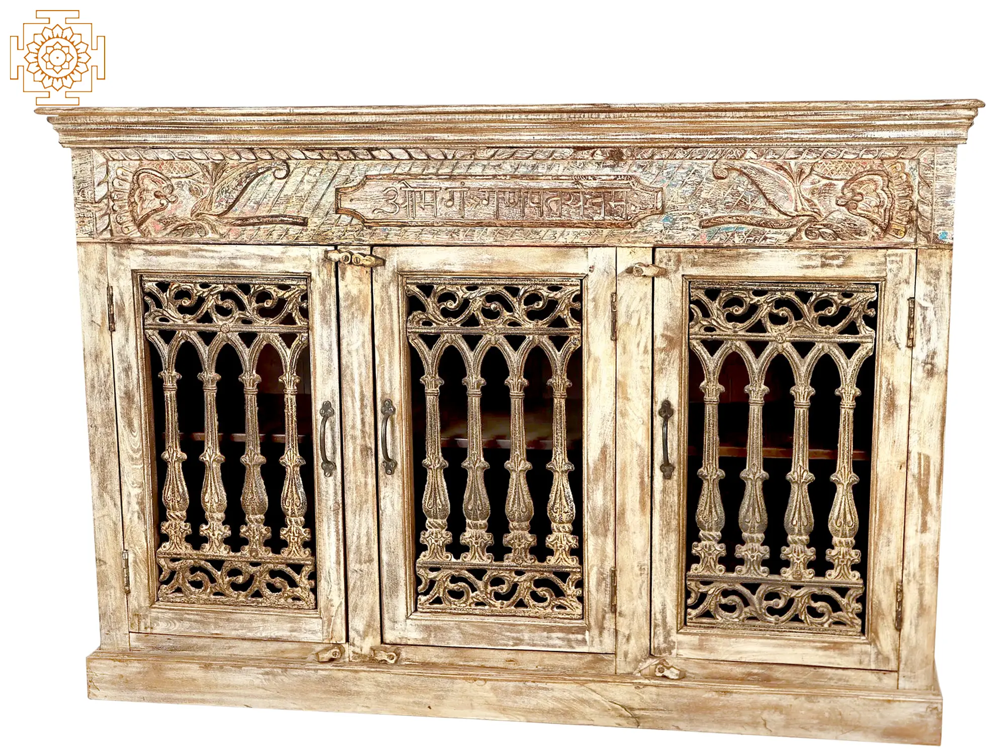 The vintage aesthetic adds character and warmth to any space, creating a unique blend of spirituality and decor. With attention to detail, and a Jharokha pattern on the doors of the cabinet, it becomes more than storage; it becomes a visual ode to tradition and artistry. This handmade creation not only enriches your surroundings but also preserves the cultural resonance of vintage craftsmanship.