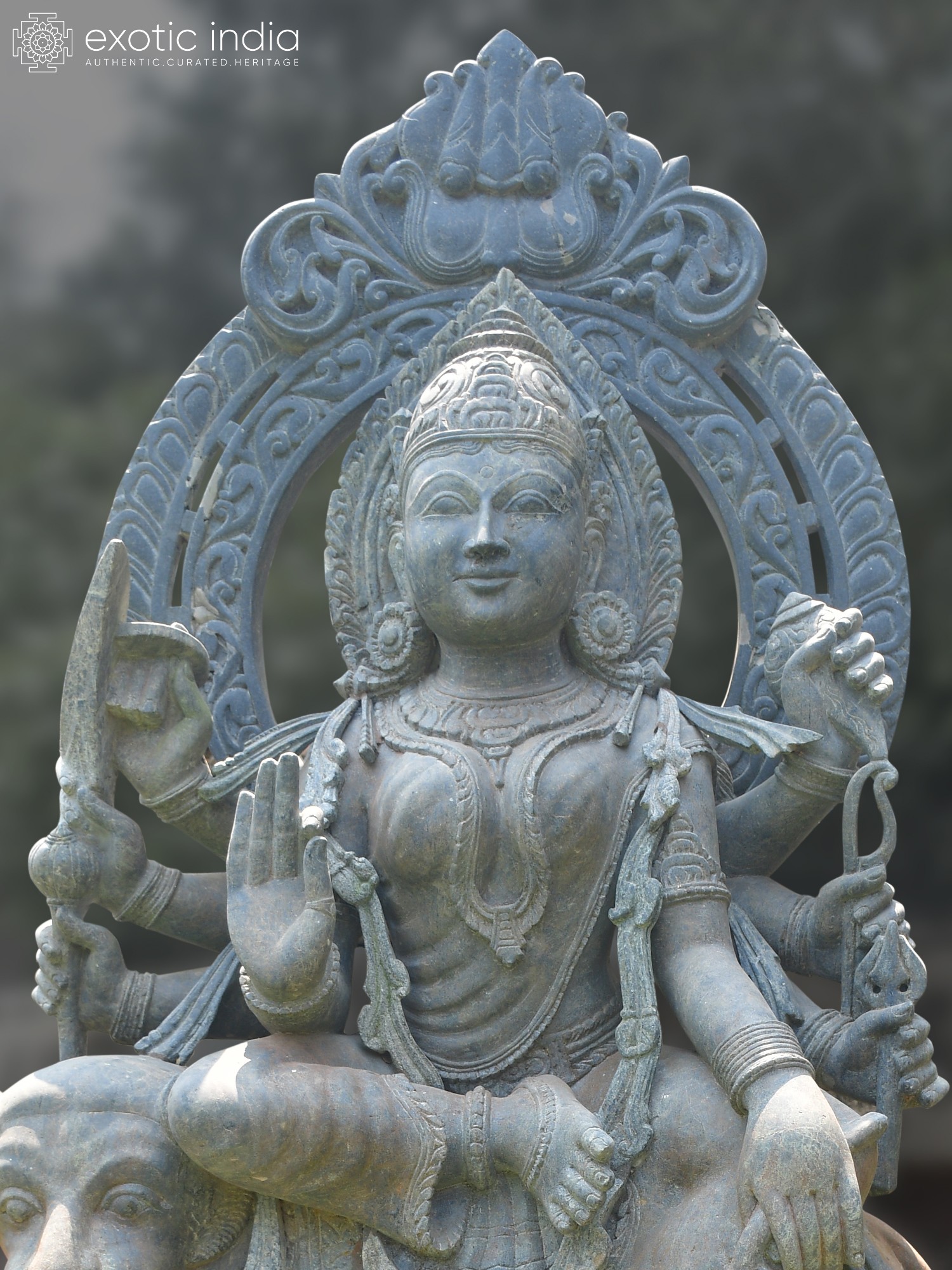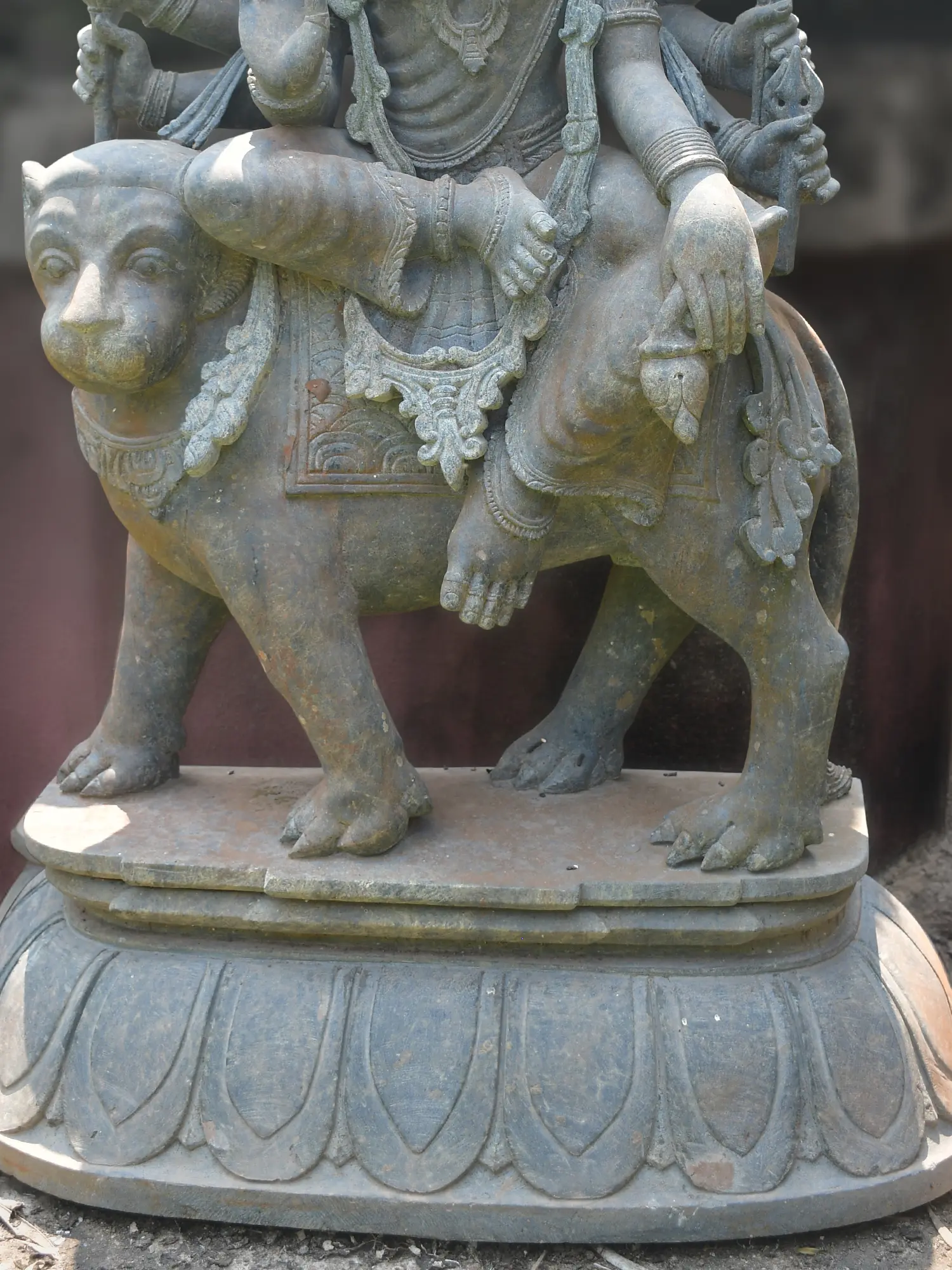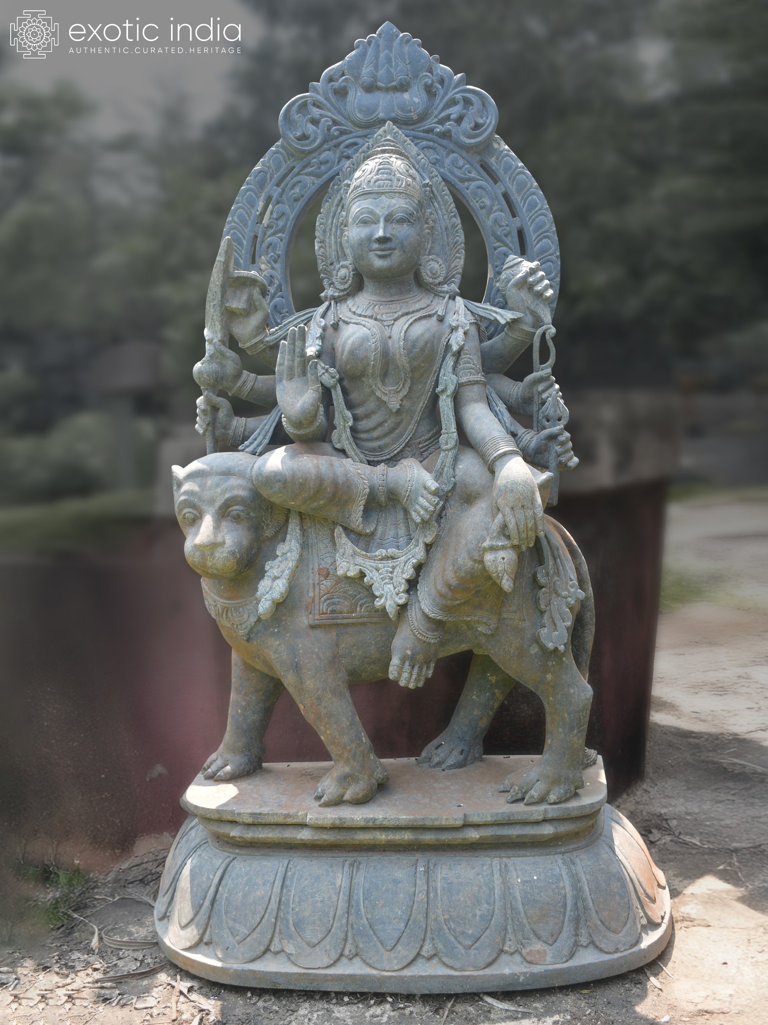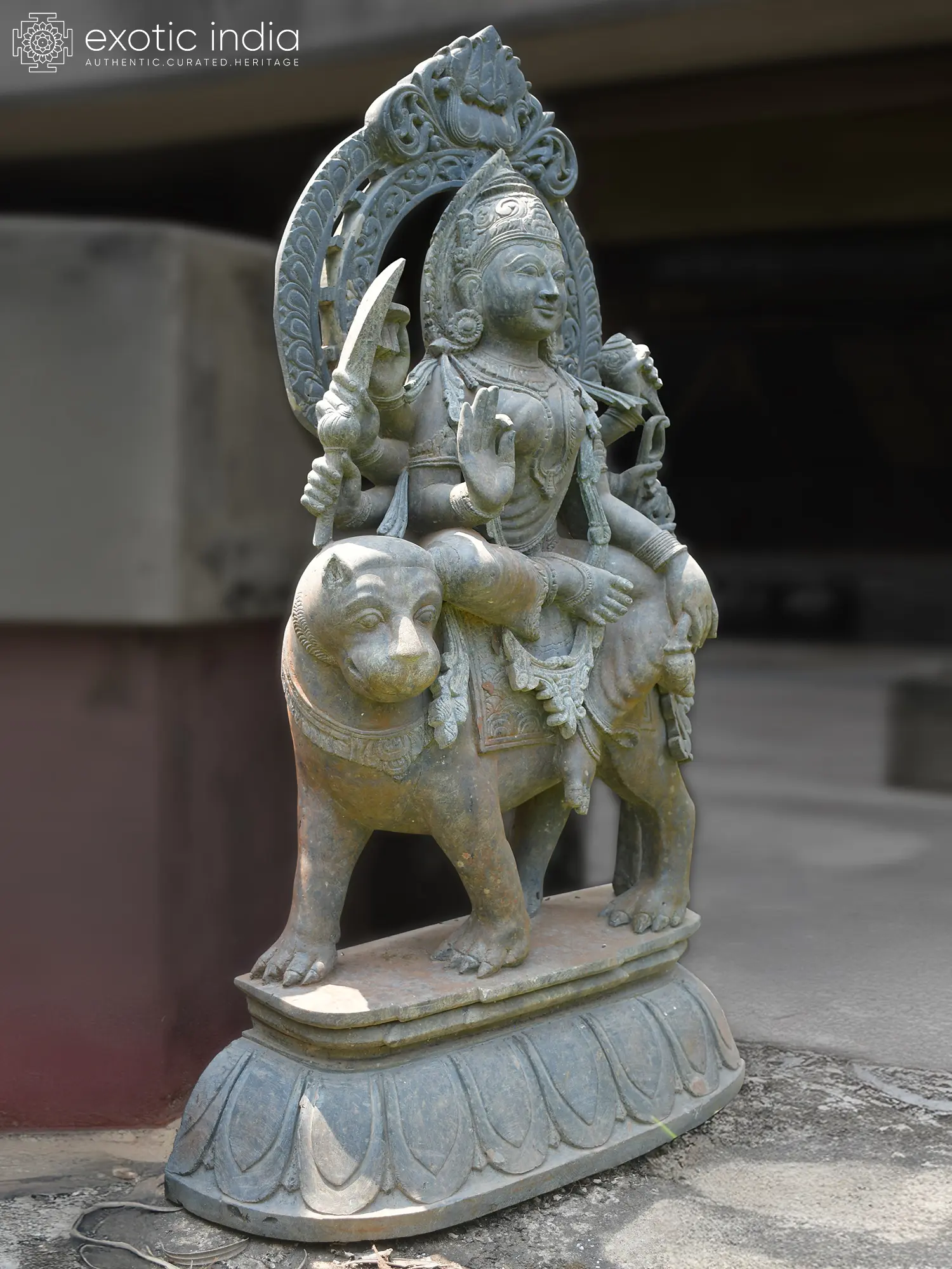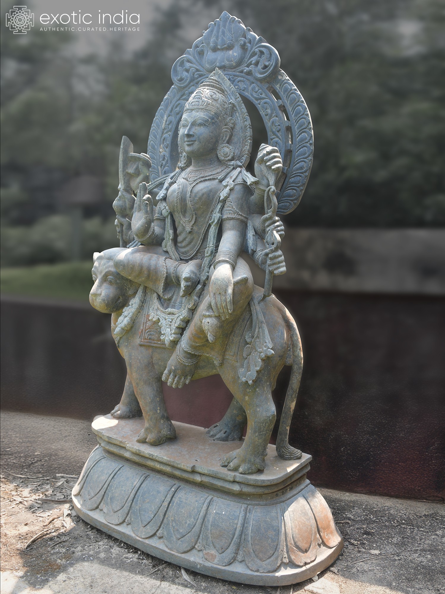 The impressive scale of this sculpture, standing tall at 42 inches, commands attention and lends an undeniable gravitas to its surroundings. The goddess is depicted in her formidable aspect, seated regally upon her vahana, the lion, exuding an air of both fierceness and grace. The multifaceted symbolism of her multiple arms, each holding a potent attribute, is rendered with exquisite clarity, inviting contemplation of her boundless power and cosmic role. The accompanying intricate archway, a marvel of stone latticework, frames her divine visage, enhancing the overall grandeur.