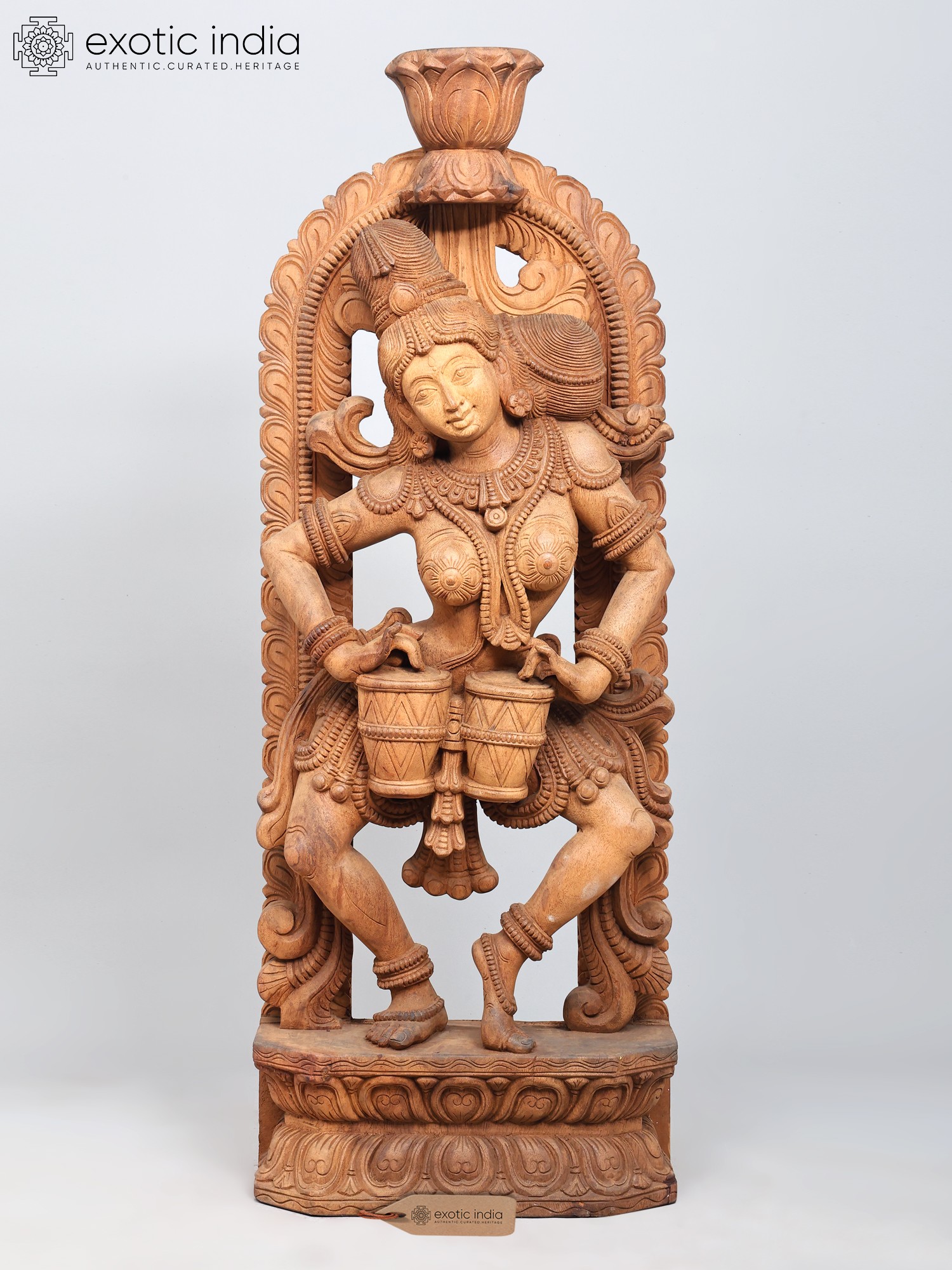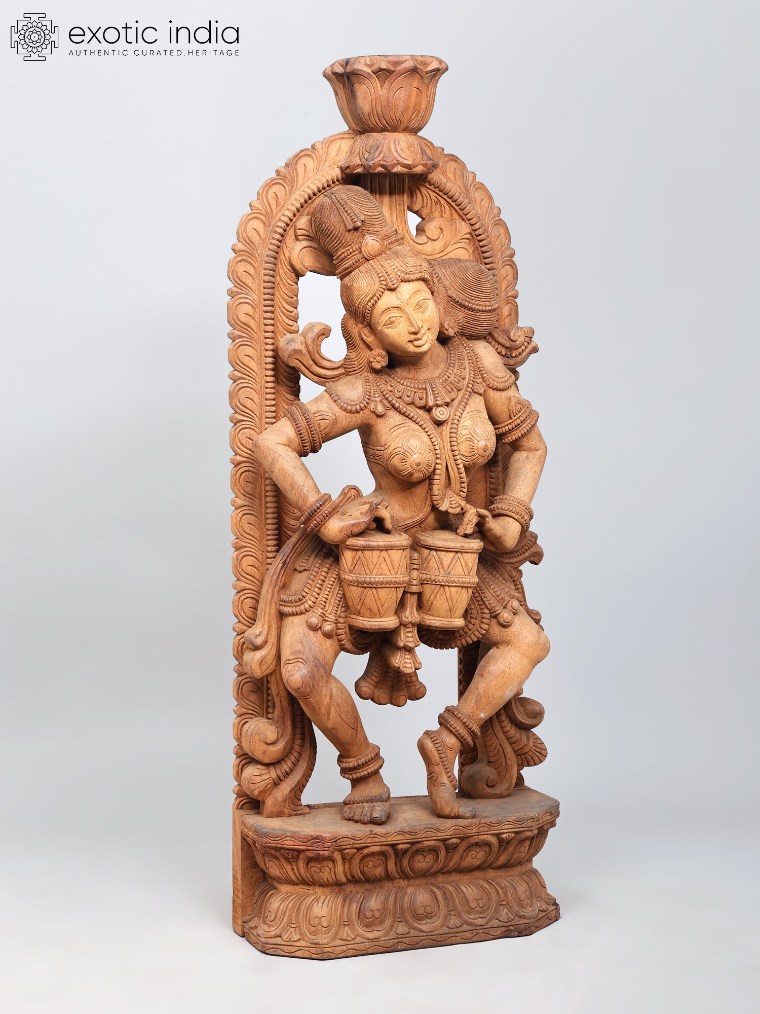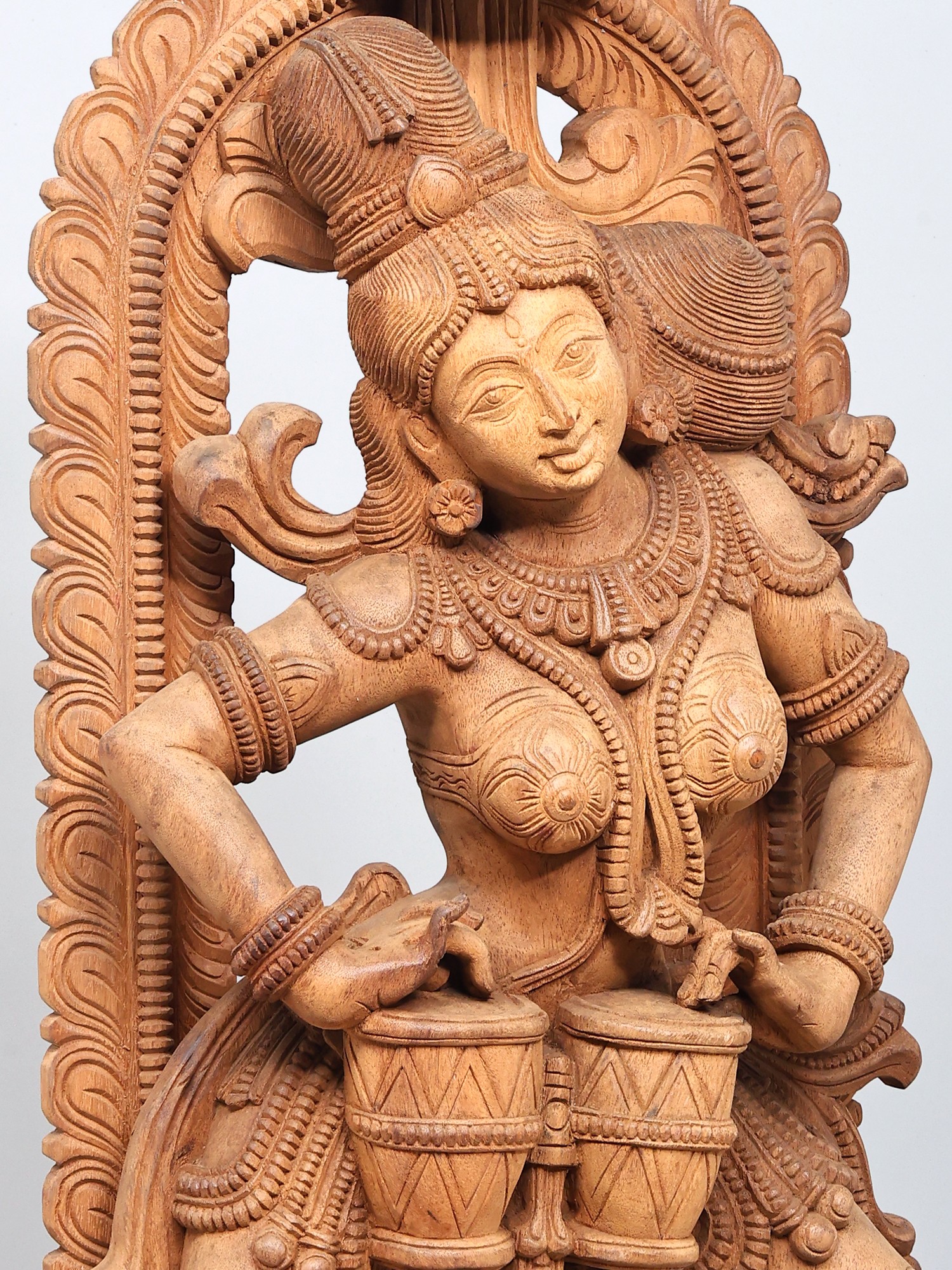 The wooden Apsara playing the drums is carved in a rounded manner, surrounded by a floral aureole whose centerpiece is a blossoming lotus or Padma, the symbol of eternal beauty and purity. The Apsara has her hair tied in an elaborate updo, adorned with chains of jewels and a tiara. A few curls of her hair frame her forehead pleasingly on which is a small Bindi (dot).