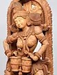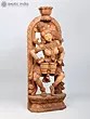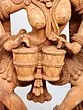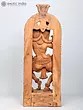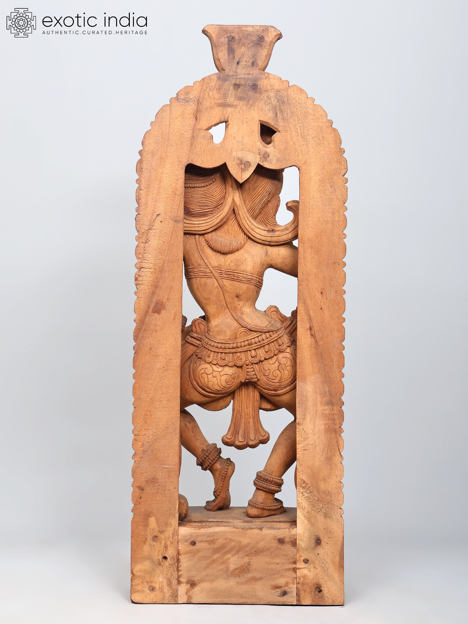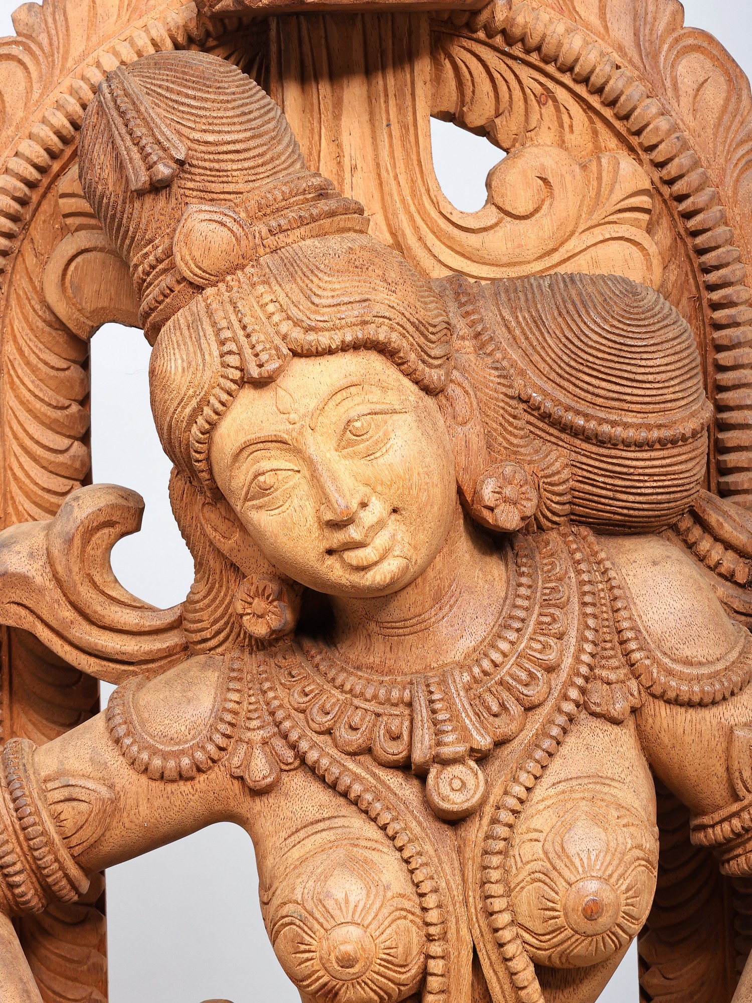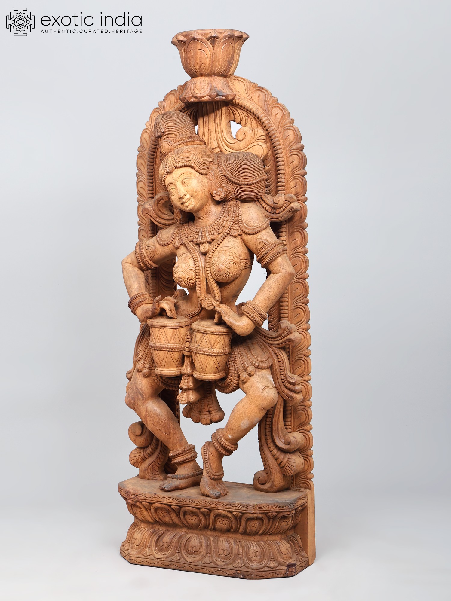 The wooden Apsara playing the drums is carved in a rounded manner, surrounded by a floral aureole whose centerpiece is a blossoming lotus or Padma, the symbol of eternal beauty and purity. The Apsara has her hair tied in an elaborate updo, adorned with chains of jewels and a tiara. A few curls of her hair frame her forehead pleasingly on which is a small Bindi (dot).