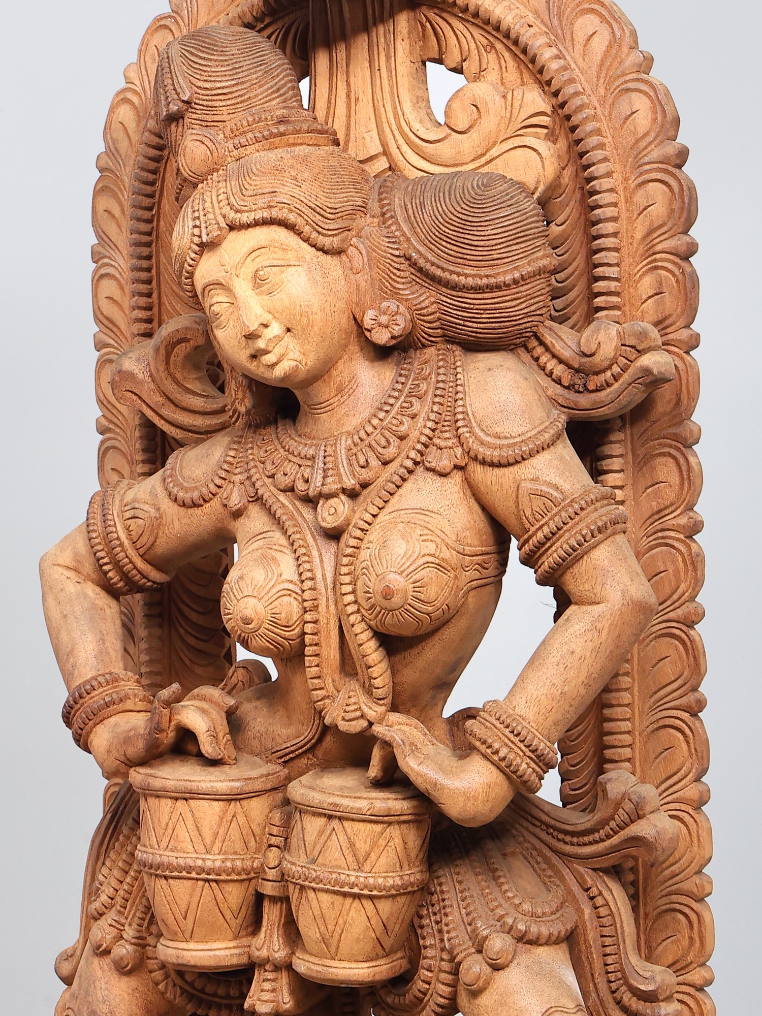 Arched eyebrows, large eyes, and fuller lips bring an exquisite youthfulness to the wooden Apsara idol. Intricately carved ornaments such as necklaces, armbands, breast ornaments, bangles, girdles, and anklets are employed in the beautification of the celestial maiden. Her hands delicately handle the drum, which is supported by her thighs as she strikes a dynamic posture.