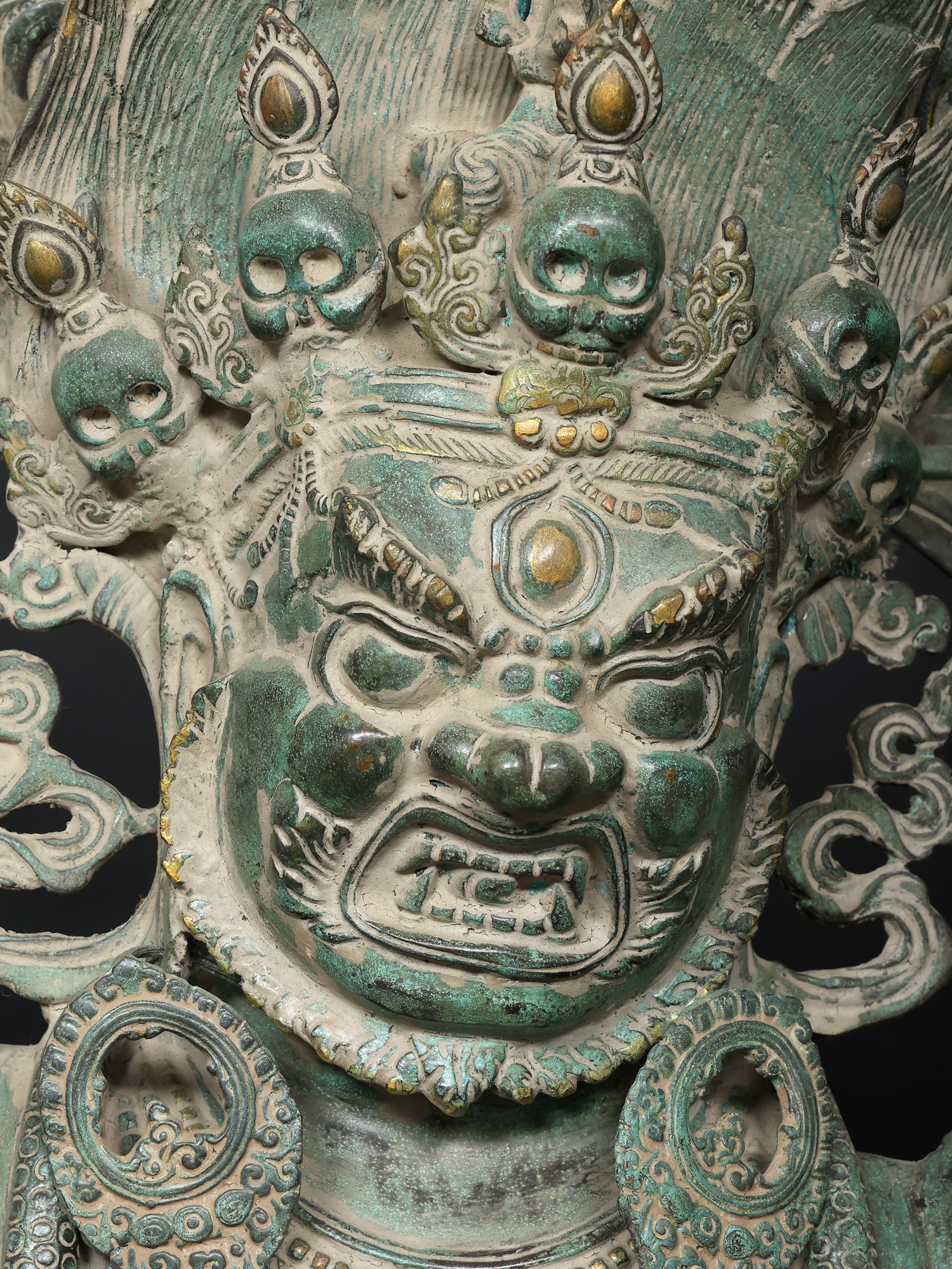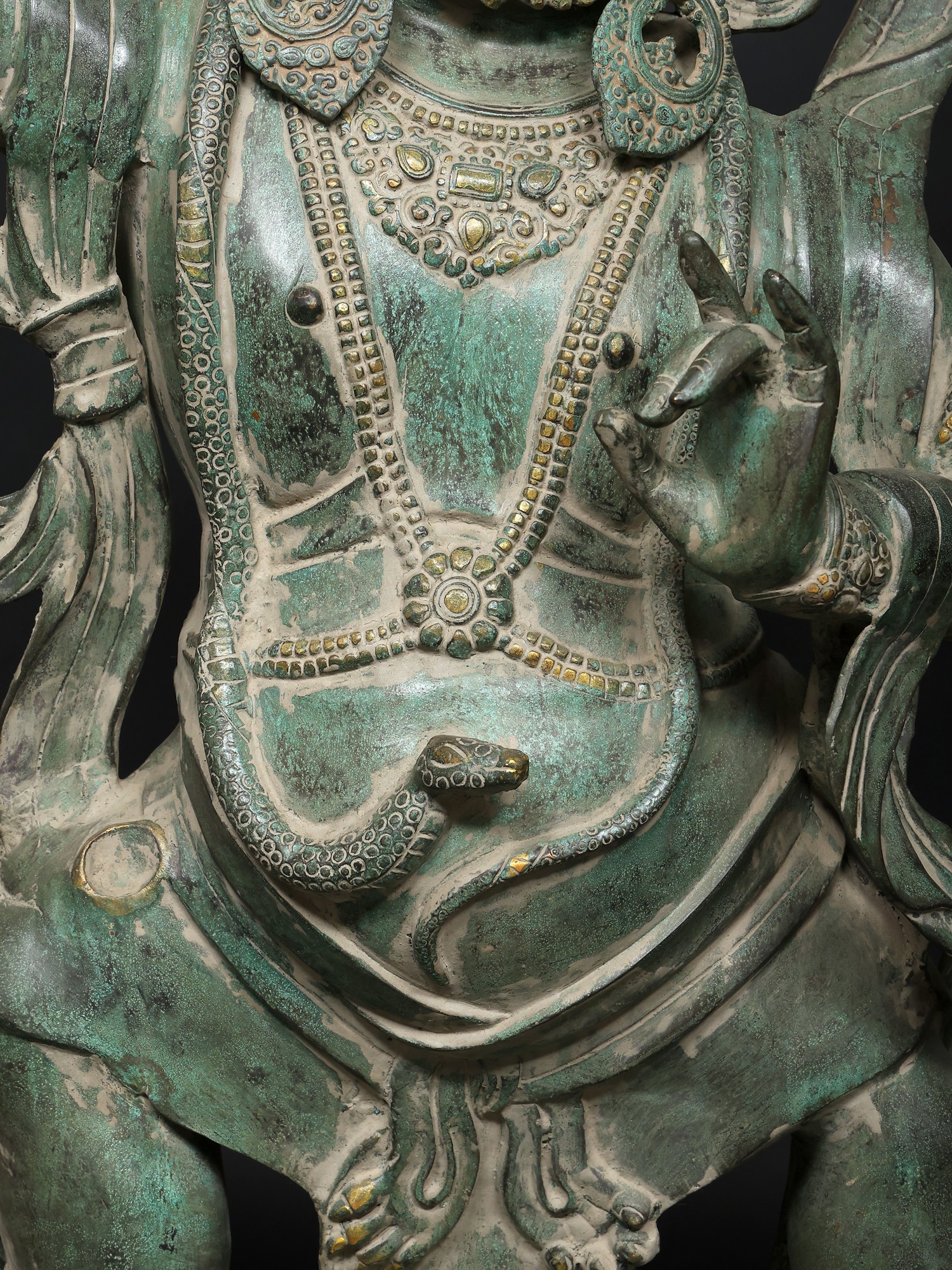 Vajrapani, whose name translates to "Thunderbolt in Hand," is one of the earliest bodhisattvas in Mahayana Buddhism. He is known as the protector and guide of the Buddha, symbolizing the power aspect of enlightenment. He represents the energy of the enlightened mind, capable of cutting through delusion and negativity with unwavering force. He is often depicted in a wrathful form to demonstrate his ability to subdue negative energies and protect practitioners from harm. The "vajra," or thunderbolt, that he wields is not merely a weapon but a symbolic representation of the indestructible nature of wisdom and compassion. It signifies the union of emptiness and form, the ultimate reality that lies beyond duality. The flames that encircle him represent the transformative power of wisdom, burning away ignorance and attachment. The ornaments that adorn the figure are not mere decoration but are filled with profound symbolism. Each piece represents aspects of enlightened qualities and the bodhisattva's commitment to liberating all beings. The skull ornaments, often found on wrathful deities, represent the impermanence of life and the need to break free from attachment to the ego. The intricate details speak to the artistic skill and the deep understanding of Buddhist principles that went into its creation.
