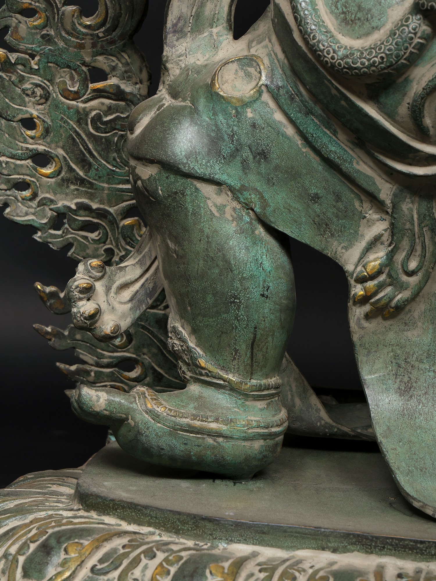 This remarkable representation is crafted from brass. The substantial weight and careful detailing give it a tangible presence, making it a striking addition to any sacred space. The patina and finish add to its aura, evoking a sense of age and authenticity. Owning this representation is not just possessing a beautiful object; it is connecting with a lineage of spiritual practice and embracing the protective energy of Vajrapani. This is more than an ornamental display piece. It is an opportunity to cultivate inner strength, overcome obstacles, and deepen your understanding of Buddhist teachings. This representation serves as a constant reminder of the power of wisdom, compassion, and the unwavering determination to achieve enlightenment for the benefit of all. Allow this depiction of the protector bodhisattva to inspire courage and resolve on your spiritual journey, and to bring a sense of peace and protection into your home.