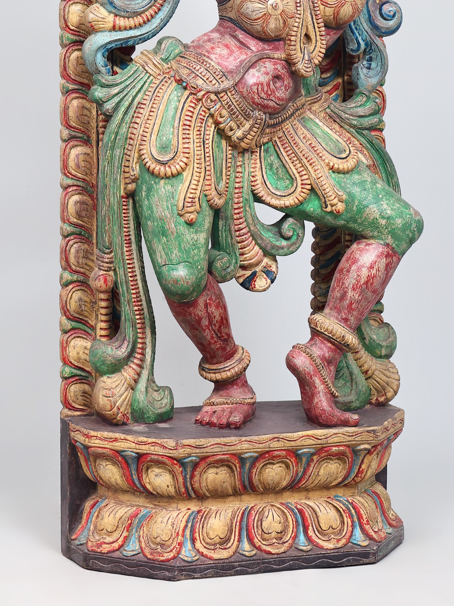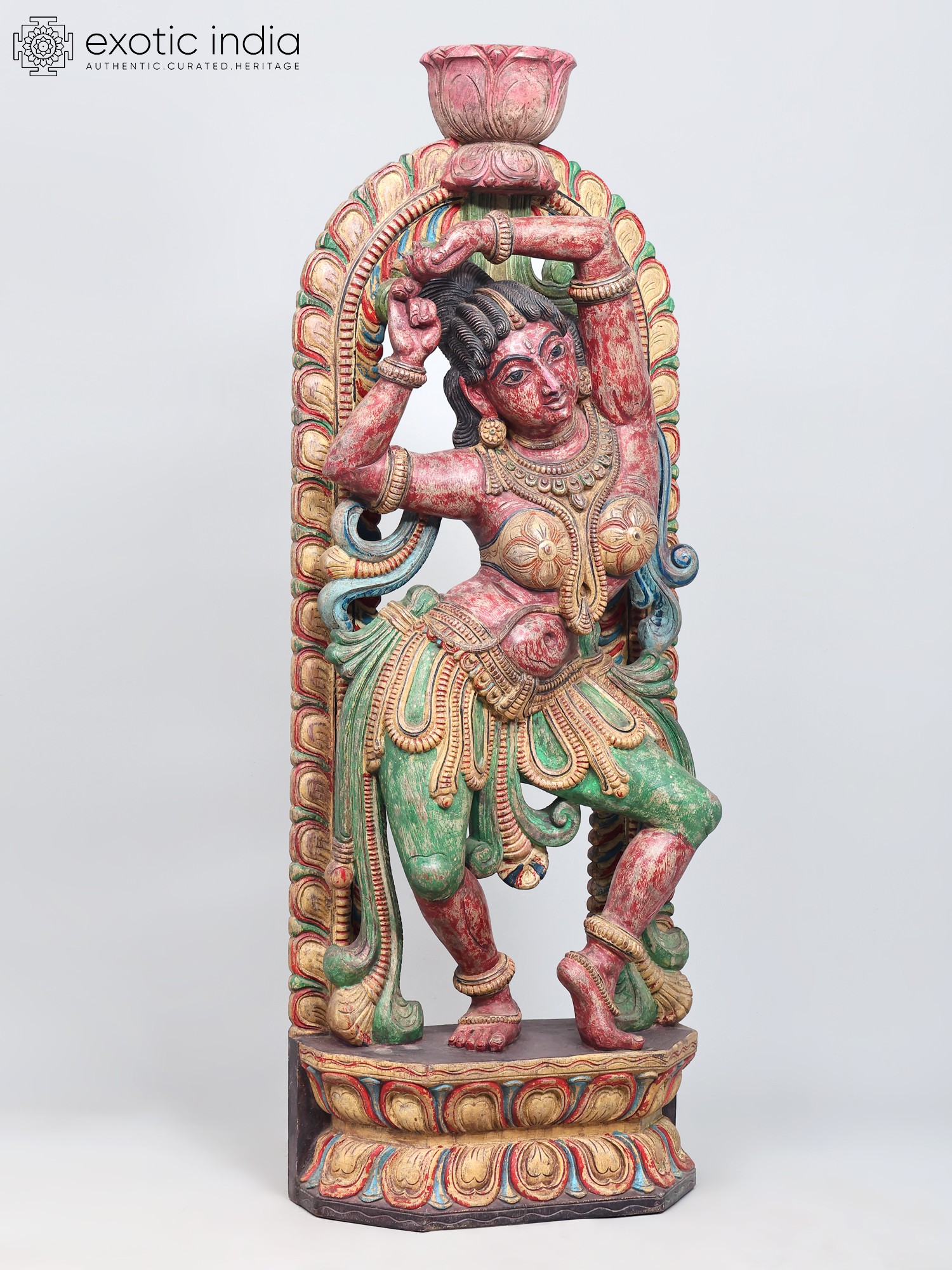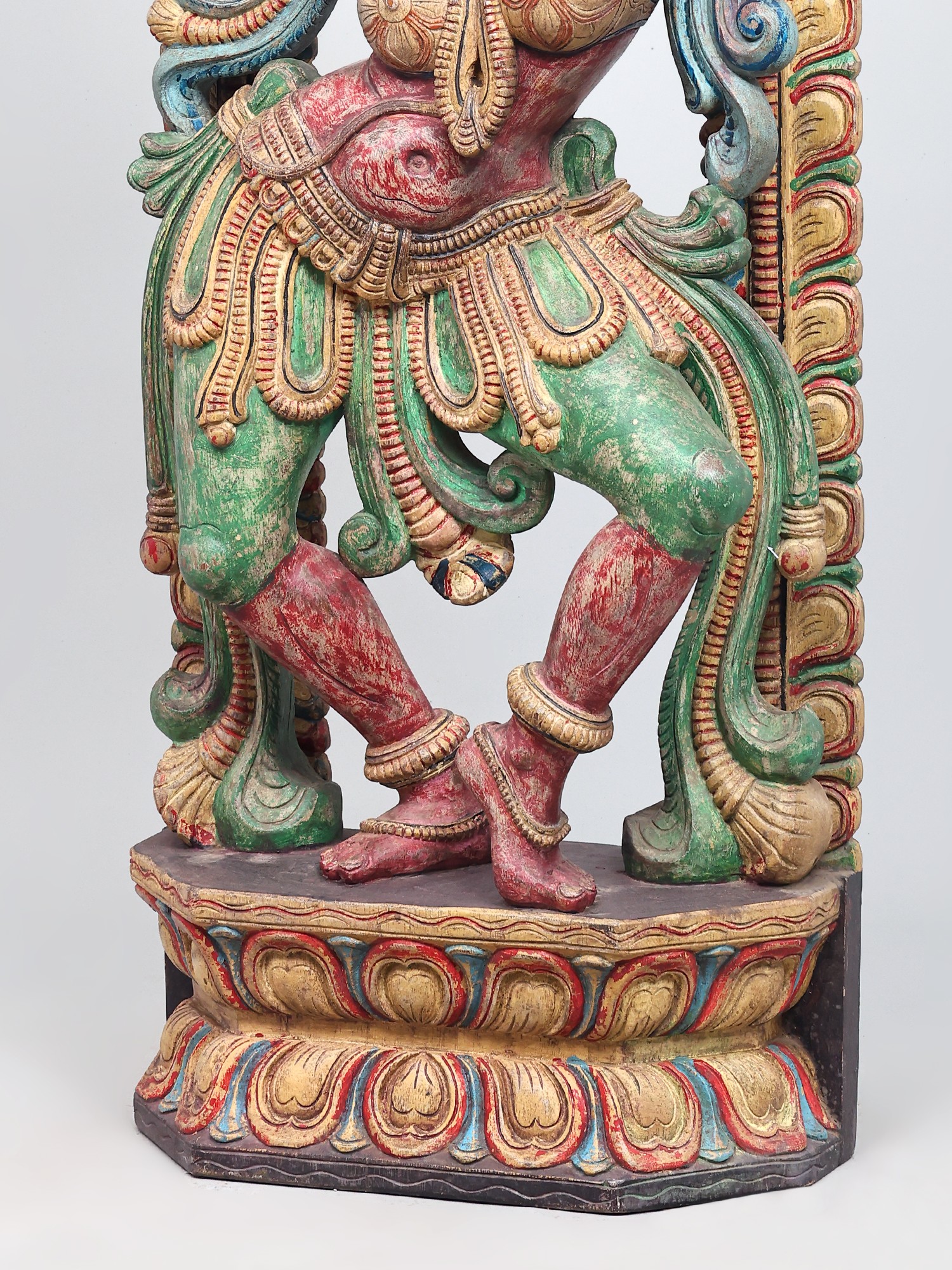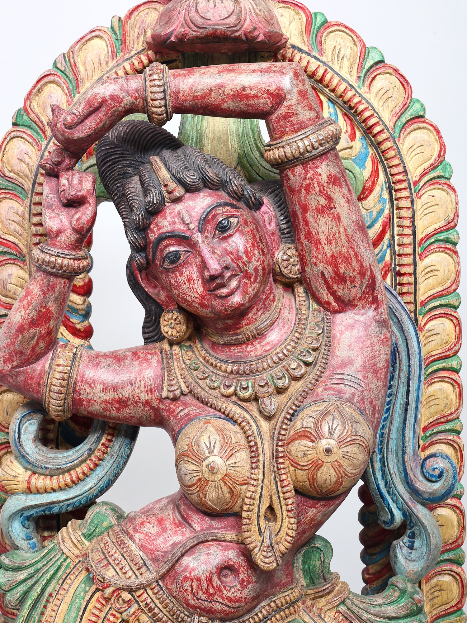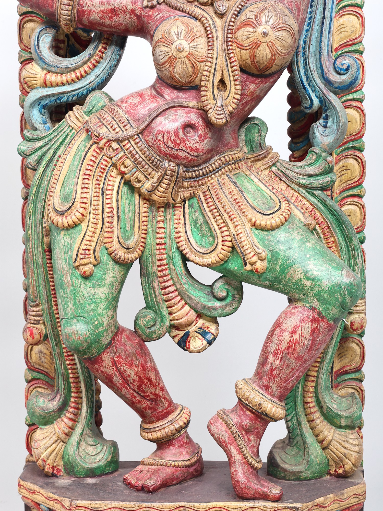 The vibrant colors adorning the sculpture—rich reds, verdant greens, and golden yellows—are not merely decorative but imbue the piece with energy and emotion. These hues often carry symbolic meanings in their cultural contexts, perhaps representing passion, prosperity, or divine radiance. The weathered patina suggests a history, a journey, and an authenticity that adds to its allure. Each curve of the dancer's body, each fold of her attire, has been painstakingly rendered, inviting the viewer to trace the story held within the wood. This is more than just a decorative object; it's a narrative captured in three dimensions, a testament to the enduring power of art to convey stories, emotions, and cultural heritage.