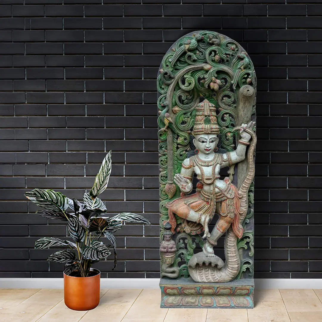 26" Lord Krishna Dancing on Kaliya Naag | Wood Carving