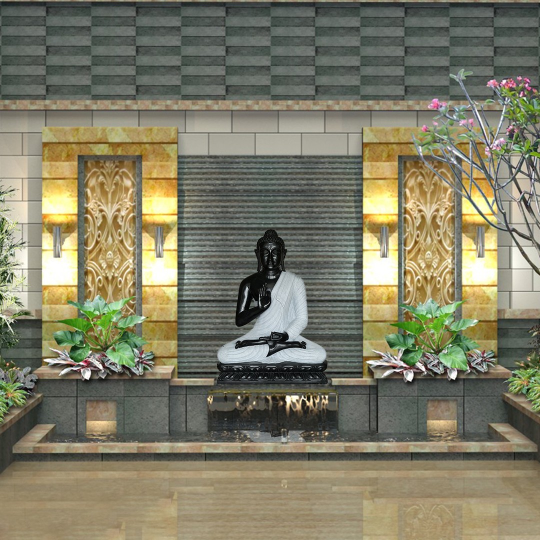 The eternal, great teacher in this amazing large black marble Buddha idol reiterates the exalted Buddhist ideals of achieving the highest states of human existence and subsequently attaining Nirvana. With his right hand in the teaching or “Vitarka” mudra, Buddha in this black marble statue disseminates the pearls of his wisdom to his followers, while his left hand in the “dhyana” mudra highlights the importance of taking a journey to one’s own consciousness, through meditation. A balance of Buddha’s teachings and introspection is the key to achieving Enlightenment.