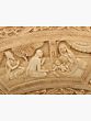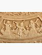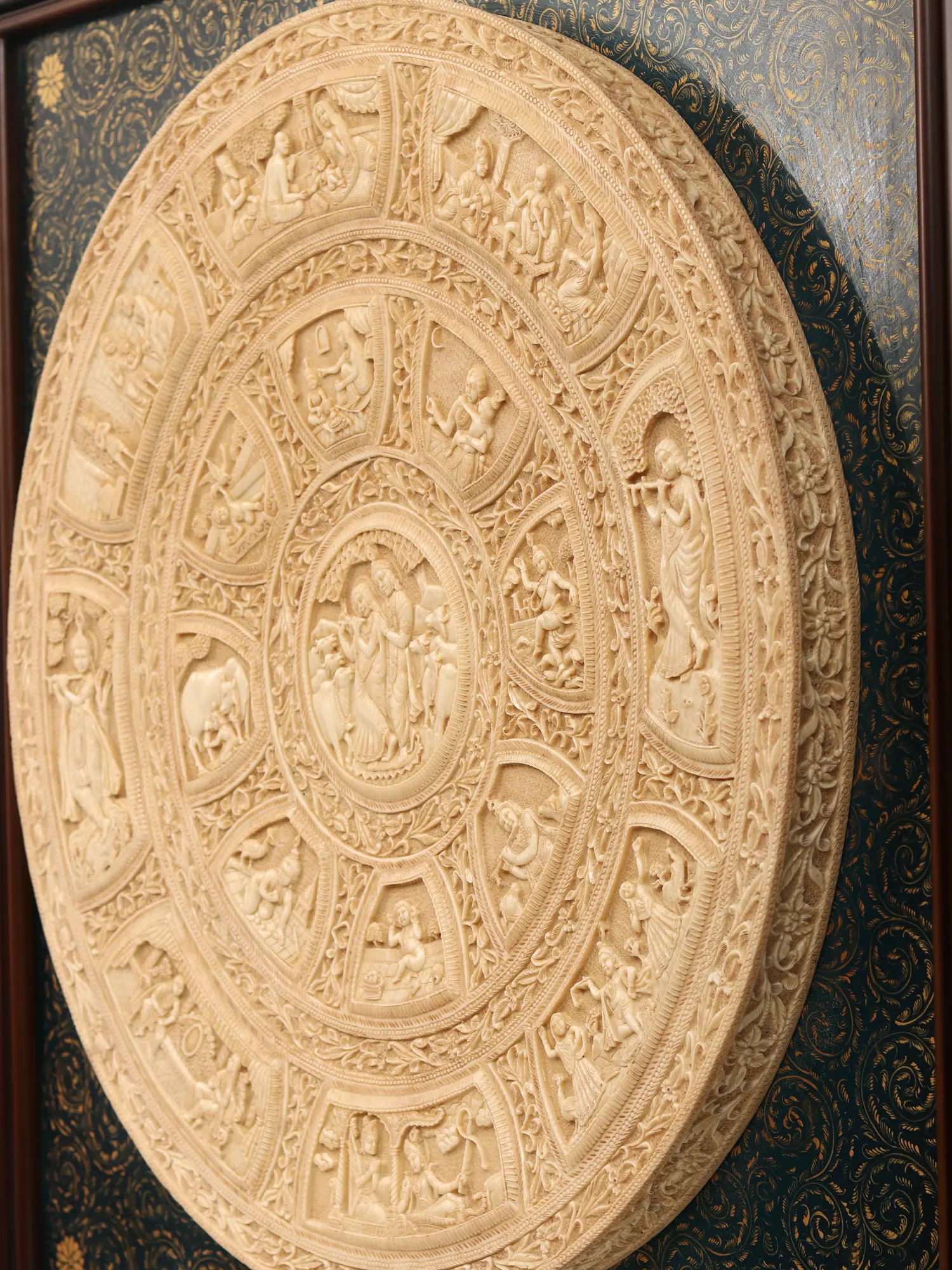 This exquisite 42" x 42" wall hanging is a captivating journey through the life of Lord Krishna, a central figure in Hinduism. The circular bas-relief, crafted from a blend of rich wood and resin, showcases key moments from his vibrant and multifaceted existence. Each meticulously carved scene unfolds like a page in a sacred text, inviting contemplation and appreciation for the artistry and spiritual significance within. The warm tones of the wood and resin create a timeless elegance, seamlessly integrating with a variety of interior design styles, from traditional to contemporary.