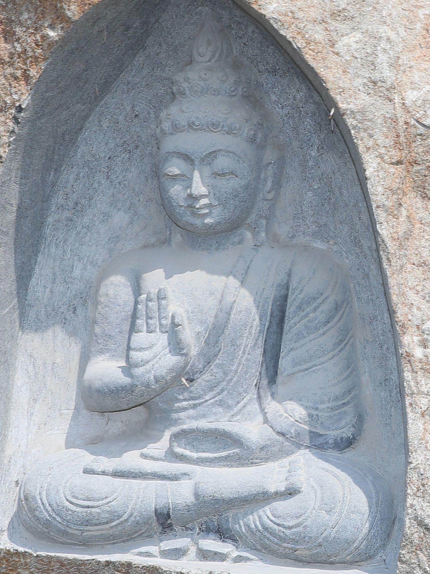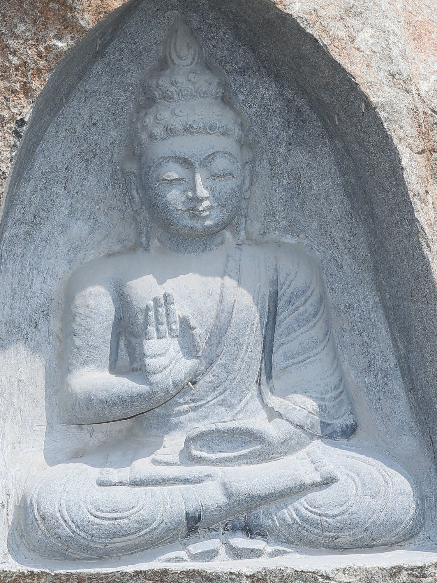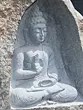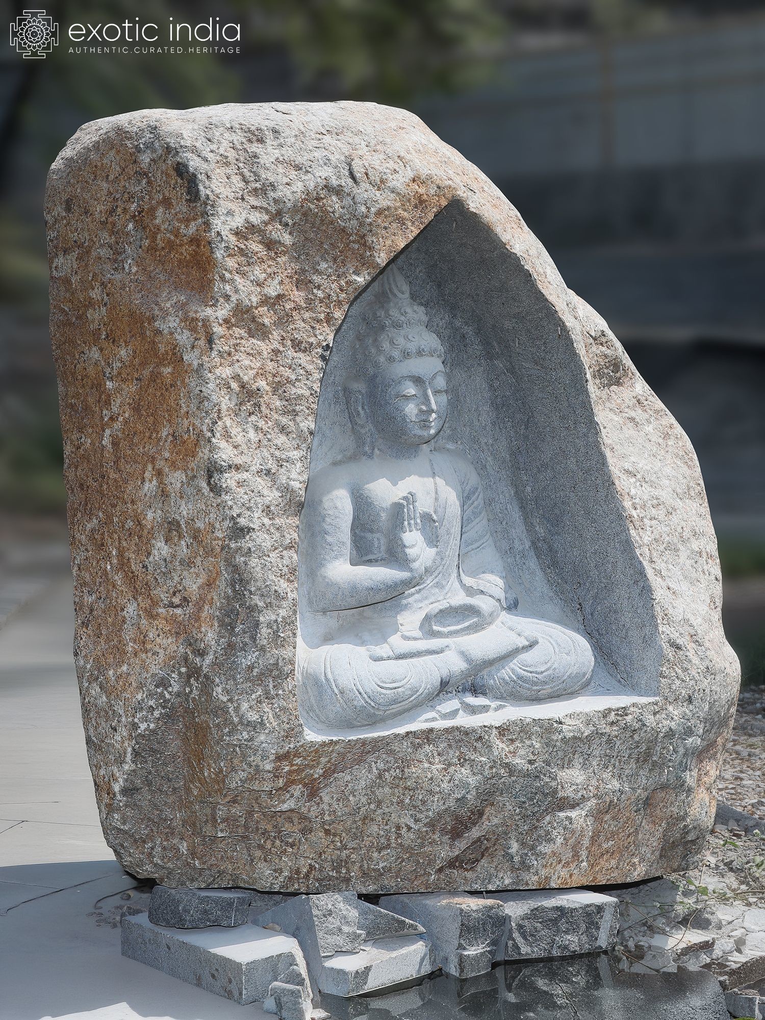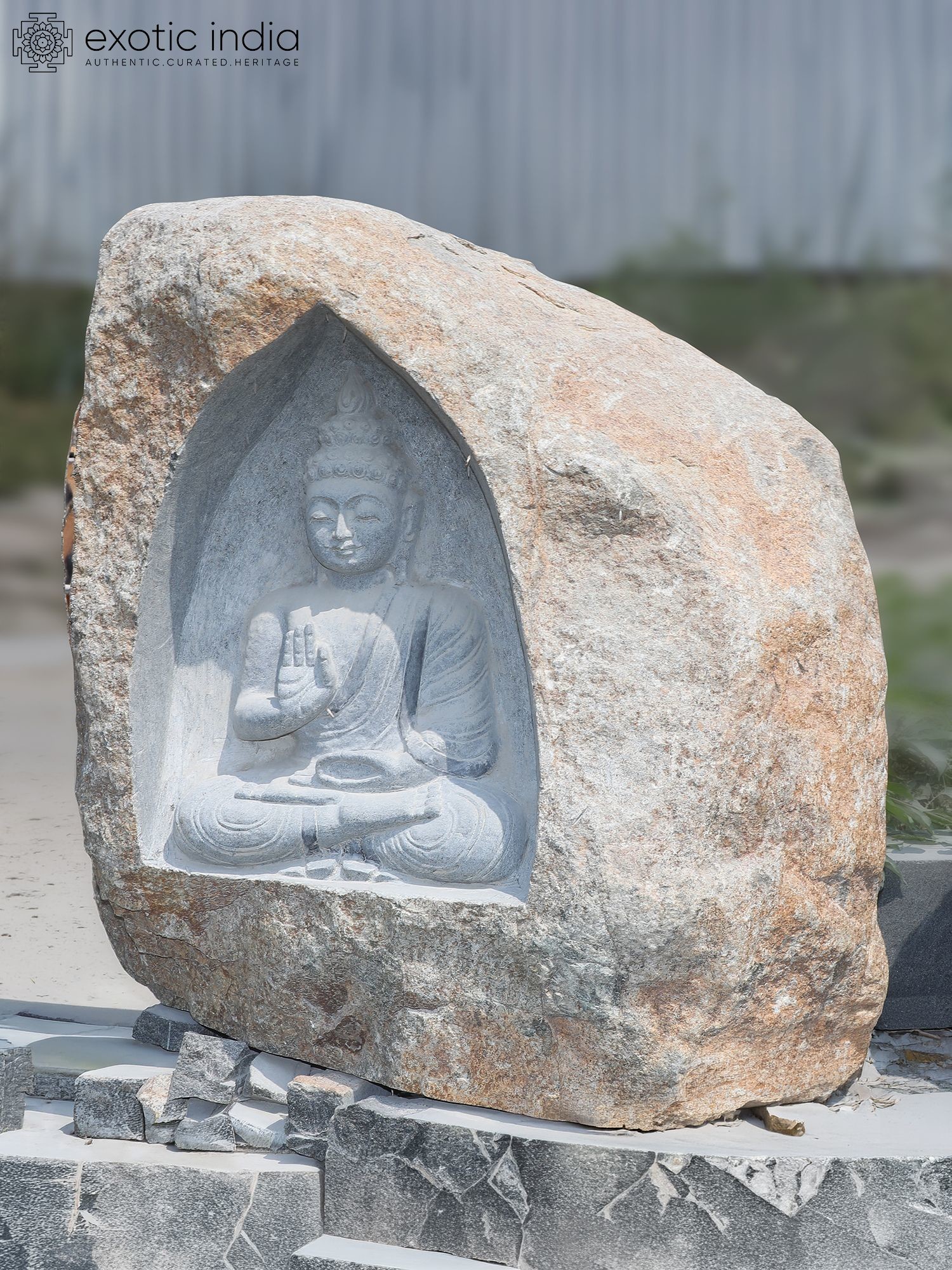 The raw granite exterior contrasts beautifully with the finely sculpted Buddha image.