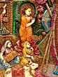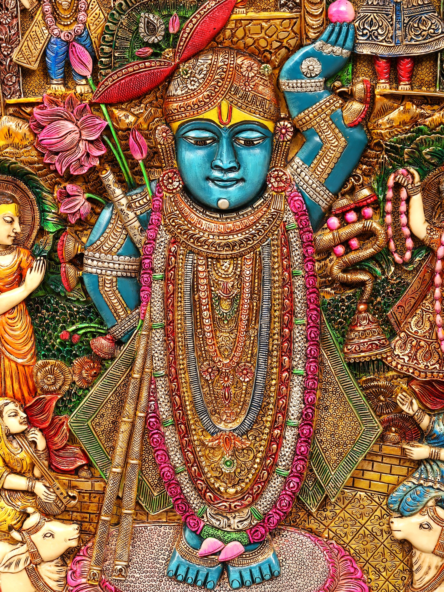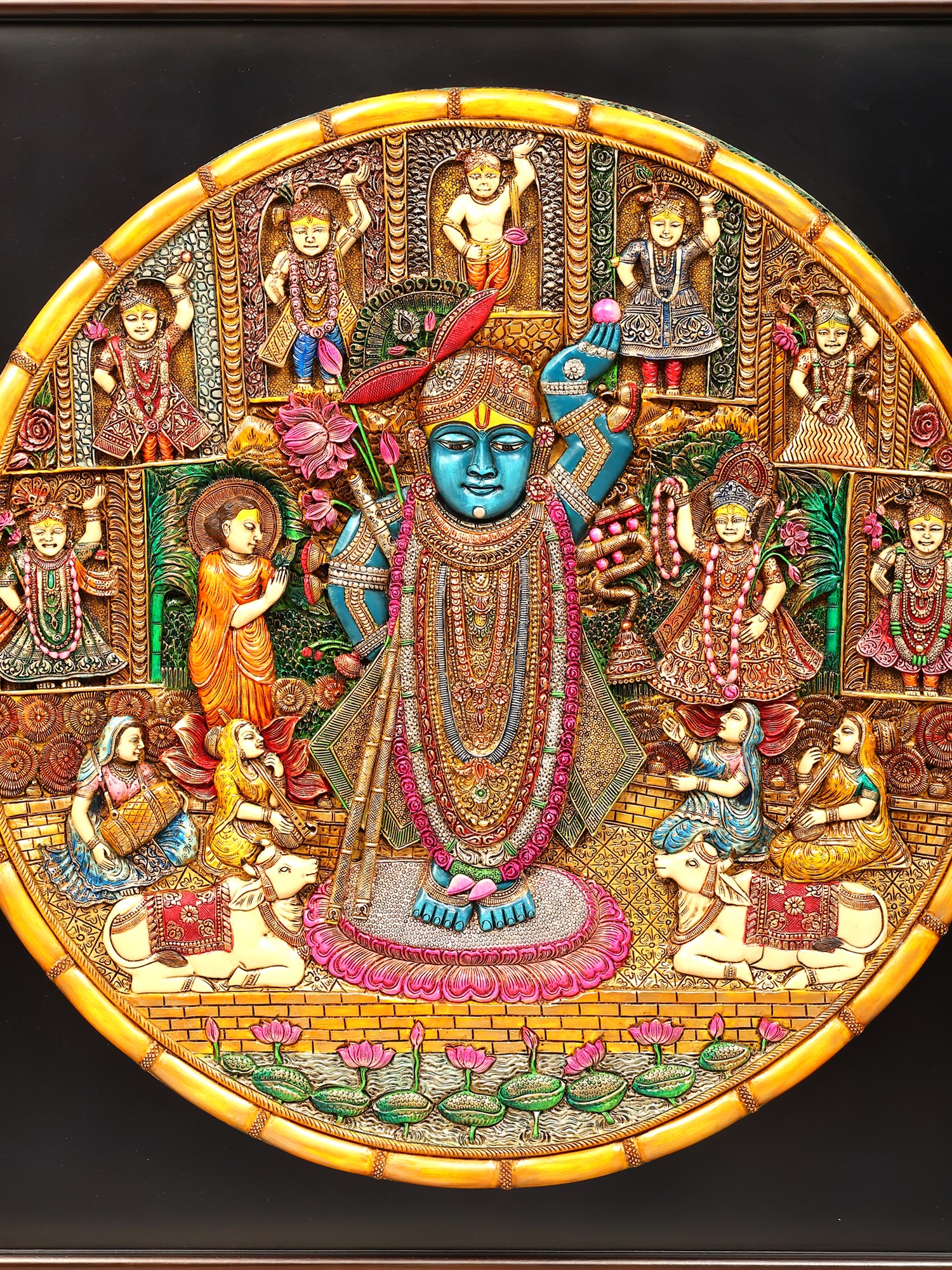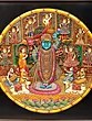 Depicts Shrinathji, a form of Krishna, surrounded by devotees and divine scenes.