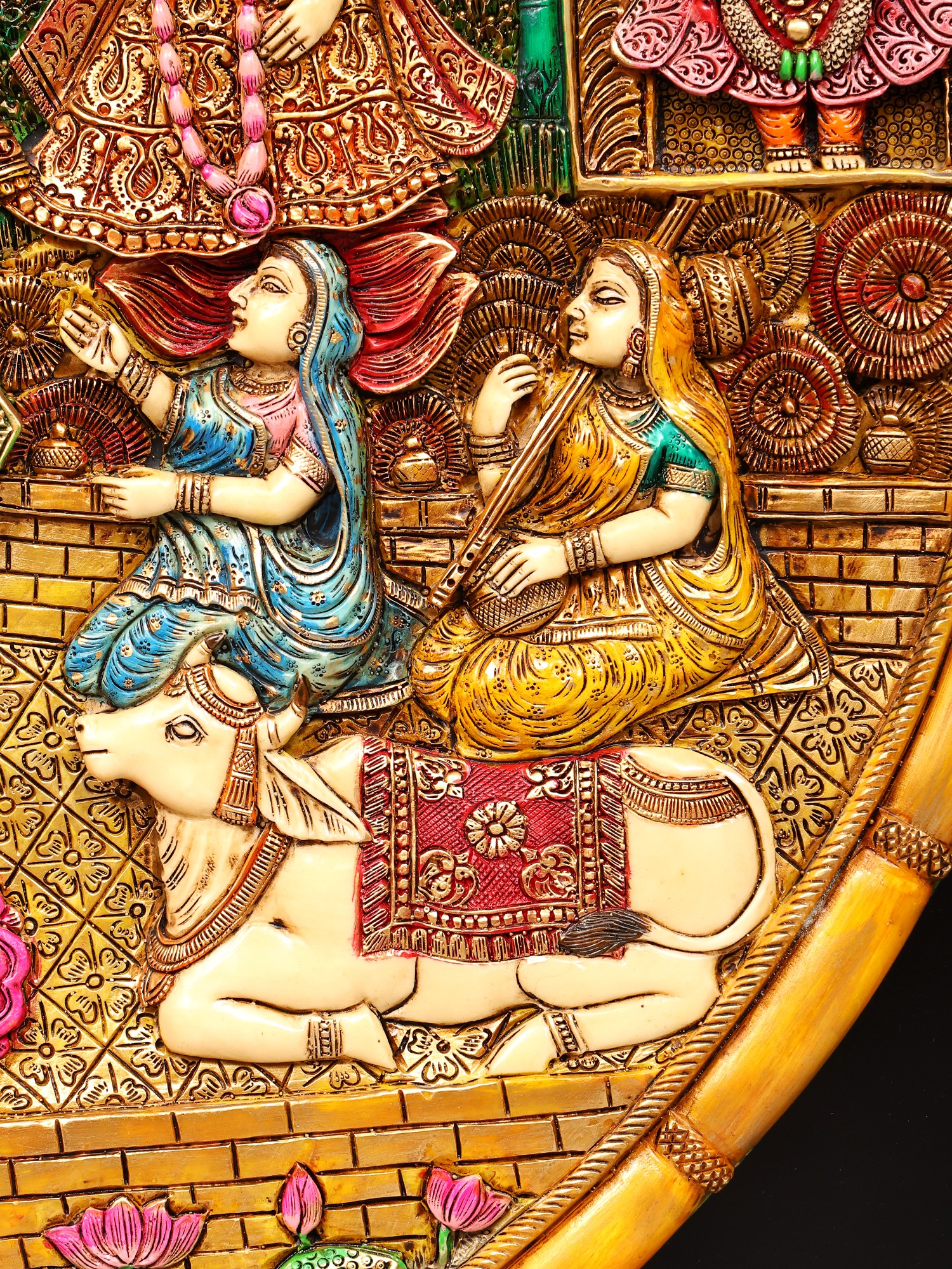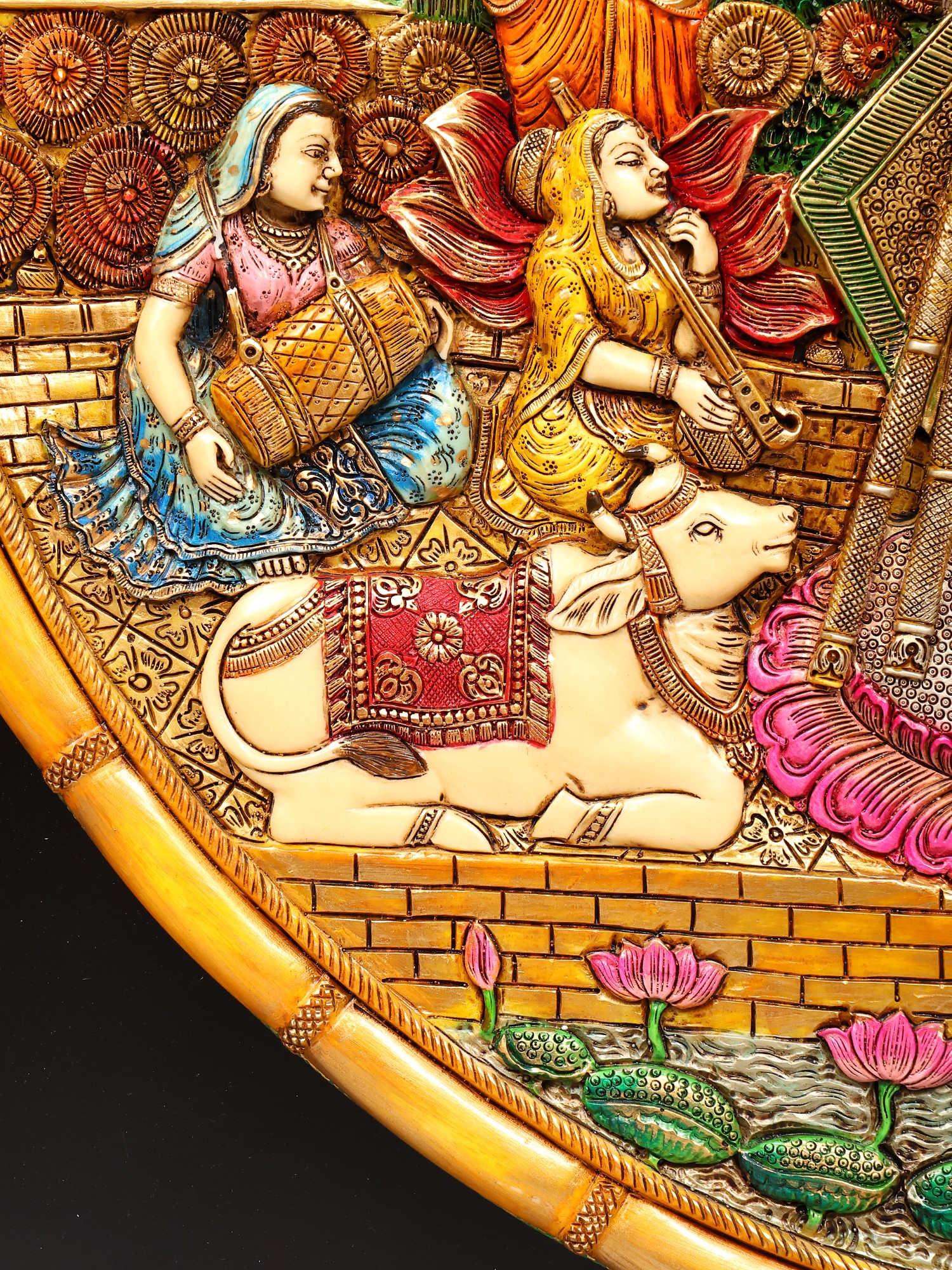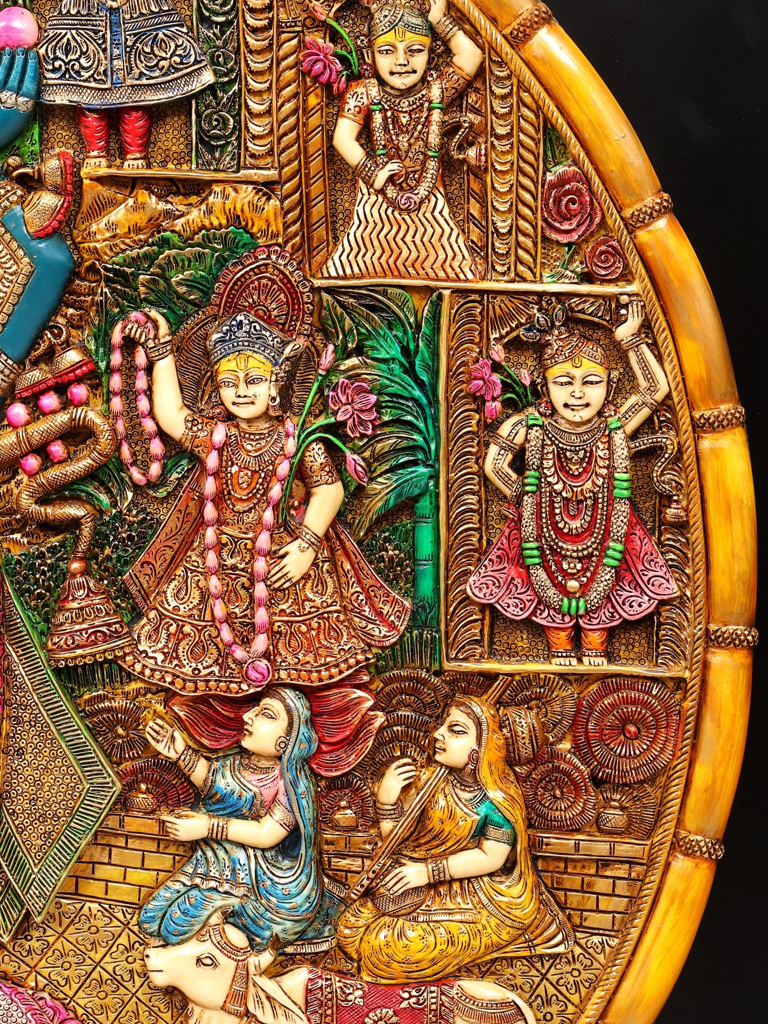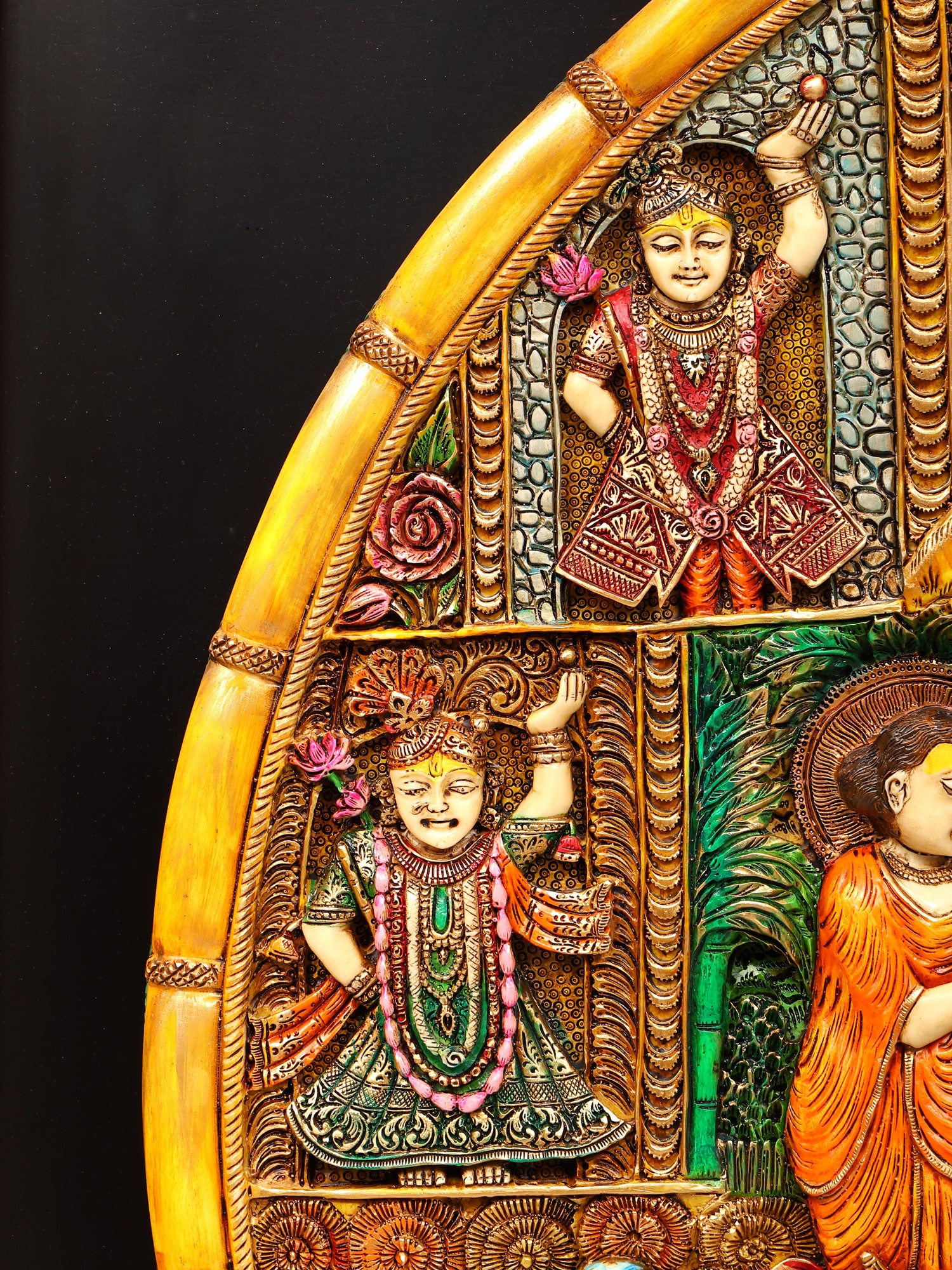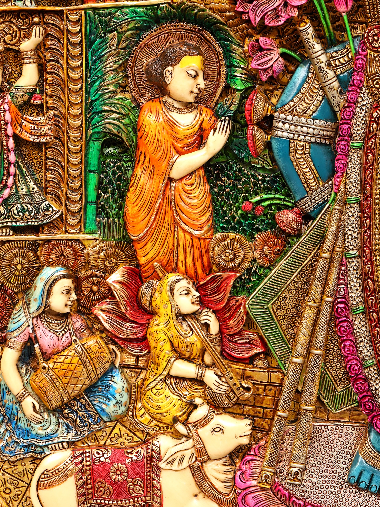 Intricately detailed relief carving showcasing traditional iconography and storytelling.