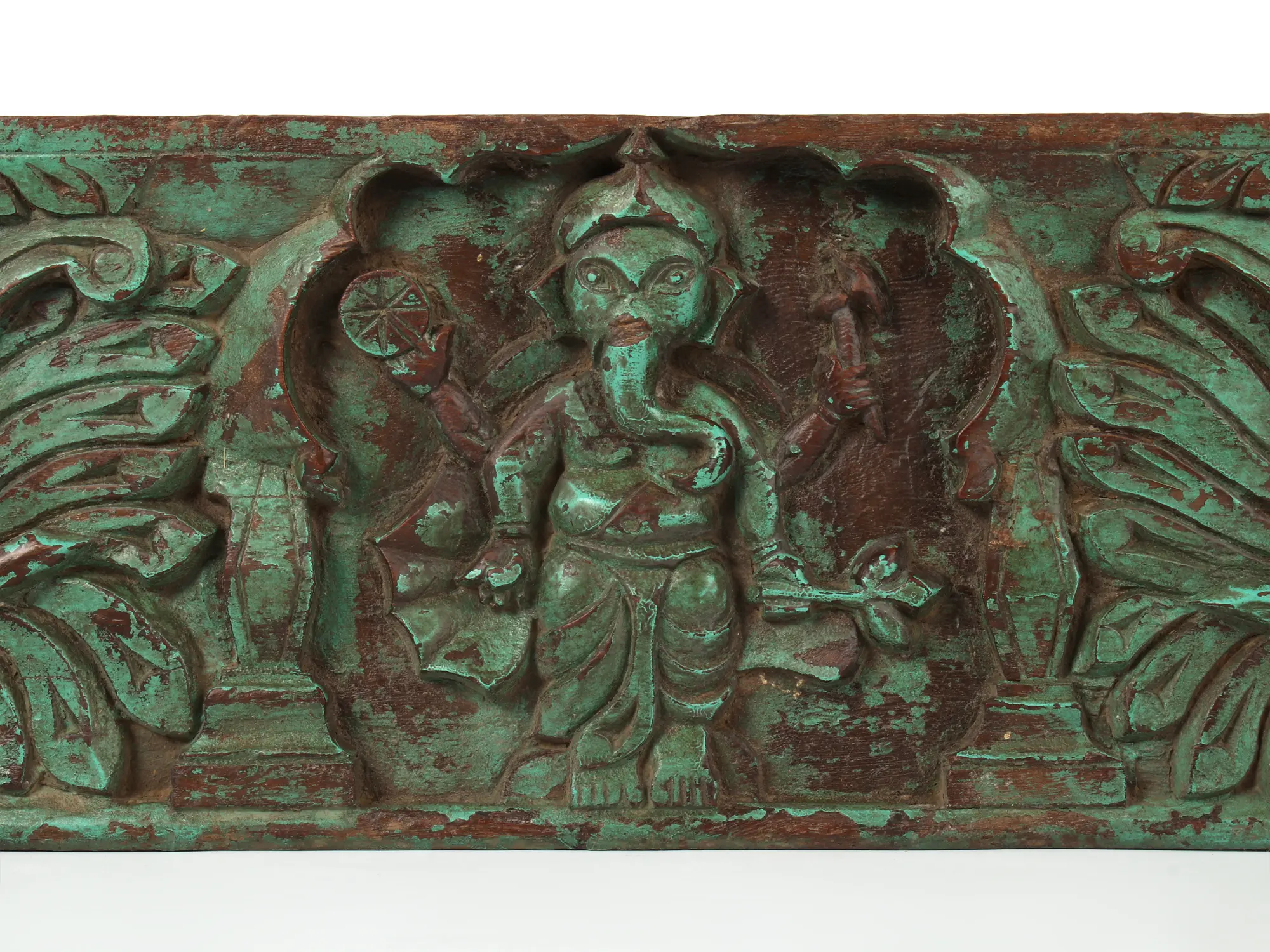 Intricately carved from the whispers of time, this vintage wooden panel is a tribute to exquisite craftsmanship. At its heart lies the divine presence of “Lord Ganesha”, the harbinger of prosperity and wisdom. The designer’s meticulous artistry envelops this sacred icon, creating a mesmerising masterpiece that resonates with history and spirituality. Each stroke of the artisan’s chisel tells a story, each curve a revelation, as the panel exudes an aura of ancient mystique. This wooden marvel is an elegant fusion of art and spirituality, gracing spaces with its enchanting beauty, a portal to a bygone era, and an everlasting symbol of devotion.