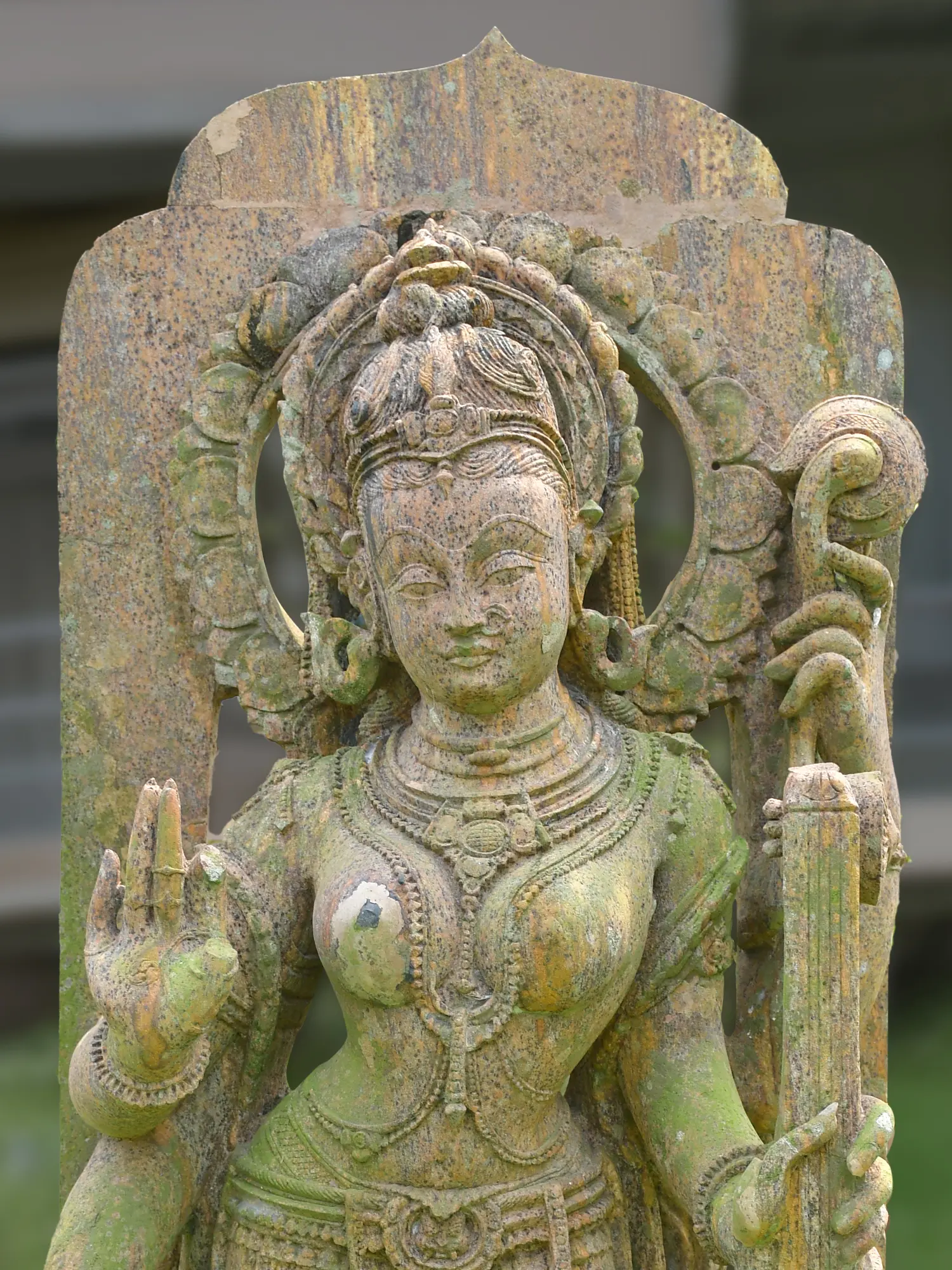 You'll appreciate the goddess's serene countenance, framed by an ornate halo that draws the eye to her divine form. Her posture, elegantly poised and graceful, suggests a contemplative stillness. The subtle rendering of her garments and intricate jewelry speaks to a keen eye for detail, while the inclusion of the veena, the instrument of music and learning, adds a layer of symbolic richness and visual balance to the overall composition. The substantial height of over three feet ensures it commands attention in any setting.