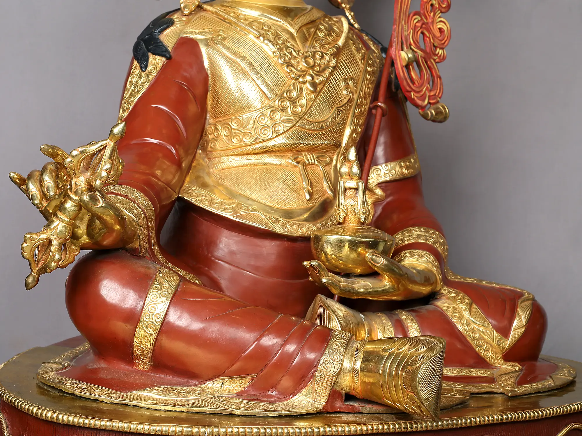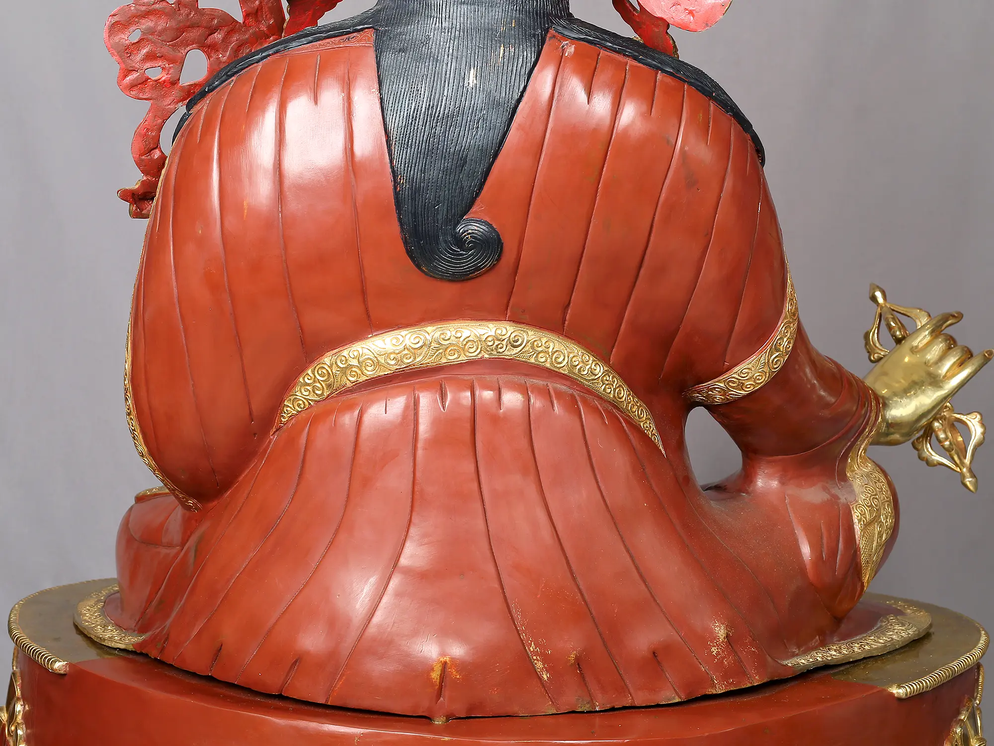 The regalia adorning Padmasambhava speaks volumes about his spiritual authority. His five-pointed crown symbolizes the five dhyani buddhas, representing the five wisdoms that overcome the five poisons of the mind. The ornaments, including earrings and bracelets, signify his renunciation of worldly attachments while acknowledging the beauty and impermanence of existence. In his right hand, he holds aloft a dorje, a ritualistic implement symbolizing indestructibility and skillful means. In his left, he cradles a skull cup filled with nectar, representing the elixir of life and the overcoming of death. The stylized flames emanating from his shoulder are indicative of his spiritual dynamism and his ability to purify and transform negative energies. This large-scale representation of Guru Padmasambhava is more than just a statue; it is an invitation to connect with a lineage of profound wisdom and a powerful presence that has guided countless beings toward enlightenment. Its presence can transform any space into a sanctuary of peace and spiritual aspiration, serving as a constant reminder of the potential for awakening within us all.
