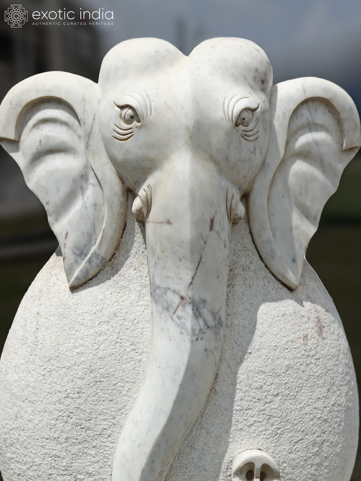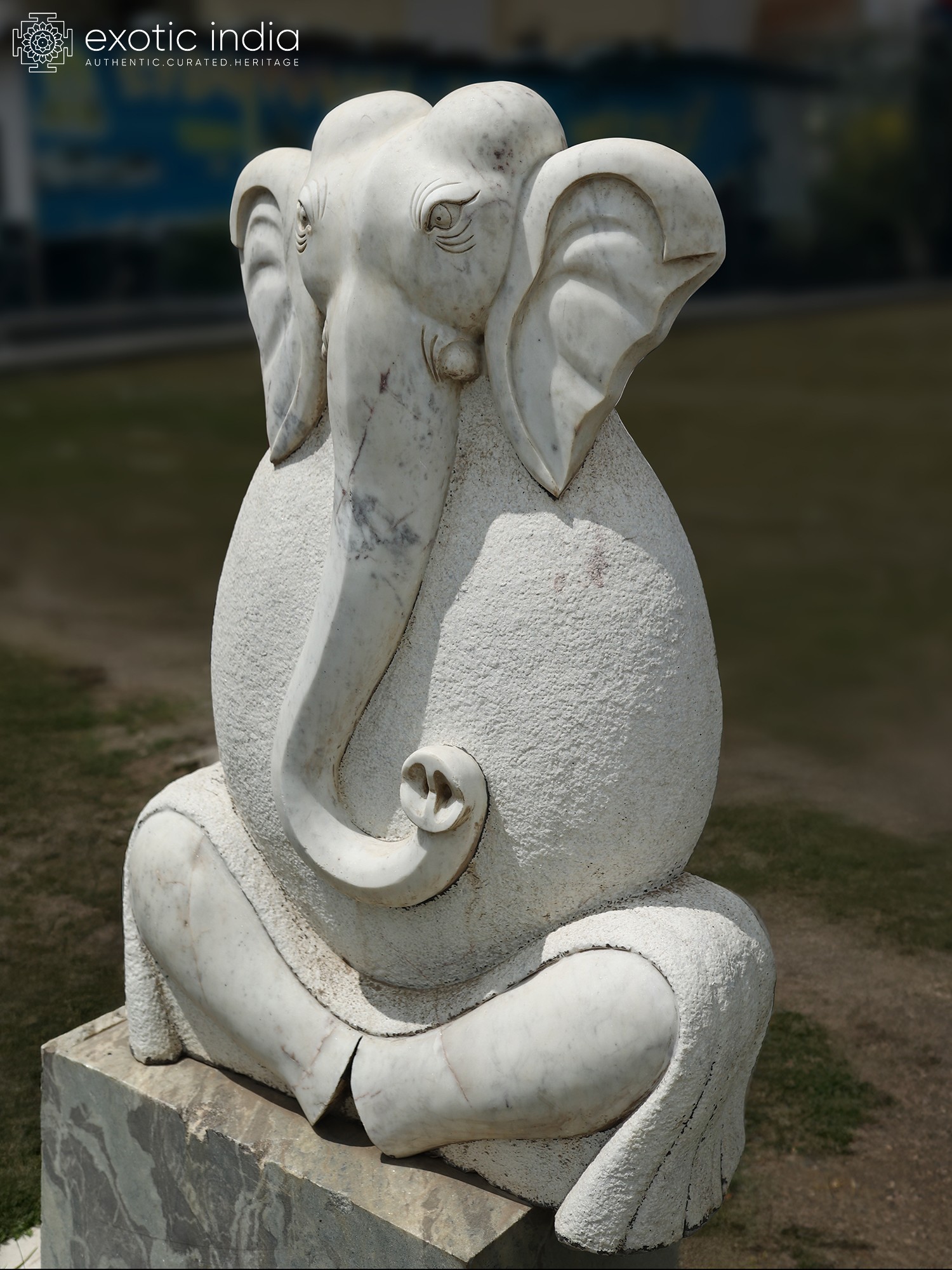 This magnificent white marble statue embodies the serene and benevolent form of Lord Ganesha, the beloved Hindu deity revered as the remover of obstacles and the lord of beginnings. Crafted with exquisite detail from pure white marble, this art piece exudes a timeless elegance that seamlessly blends traditional iconography with a contemporary aesthetic. The substantial size of this statue makes it a commanding presence, suitable for adorning spacious gardens, tranquil courtyards, or grand entranceways, inviting peace and prosperity into any setting. ––––––––––