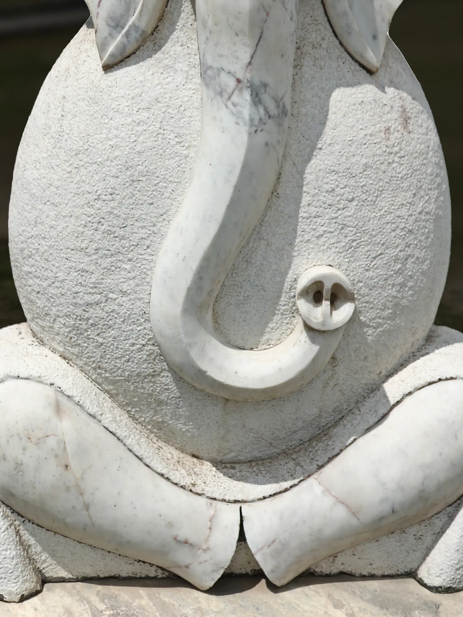 Lord Ganesha, with his distinctive elephantine visage and portly form, is a symbol of wisdom, intellect, and good fortune. Legends tell that he was created by Goddess Parvati from her own divine essence and brought to life by the grace of Lord Shiva. His ability to overcome any challenge, be it physical or spiritual, makes him the patron deity of scholars, artists, and anyone embarking on new ventures. Invoking Ganesha is believed to bestow success and auspiciousness, clearing the path for endeavors and warding off negativity. This statue captures his serene seated posture, a representation of his calm and contemplative nature, offering a source of inspiration and spiritual solace. The textured finish of the marble adds a unique tactile dimension, contrasting beautifully with the smooth, polished contours of his form. ––––––––––