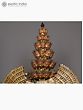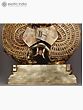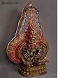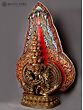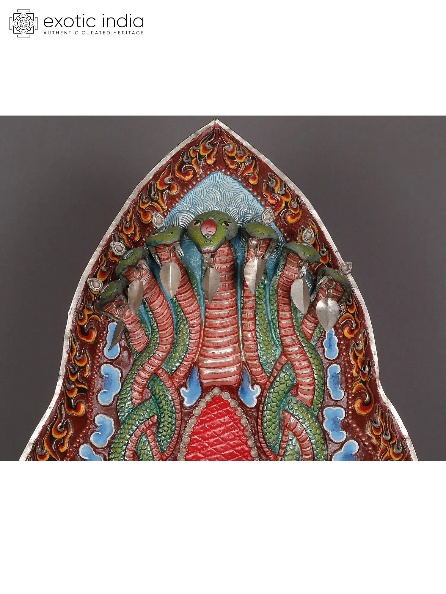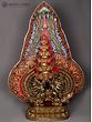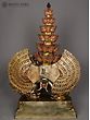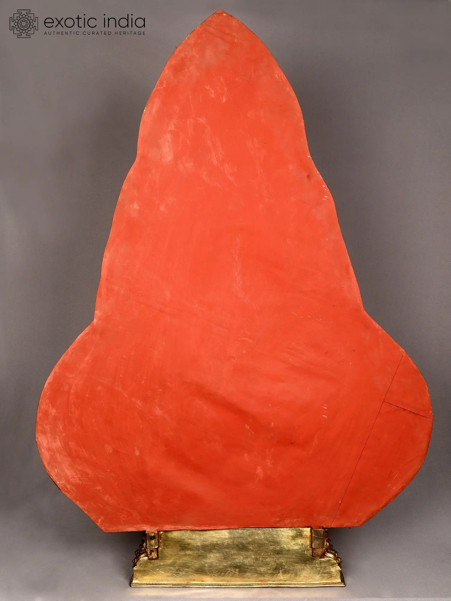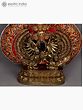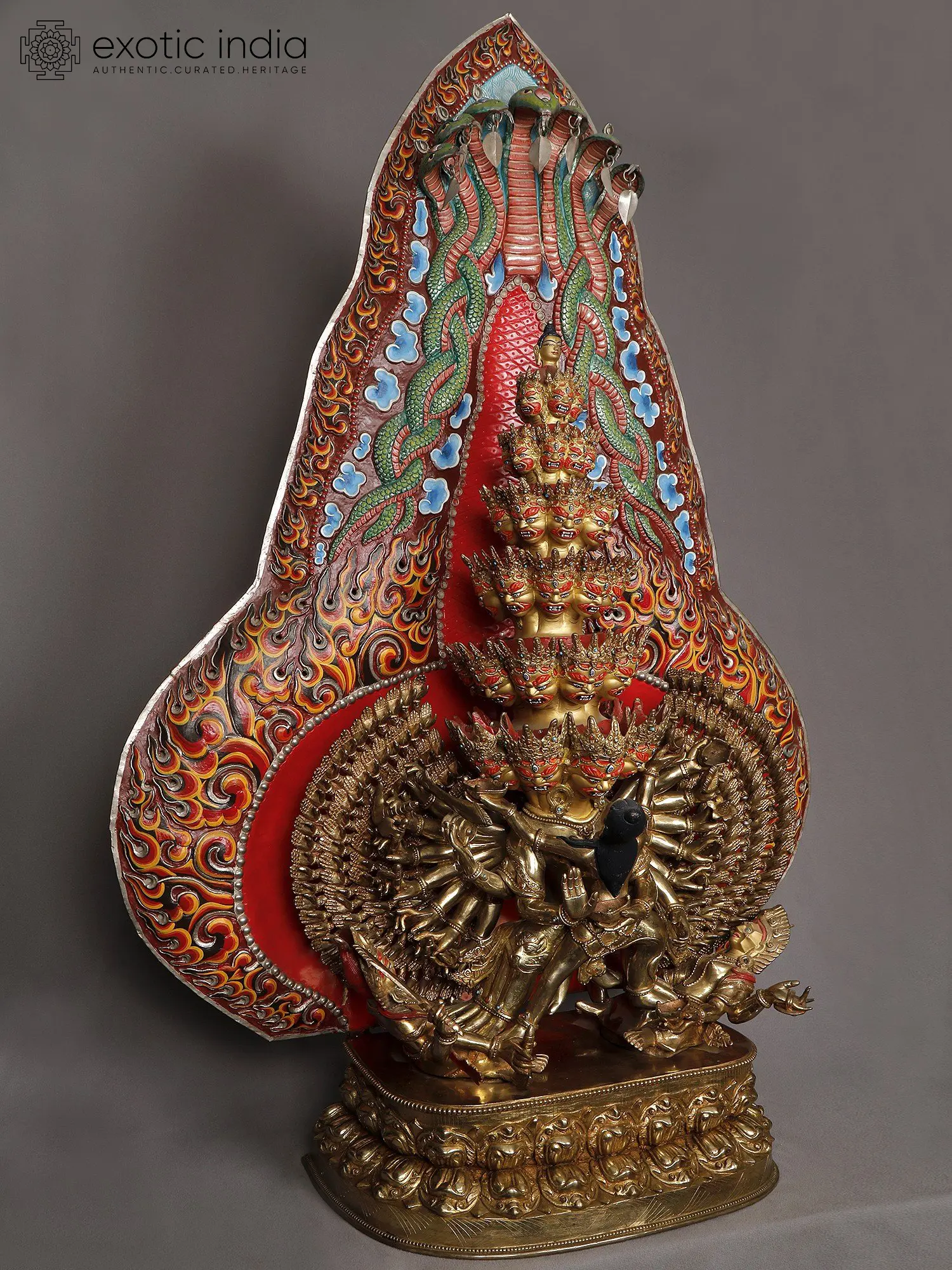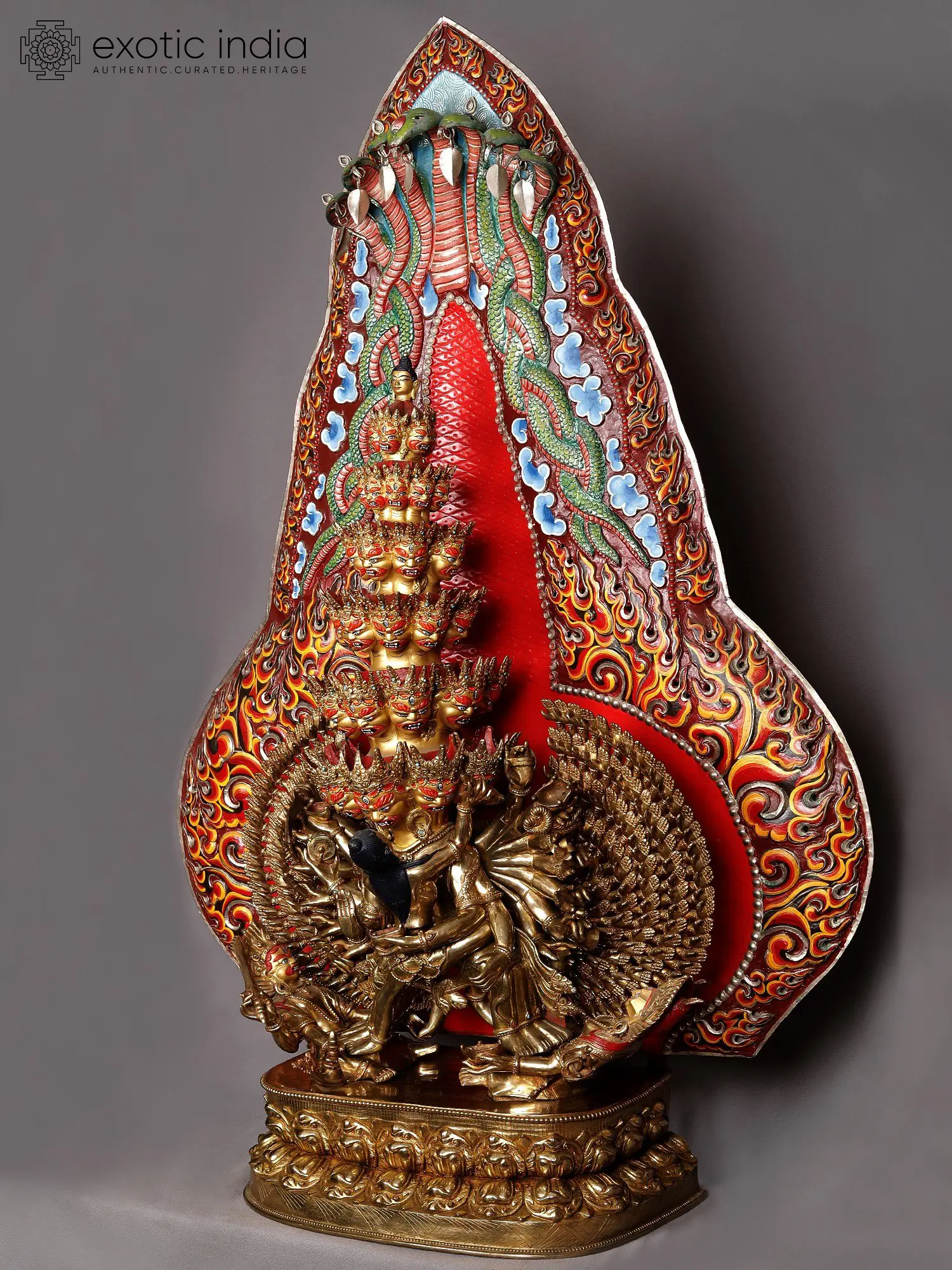 In Vajrayana, Heruka is the extension of the wrath of Akshobhaya and represents the ultimate bliss of enlightenment. In this gilded copper icon of Heruka, he is presented in his Vishwarupa, or cosmic form, in union with his consort, Vajrayogini. In this form, Heruka is also known as Hevajra. The multiple-faced and multiple-armed Vishwarupa is haloed by magnificent serpent hoods intertwined to represent infinity, raging fires of wisdom, and peaceful clouds. On an intricate lotus platform, the mighty Heruka or Hevarja stands blessing the devotee.