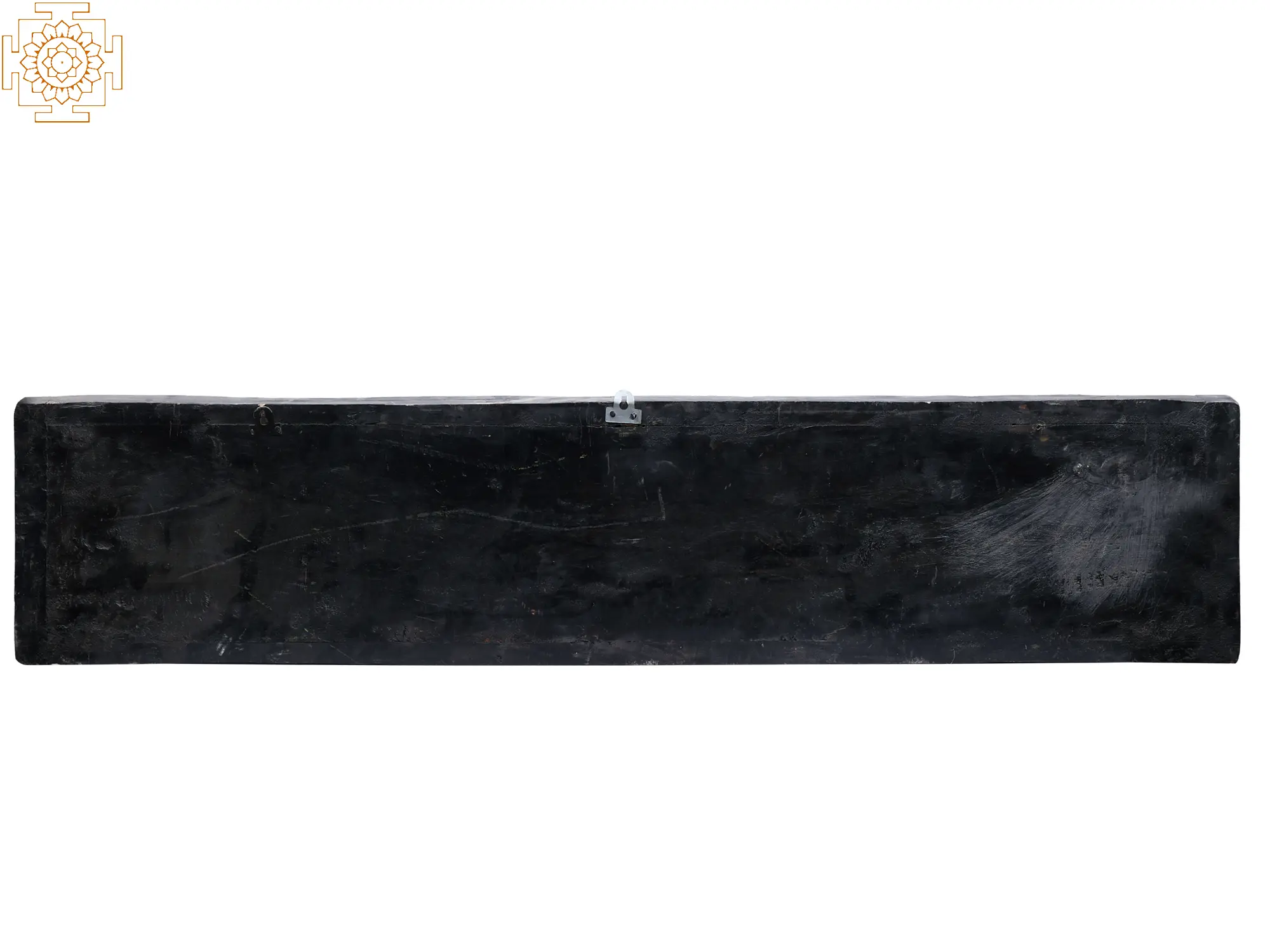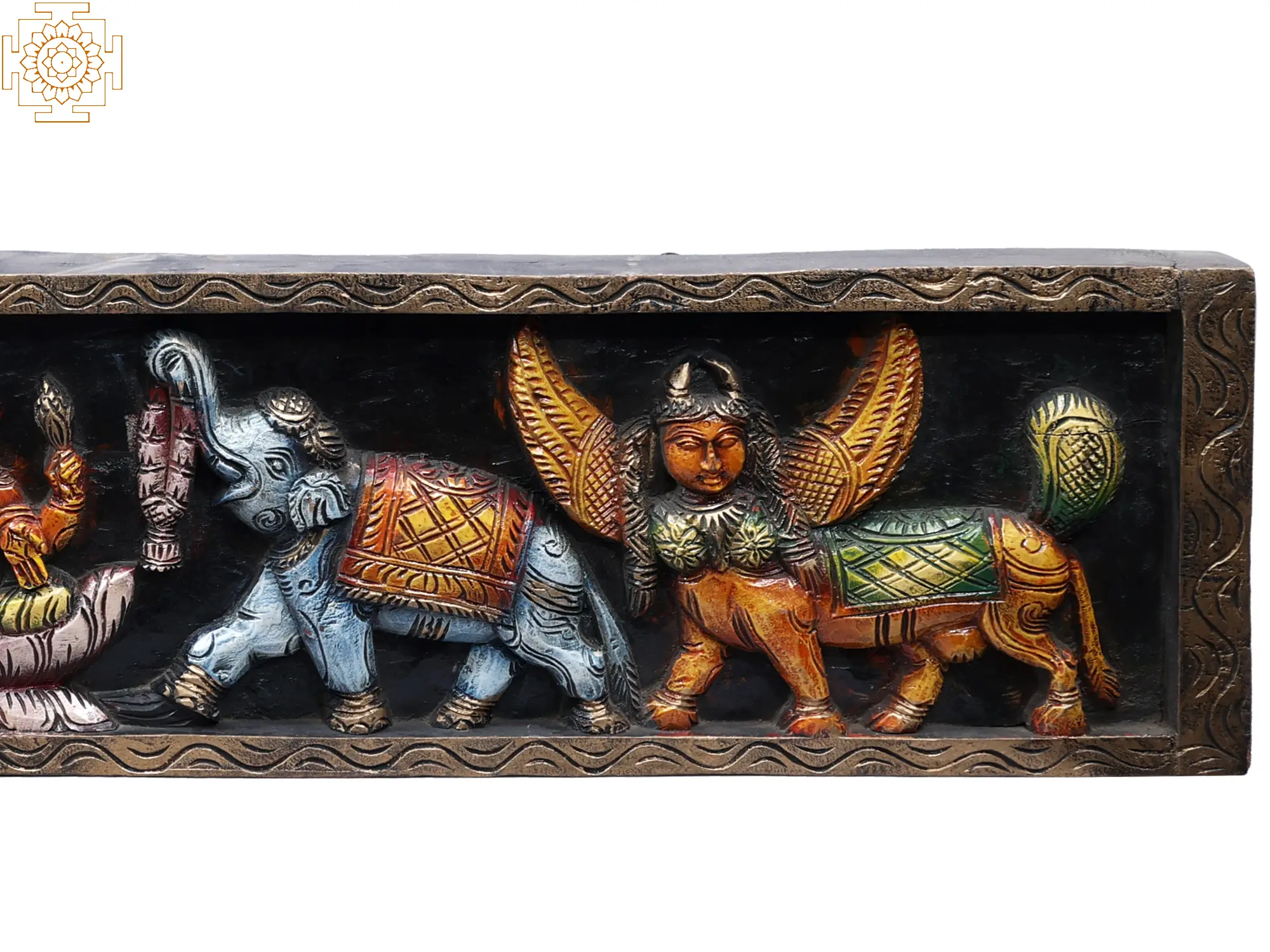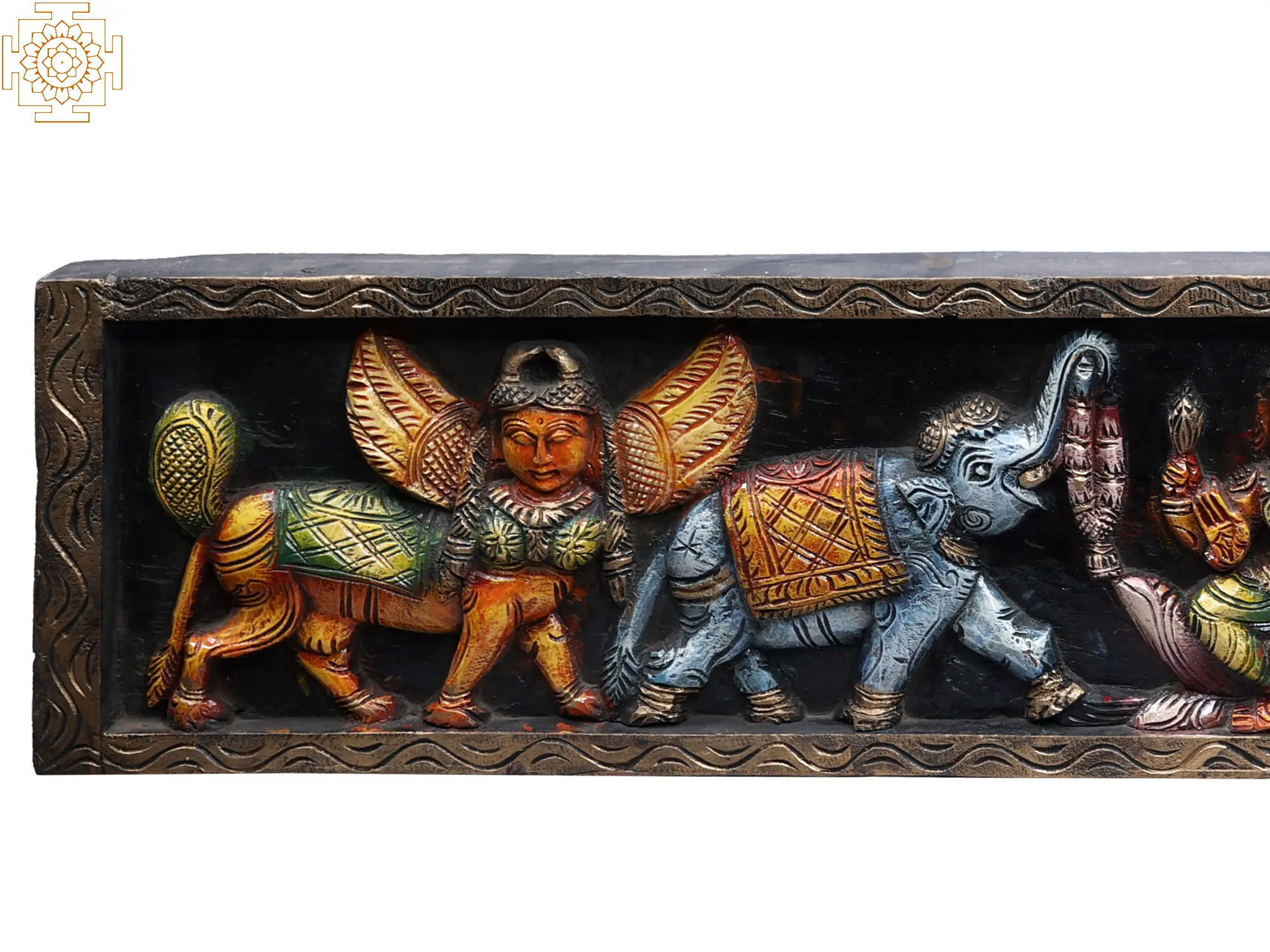 Fecundity and auspiciousness are virtues that birth and sustain the universe, a divine symbol of which is Devi Lakshmi and the celestial cow Kamadhenu. As a manifestation of the goddess Earth, who is an aspect of the goddess Sri Lakshmi, Kamadhenu is associated with the Hindu goddess of wealth as an extension of her cosmic powers. This wooden wall panel brings the ancient and sacred iconography of Hindu temples to your space, with twin images of Kamadhenu flanking the form of Devi Lakshmi as “Gajalakshmi”.