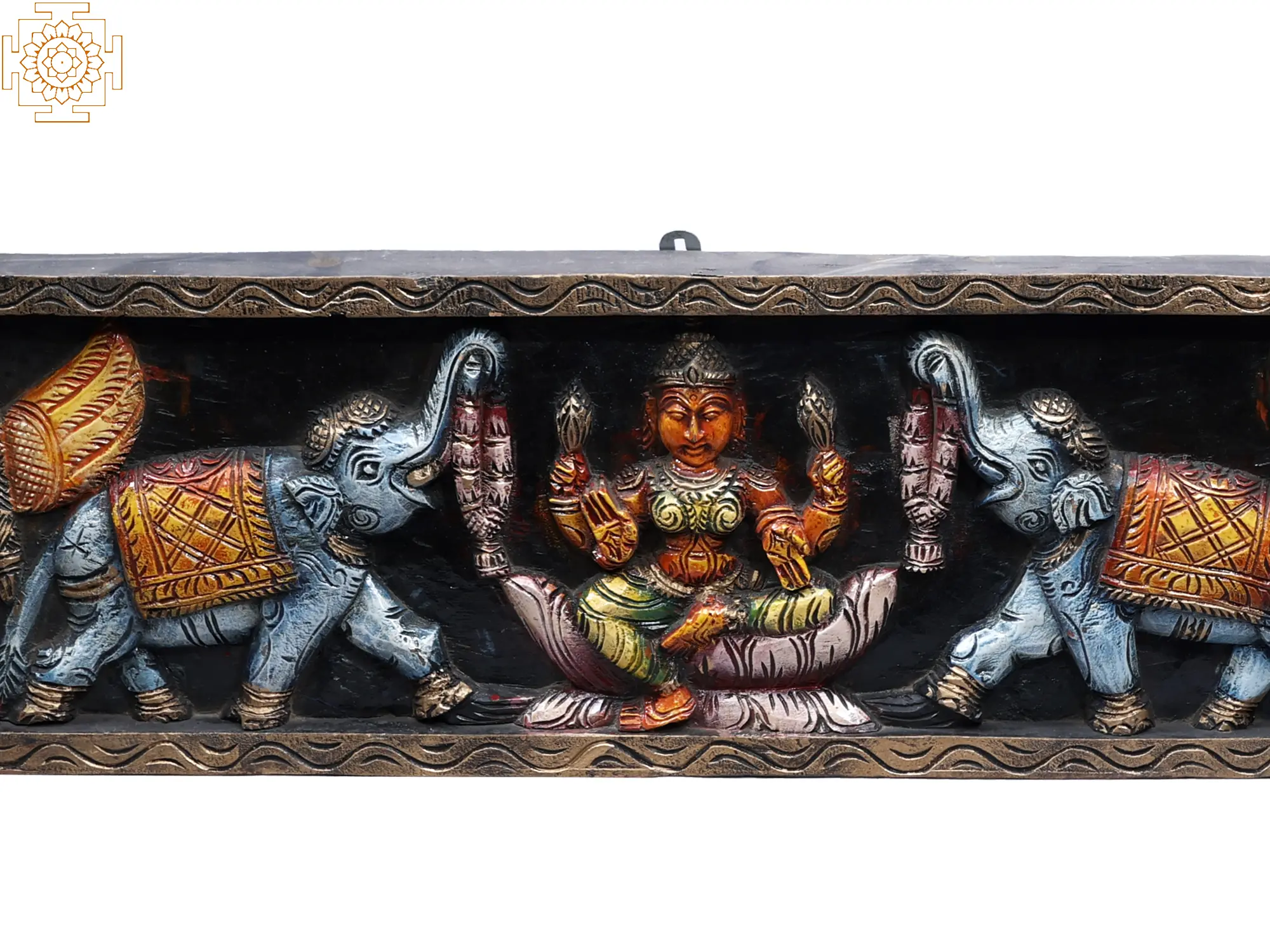 Two Gaja or elephants, symbols of royalty and a representation of the rain-filled clouds that nurture the earth, offer obeisance to the great mother, whose benevolence manifests in the world as the fecundity of the earth and luxury of life. Detailed delineation and traditional colors fill a divine aura in this horizontally laid wall panel, a source of fortune and bliss wherever it is placed.