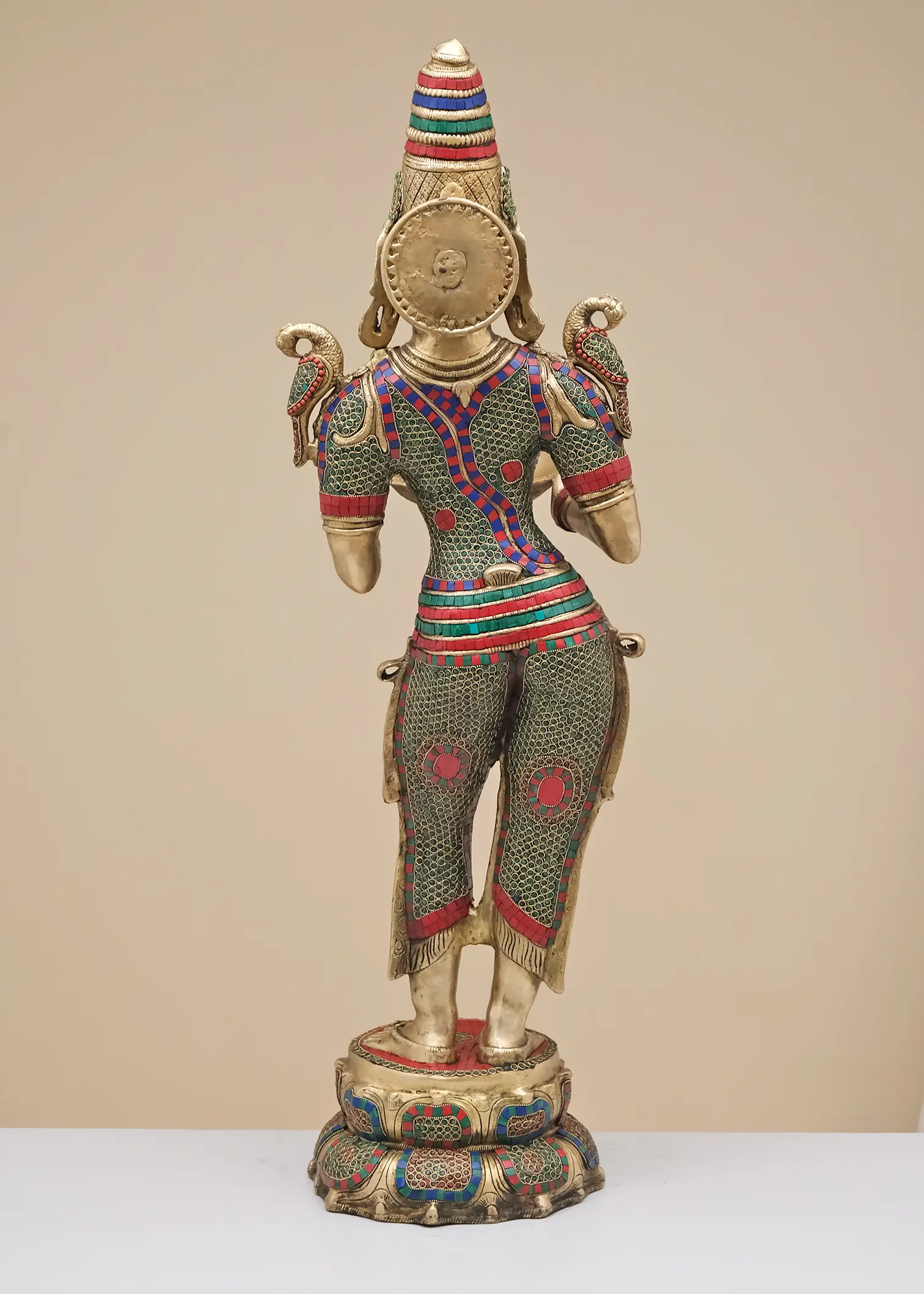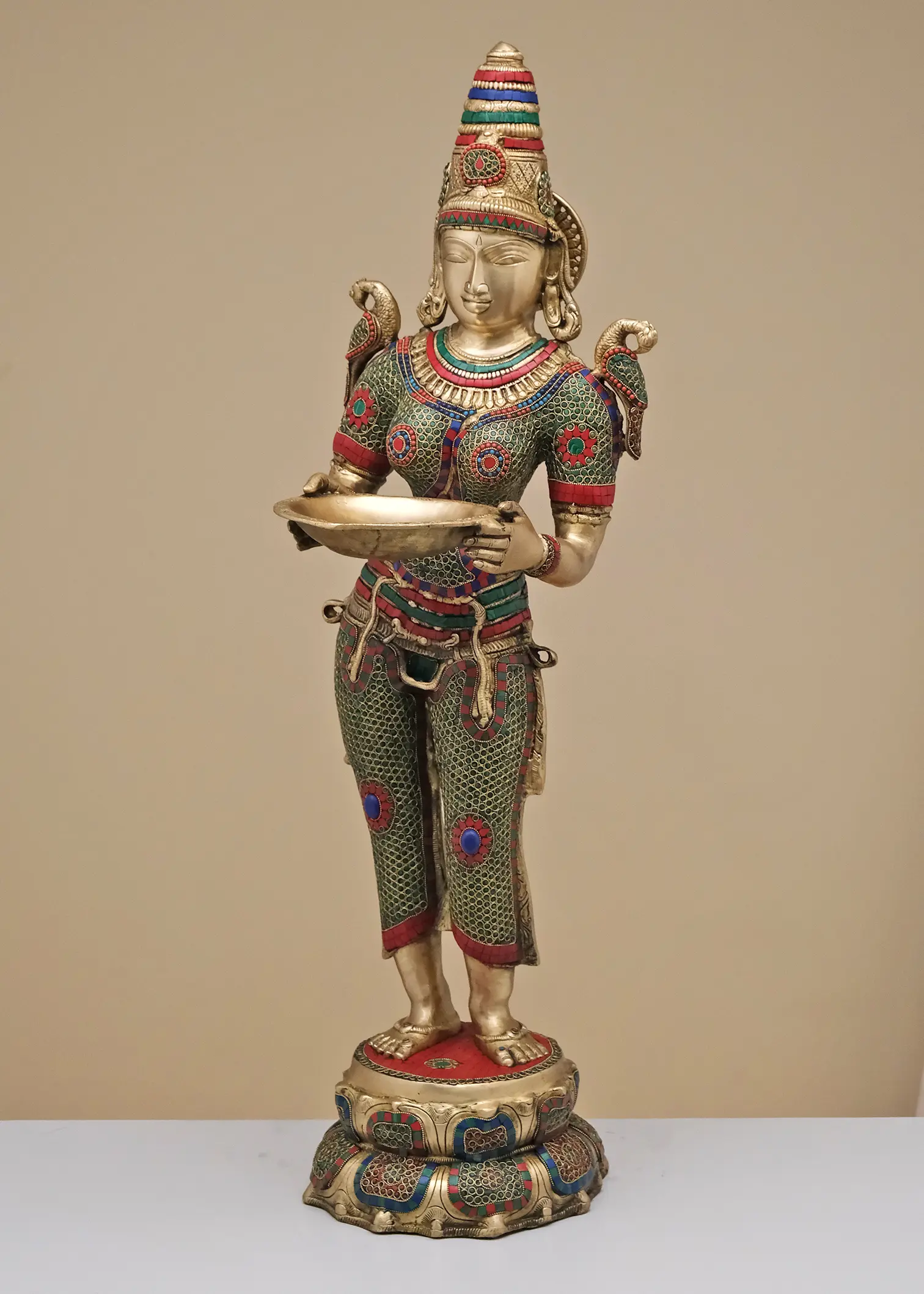 “Paavai Vilakku” or Deepalakshmi is a traditional home and temple decor figure, timeless in its charm and profound in its meaning. The handmade brass statue of Deepalakshmi has been sculpted in its popular iconography, standing gracefully with the Deepa or lamp in their hands. The lady with the lamp is adorned beautifully from head to toe, with an elongated crown, layered necklaces, and attire, studded with vivid inlay pieces that bring an element of artistry to the statue.