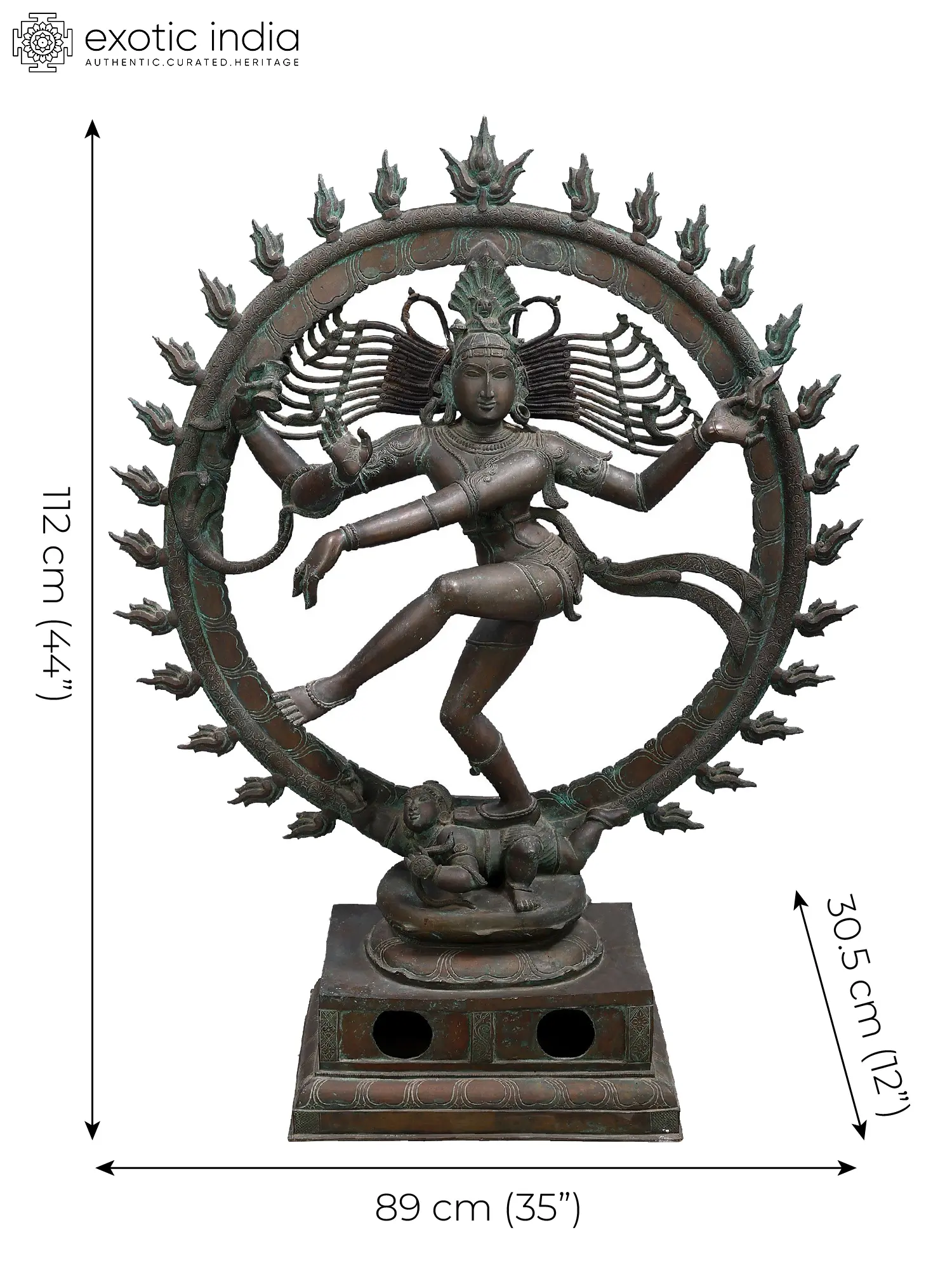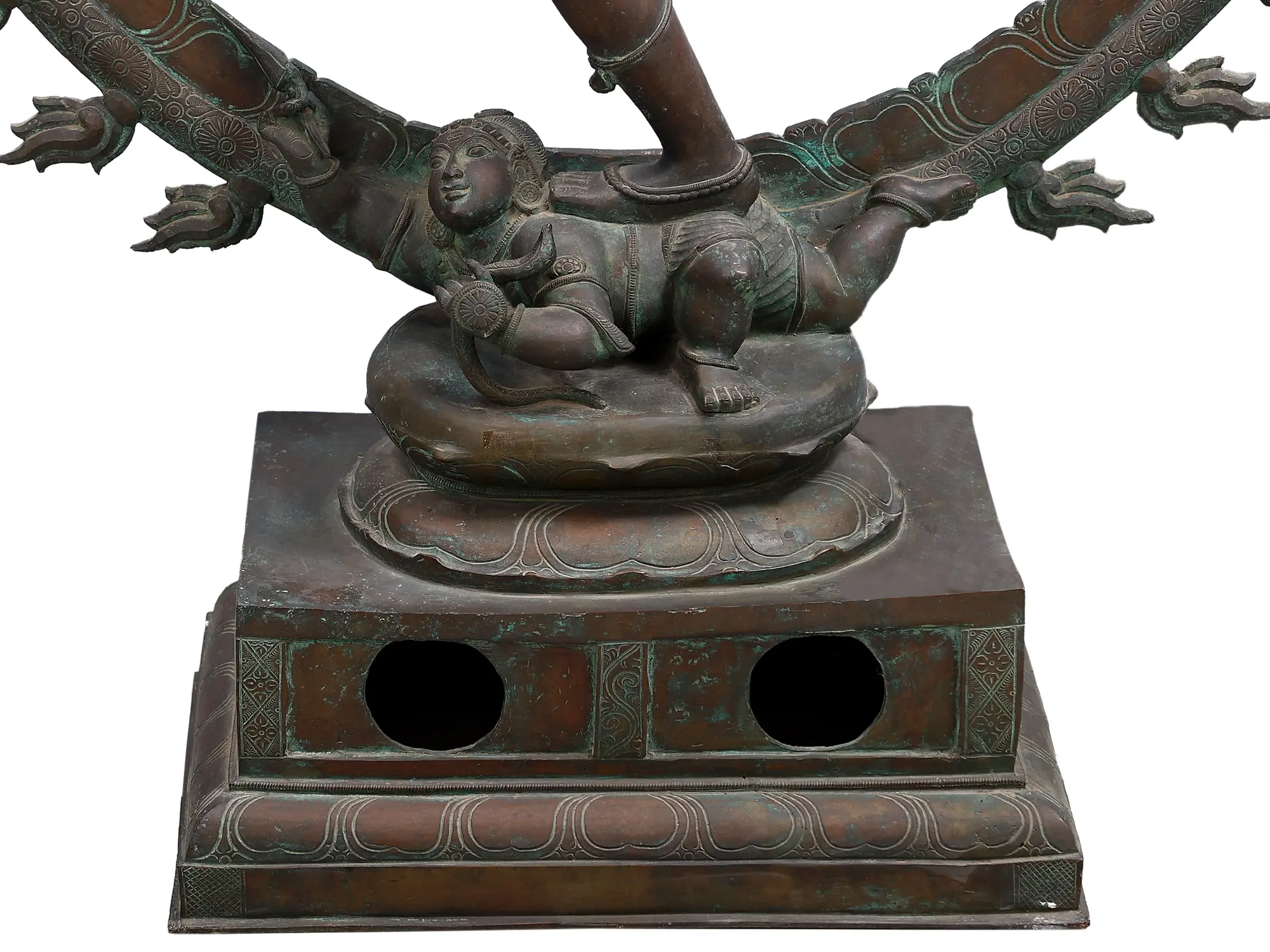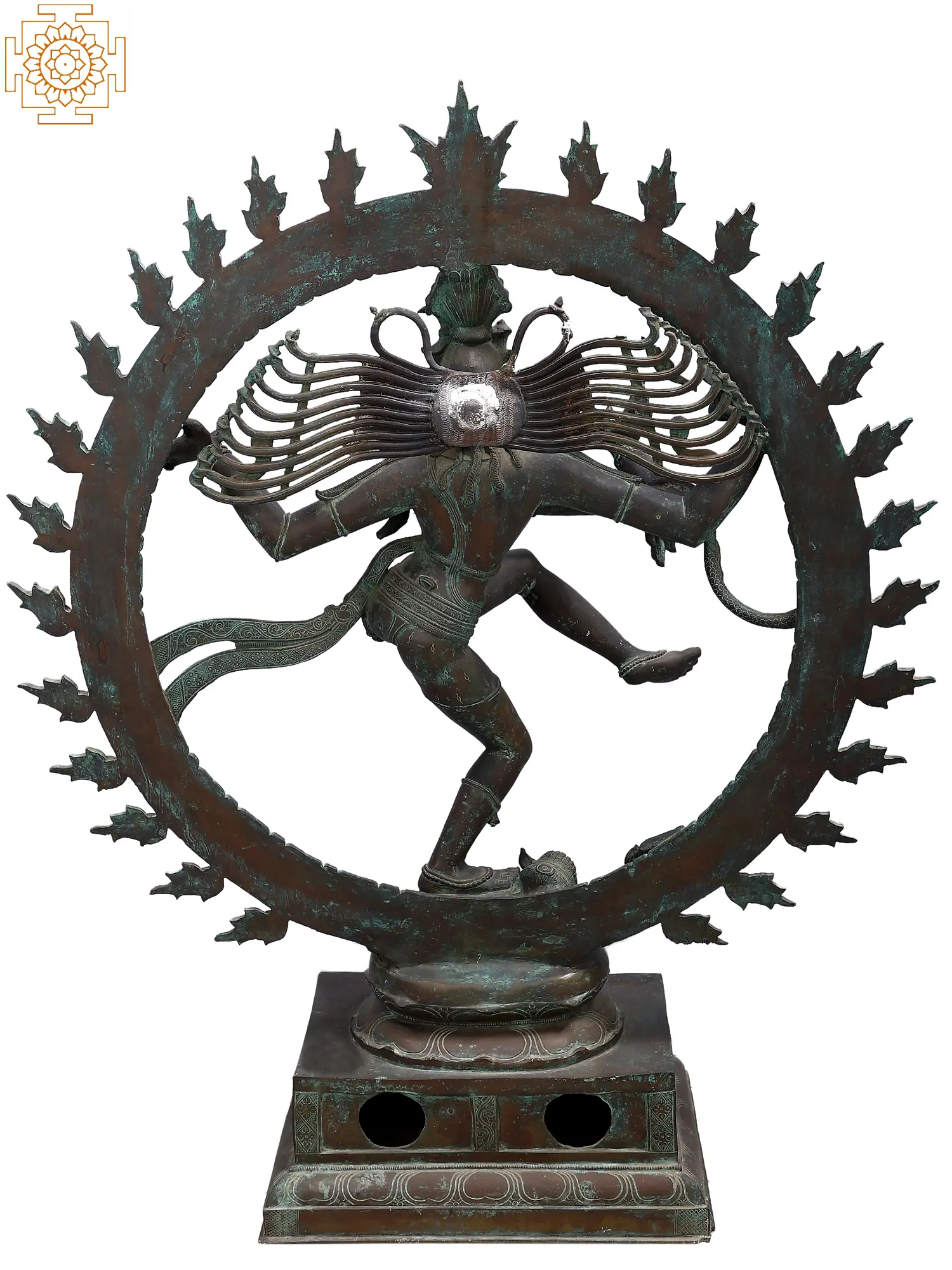 This bronze Nataraja murti conforms to the traditional South Indian sculpture style. For example, there is a pair of circular openings down the body of the plinth. This is designed for the sculpture to be hauled from one place to another using thick rope.