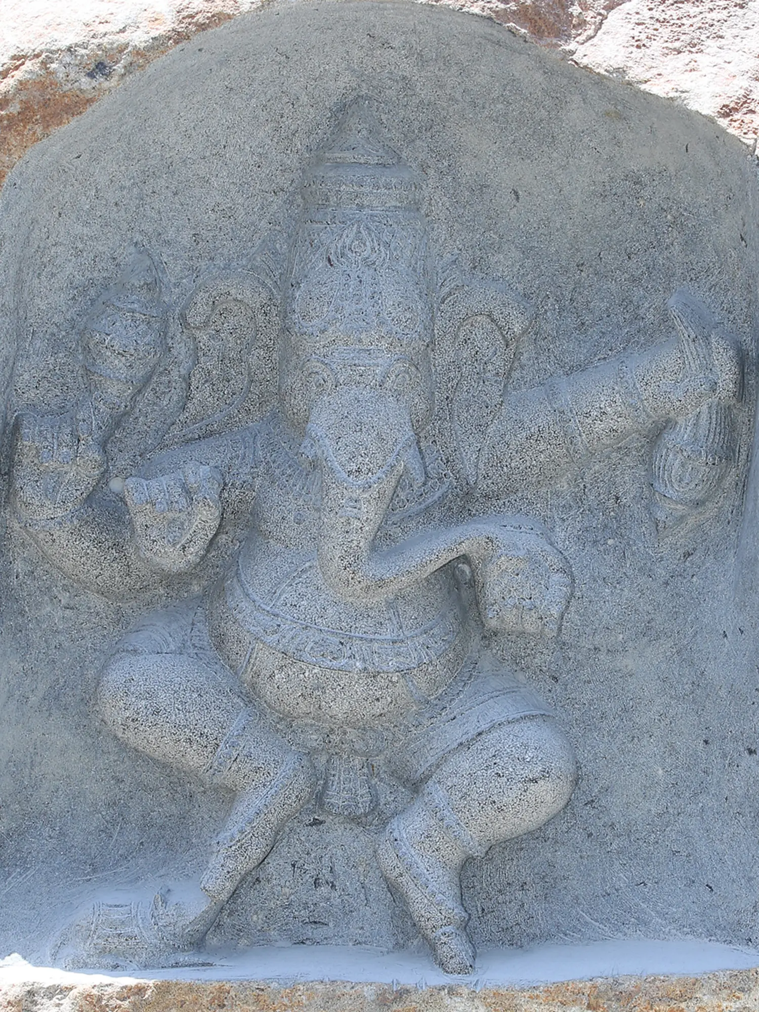 His multiple arms gracefully extend, holding symbolic objects, while his playful posture signifies the removal of obstacles and the joy found in spiritual growth.