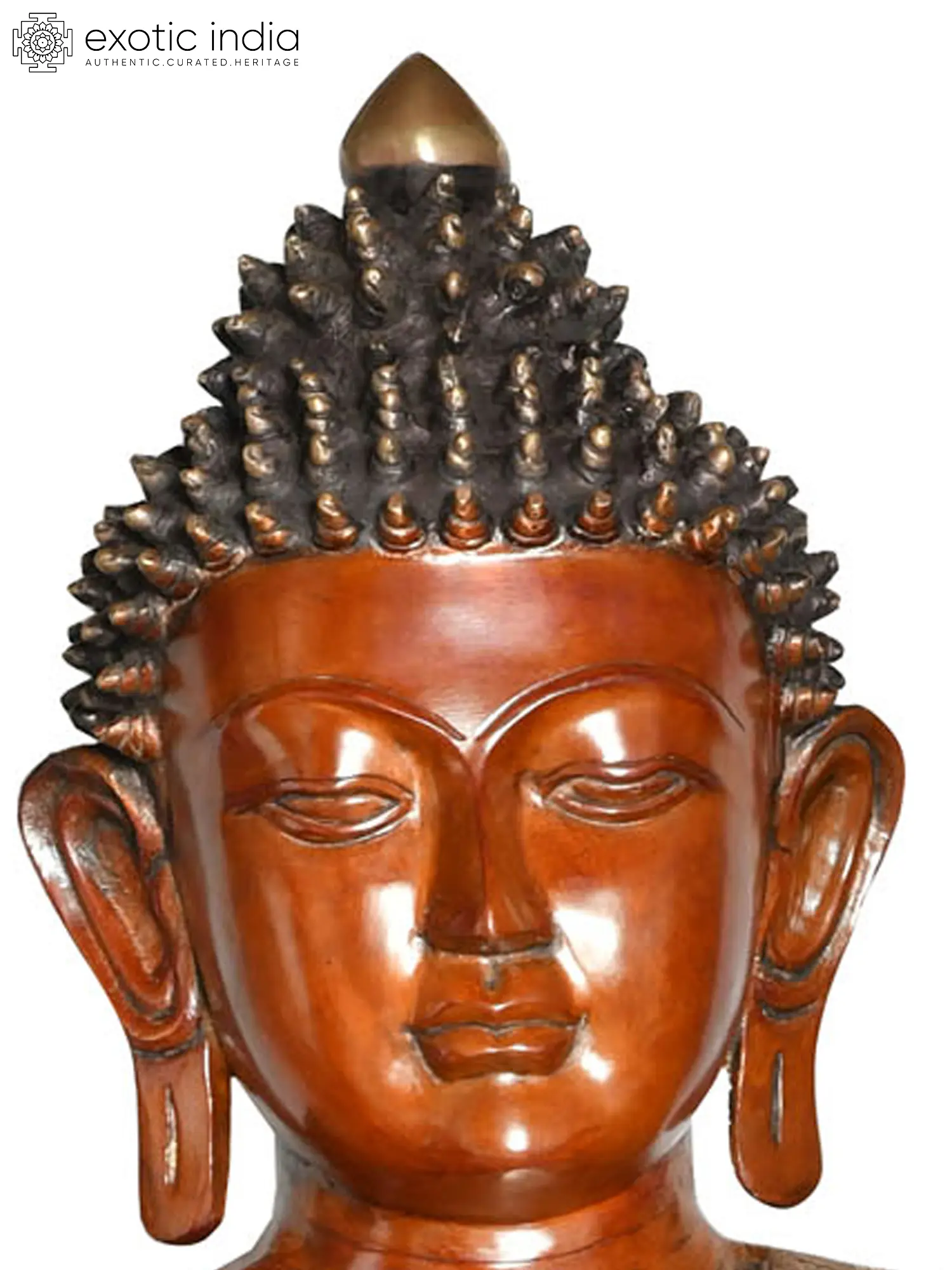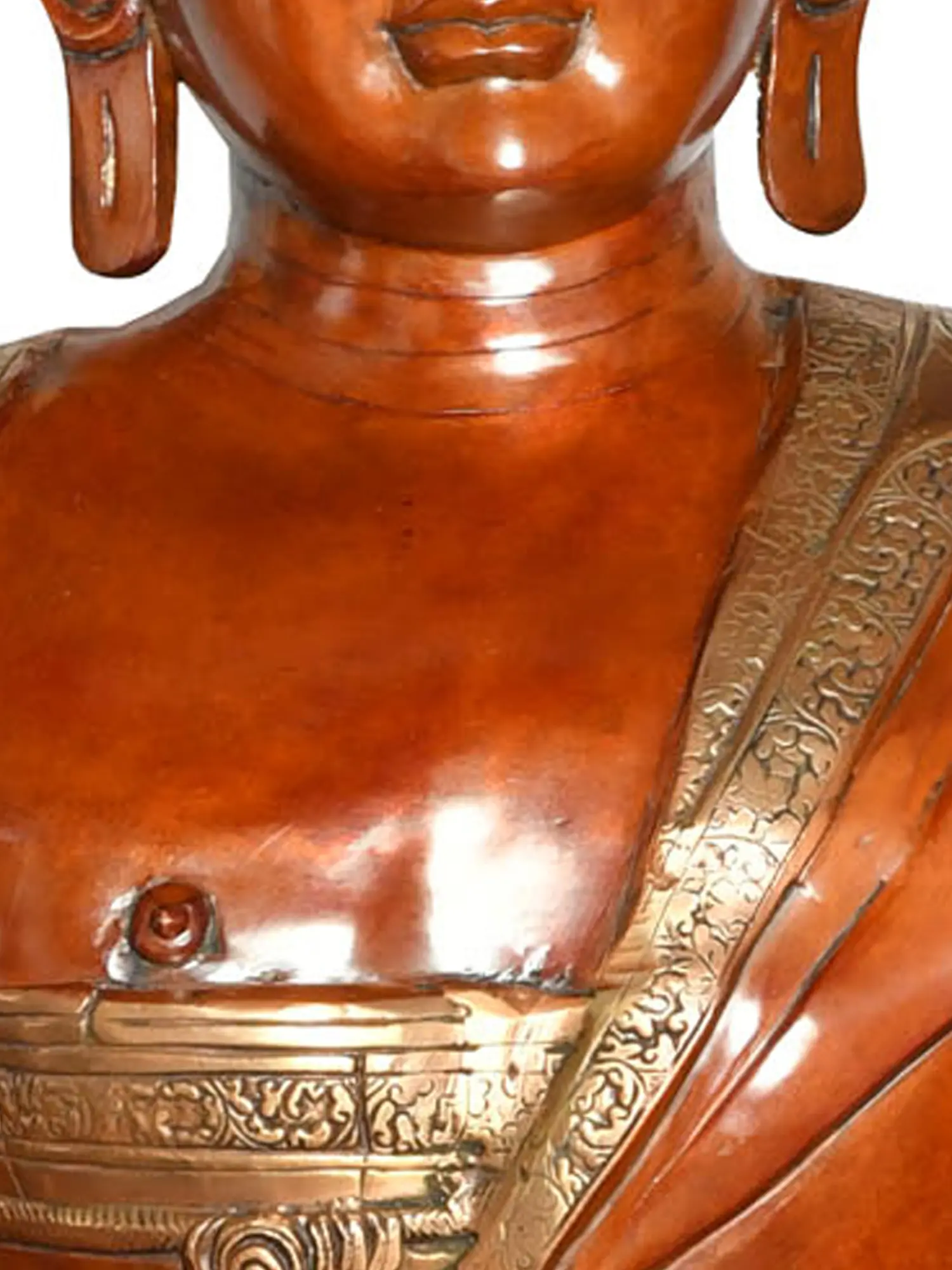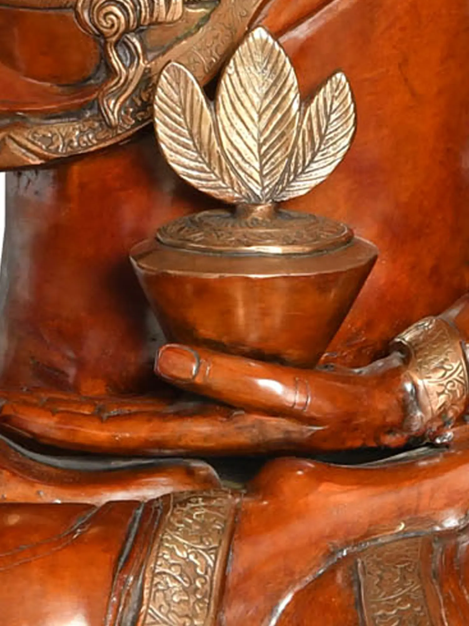 This magnificent brass statue depicts the Medicine Buddha, Bhaiṣajyaguru, a central figure in Mahayana Buddhism, renowned for his healing powers and his vow to heal the sicknesses of all sentient beings. The statue's considerable size commands attention, making it a powerful focal point for any sacred space or meditative environment. Crafted with meticulous detail by skilled artisans in India, this piece embodies centuries of artistic tradition and spiritual devotion. The serene countenance of the Medicine Buddha radiates compassion and wisdom. His eyes, downcast in gentle contemplation, suggest an awareness of the suffering in the world and a deep desire to alleviate it. The intricate detailing of his monastic robes, adorned with subtle yet striking patterns, speaks to the richness of Buddhist iconography. His posture, seated in the classic lotus position, signifies perfect stability and enlightenment. In his left hand, cradled in his lap, the Medicine Buddha holds a begging bowl filled with medicinal herbs and a stem of the Aruna fruit, symbolic of his role as the supreme physician. In his right hand, which rests on his knee, he holds a blooming flower, often identified as the sapphire flower or the blue lotus, which further signifies purity and the dispelling of ignorance. These attributes are crucial in understanding his spiritual significance as the Buddha of Medicine, capable of curing both physical and mental ailments.