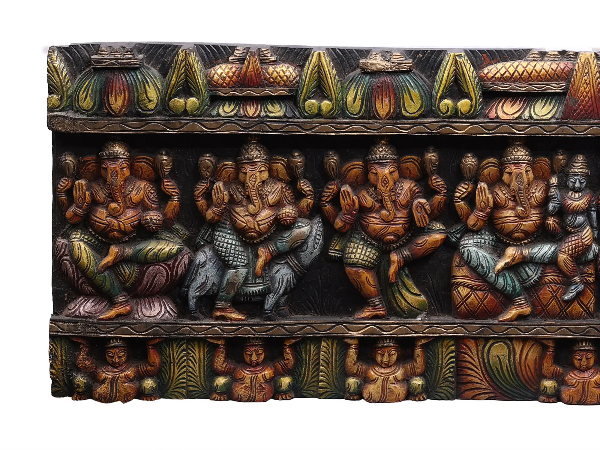 This magnificent wooden panel is a breathtaking testament to the artistry and devotion inspired by Lord Ganesha, the beloved remover of obstacles and patron of wisdom. Carved with exquisite detail, this impressive piece showcases the "Ashta Ganapati," or eight forms of Ganesha, each imbued with unique symbolism and divine attributes. The sheer scale of the panel, measuring 45 inches in length, allows for a detailed exploration of each depiction, creating a captivating visual narrative that draws the viewer into the rich tapestry of Hindu mythology. The intricate carvings extend beyond the central figures, featuring a decorative border that frames the divine assembly. The top of the panel is adorned with stylized lotus motifs and ornate patterns, reminiscent of temple architecture and auspicious floral designs. Below the Ashta Ganapati, a row of smaller figures, perhaps representing devotees or celestial attendants, supports the grand structure, adding depth and a sense of reverence. The overall composition is a harmonious blend of divine grandeur and meticulous craftsmanship, making it a truly exceptional decorative and spiritual centerpiece.