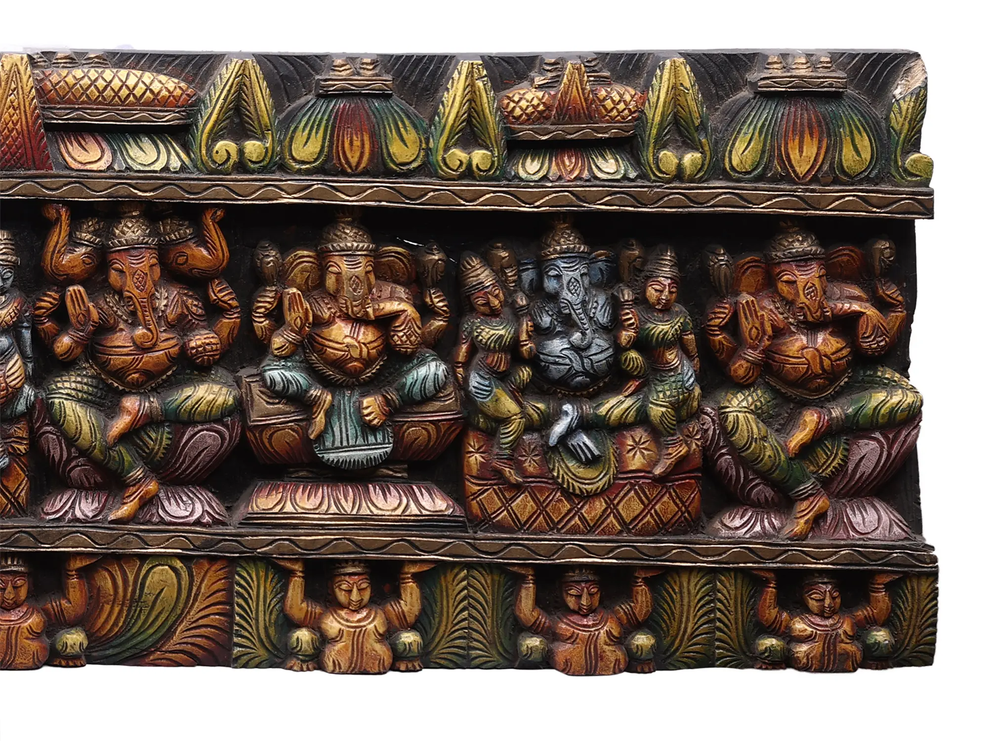 Crafted from high-quality wood, this panel has been meticulously carved by skilled artisans who have poured their talent and devotion into every detail. The use of wood, a natural and sacred material in many cultures, lends a warm and earthy aesthetic to the artwork. The hand-painted finish, with its rich, earthy tones and subtle metallic highlights, accentuates the intricate carvings, bringing the divine forms to life. The depth of the carving creates a play of light and shadow, adding to the visual appeal and conveying a sense of movement and dynamism. This piece is not merely a decorative item; it is a work of art that carries with it the spirit of tradition, devotion, and the enduring power of the divine. Its substantial size and intricate details make it an ideal statement piece for any home or sacred space, inviting contemplation and bestowing blessings of wisdom, prosperity, and well-being.