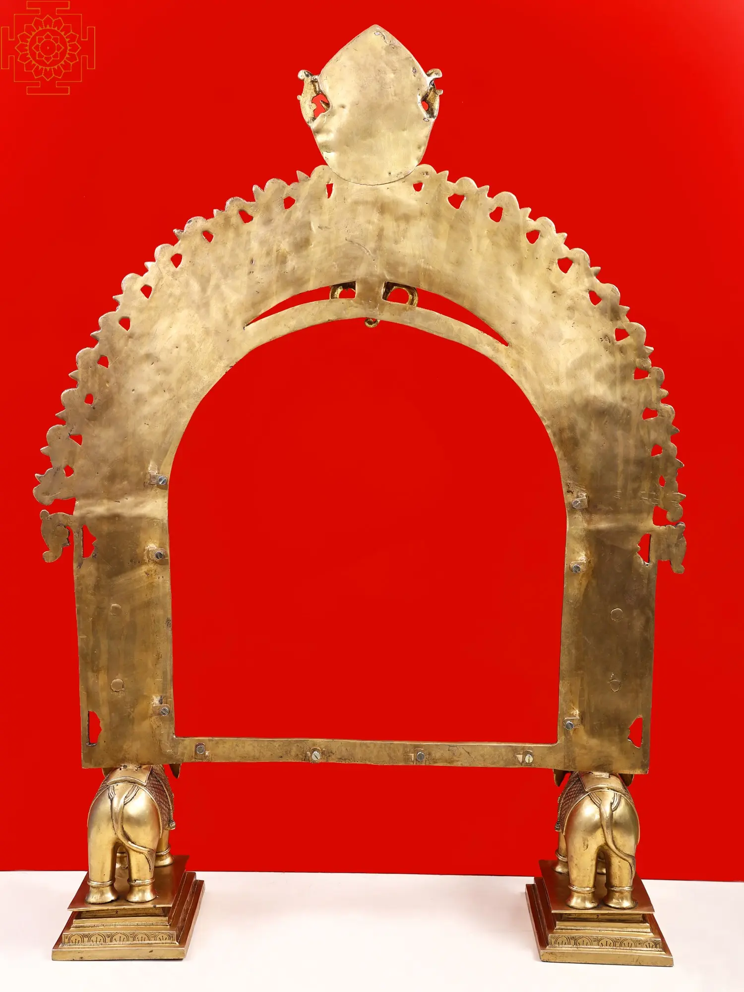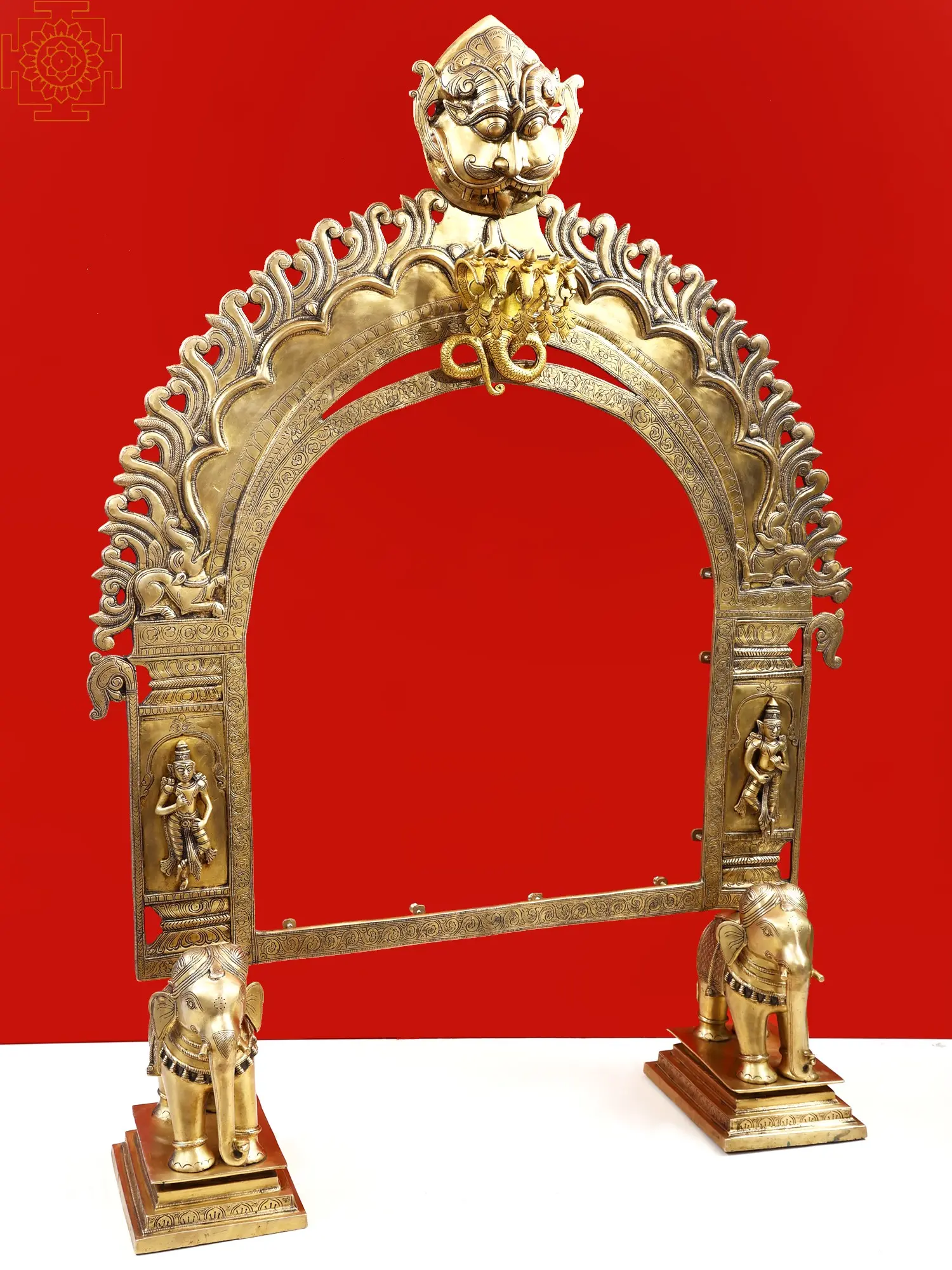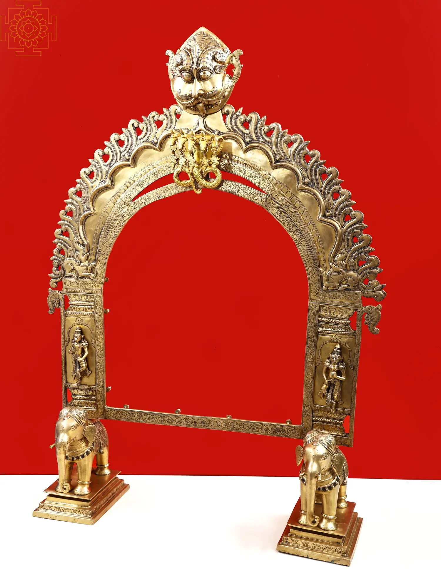 Behold the magnificence of our Large Brass Prabhavali with Kirtimukha, a symbol of grandeur and spirituality, meticulously handcrafted by skilled artisans. This ornate piece is more than just brass; it's a gateway to the divine, carried by the regal elephants as you engage with this Prabhavali, may you be transported to a realm of grandeur and devotion. The Kirtimukha emblem on top represents the celestial face of glory, inviting you to step into the grandeur of spirituality - carried on the backs of regal Gajas.
