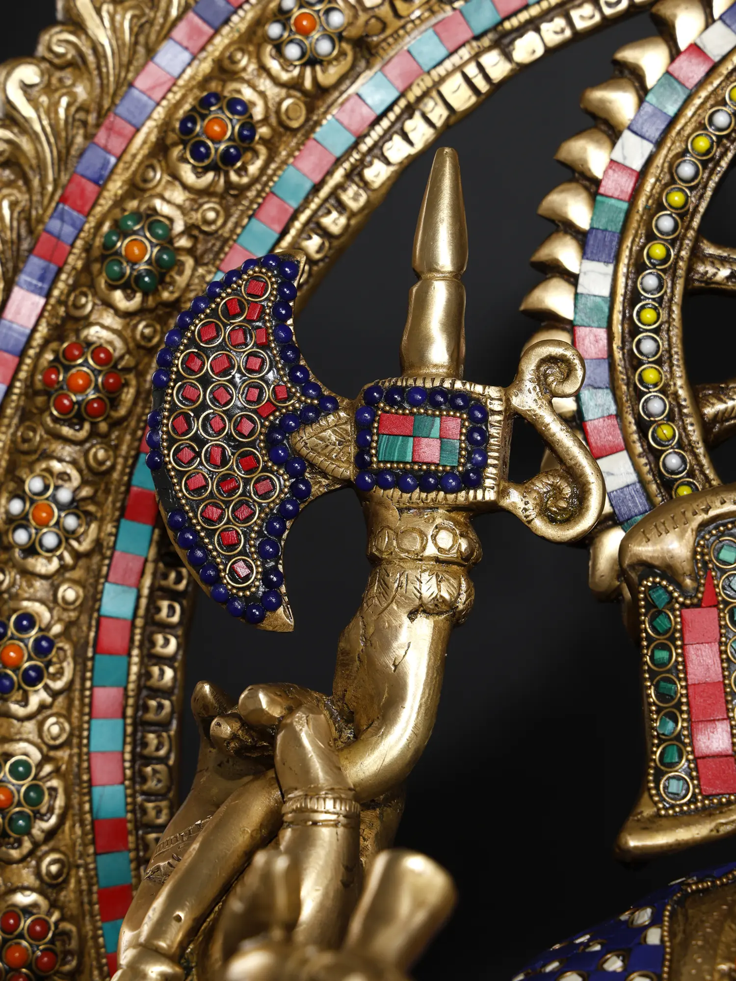 The Lord has a solar aura around his crown, beautifully inlaid jewelry, Tripunda and Trishula marks on his forehead, and colorfully embellished attire.