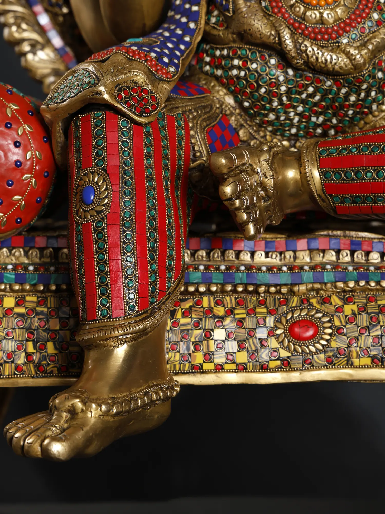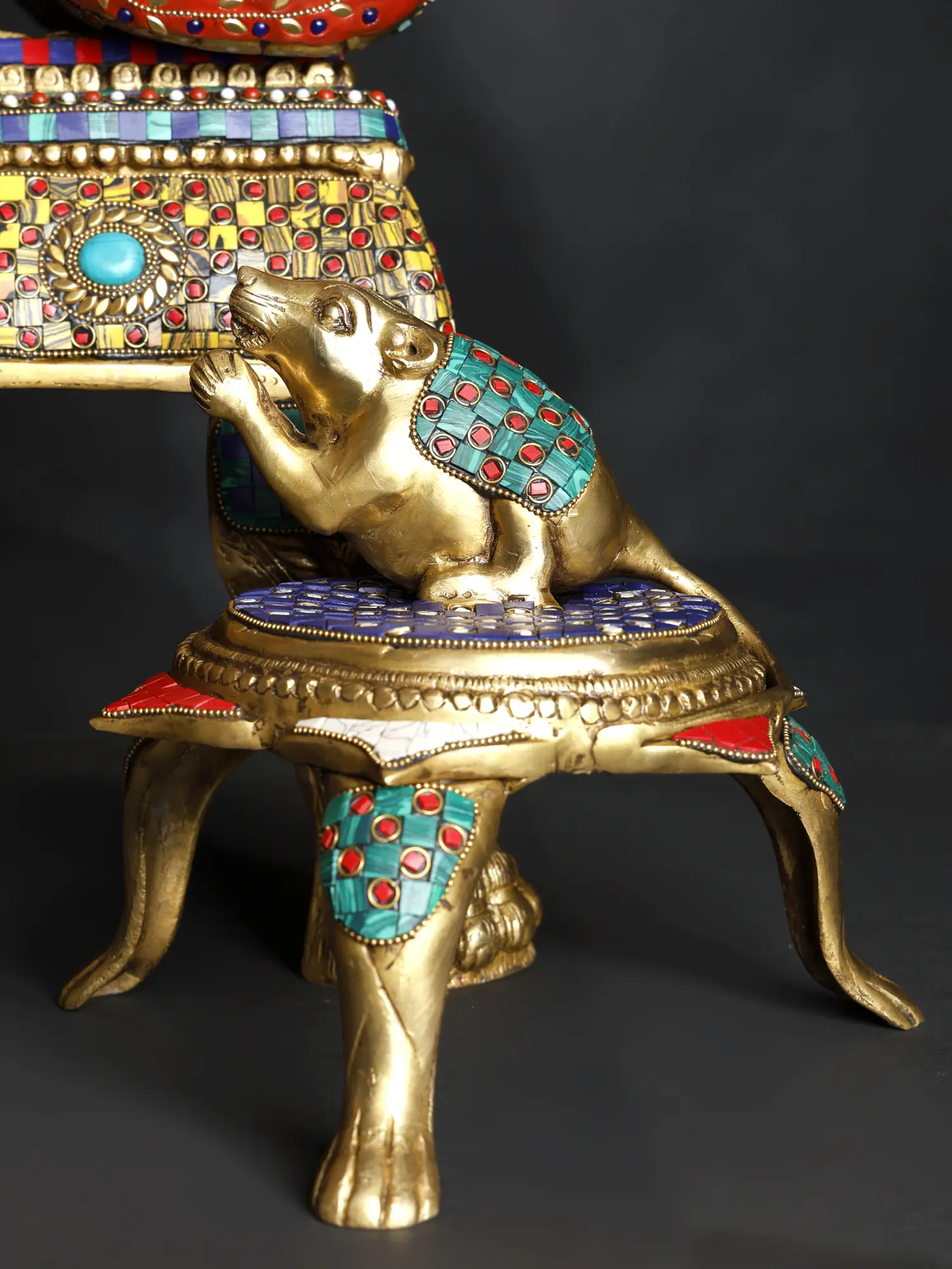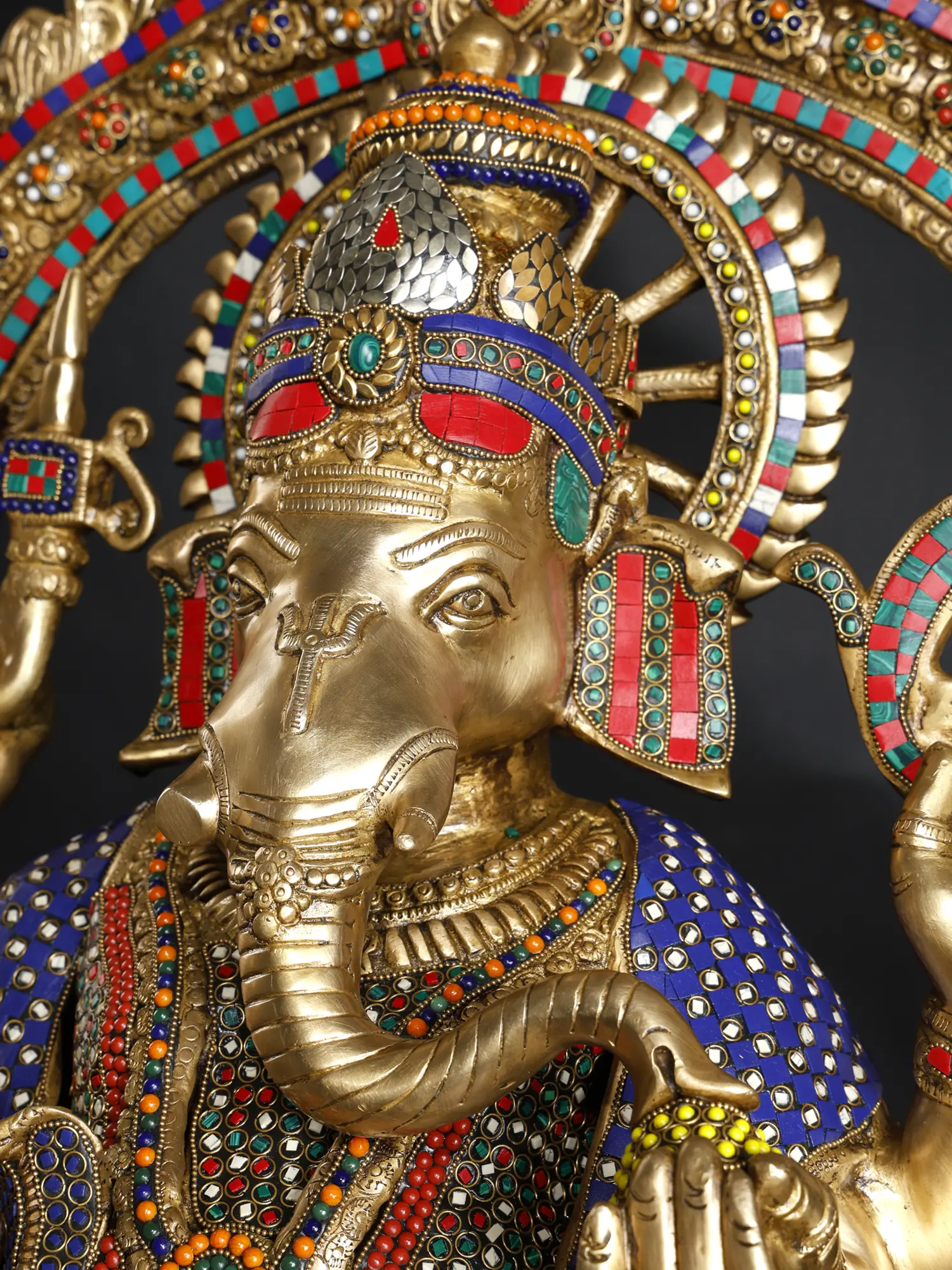 The brilliance of colorful inlay pieces and the timeless strength and luster of brass combine in this composition, making it a powerful vision of Ganesha in any space.