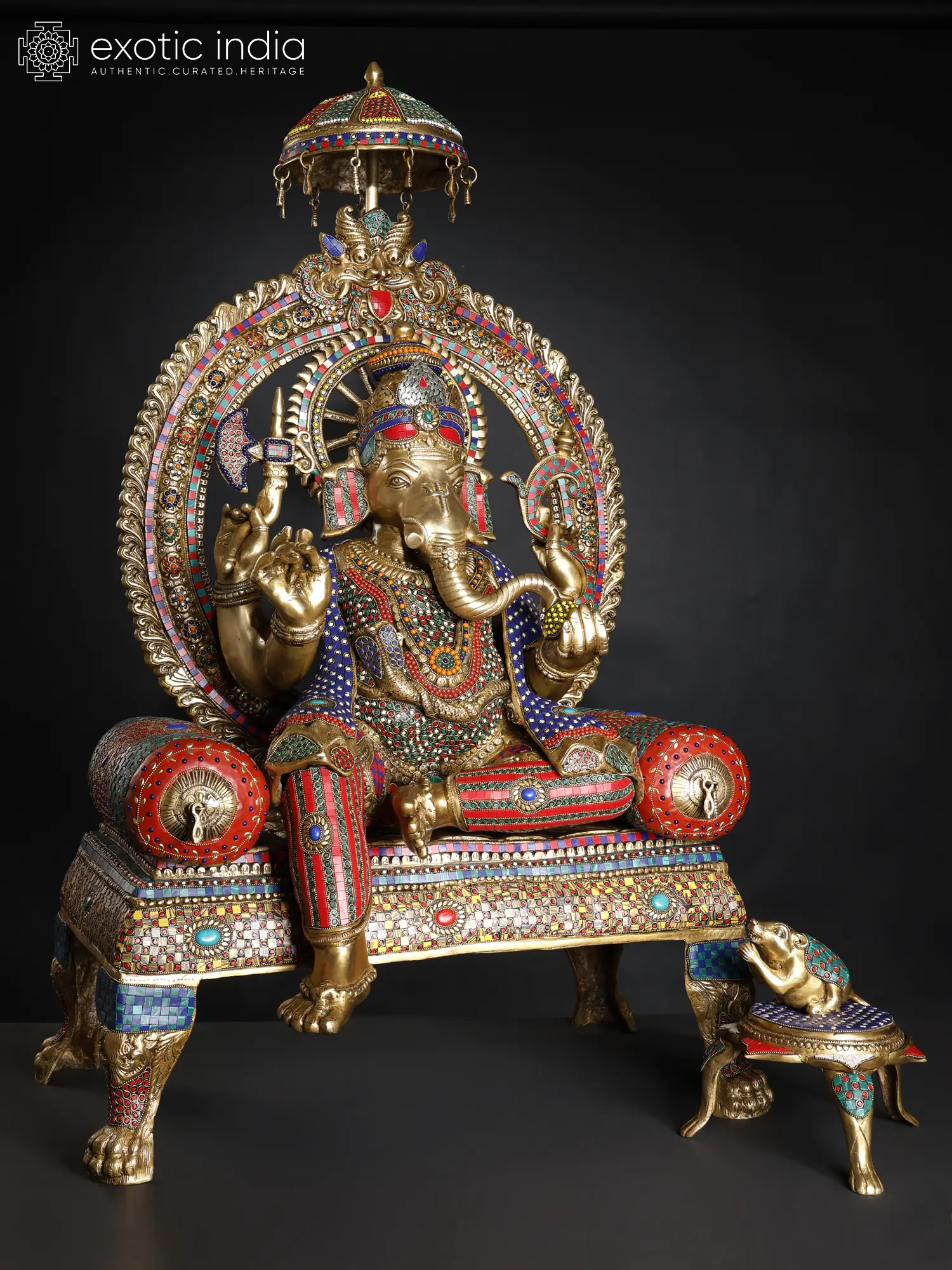 Seated on a regal throne, with a Chattra (royal insignia) and a majestic aureole around him, Sri Ganesha in this brass sculpture is the source of Universe’s auspiciousness, often evoked as Raja Ganapati, the divine king.