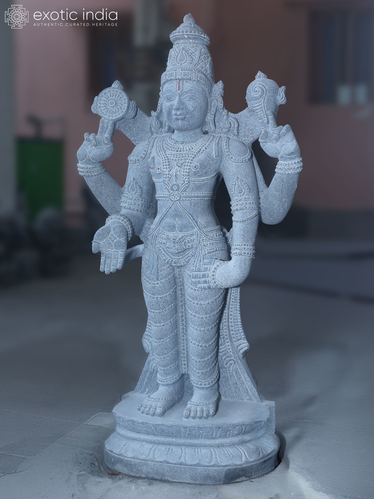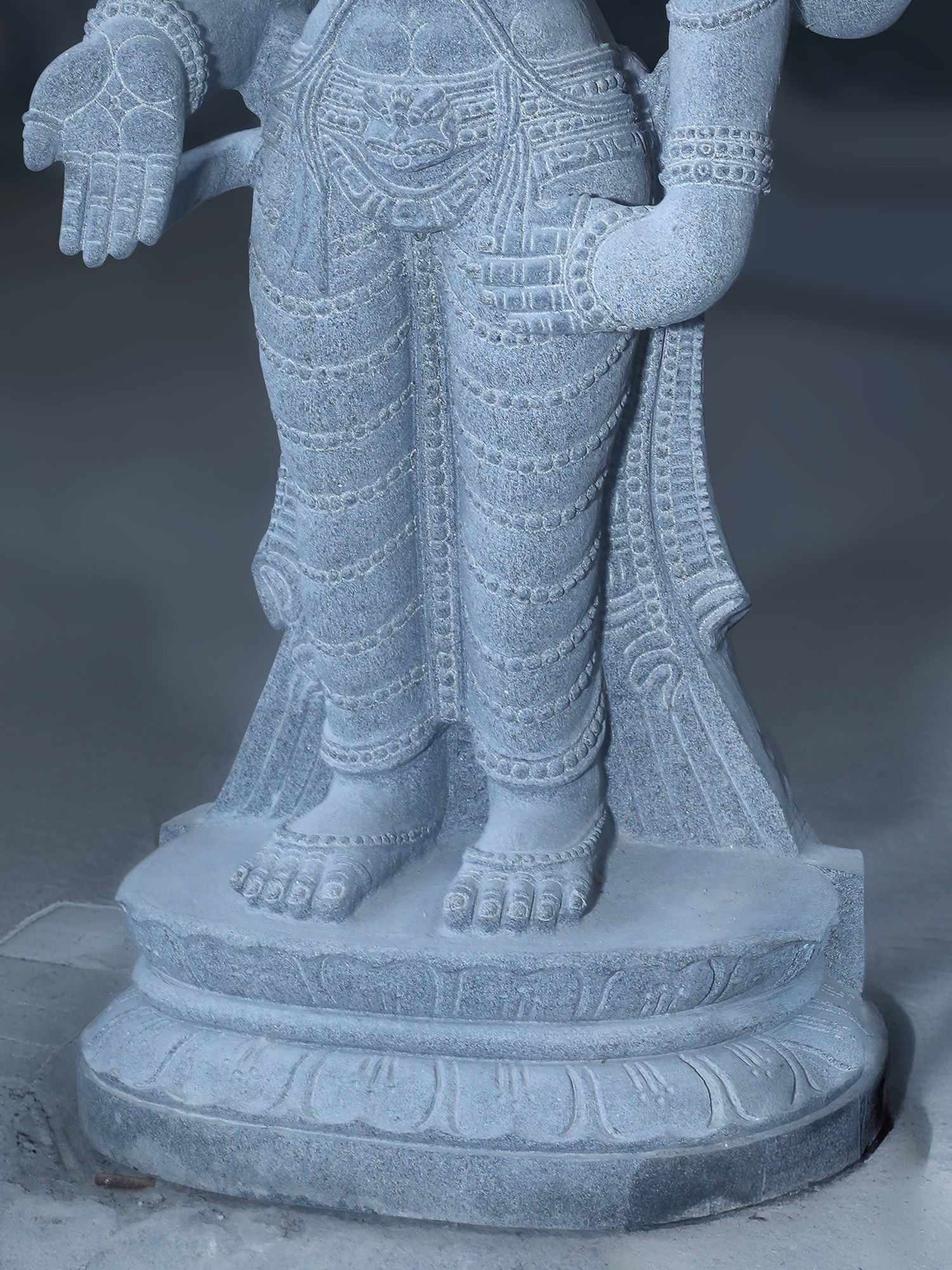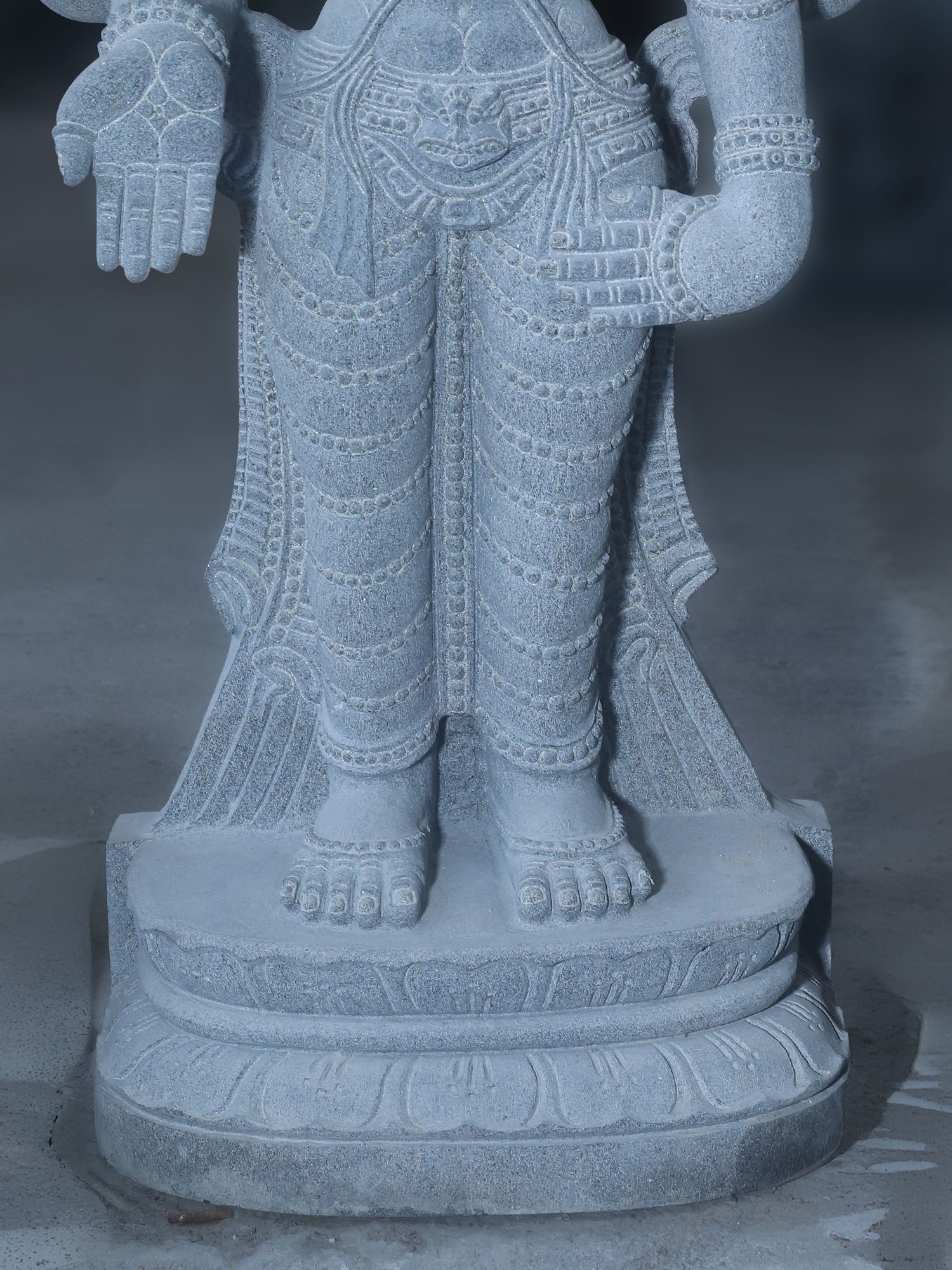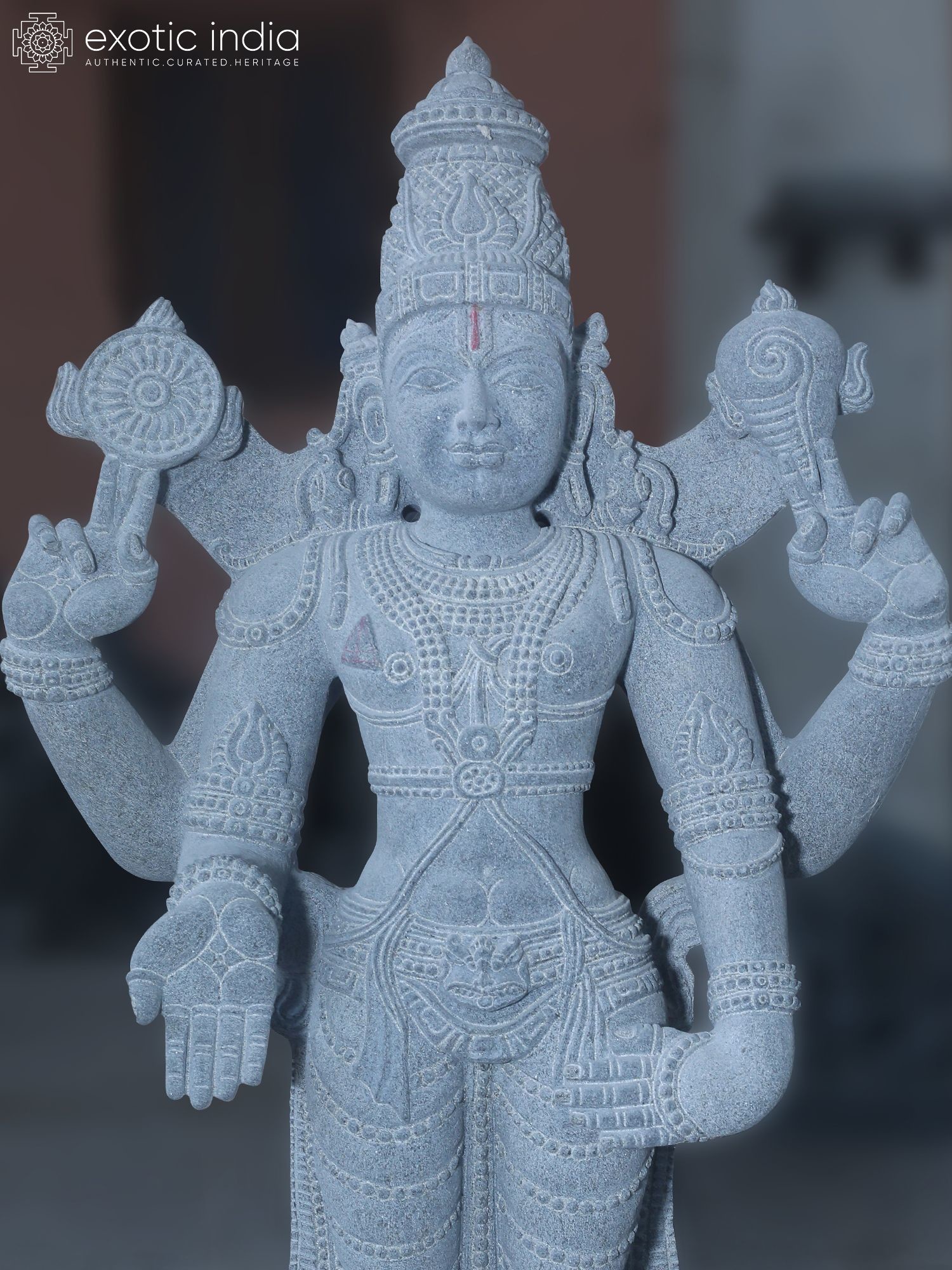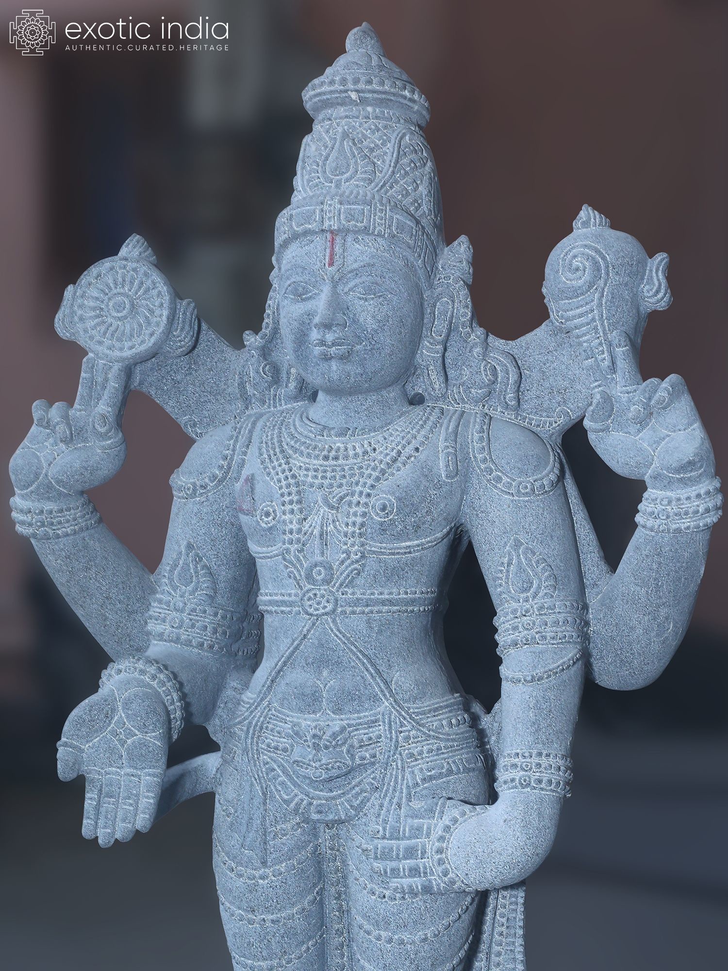 This impressive 46-inch granite statue depicts Lord Vishnu in a standing posture, embodying divine presence.
