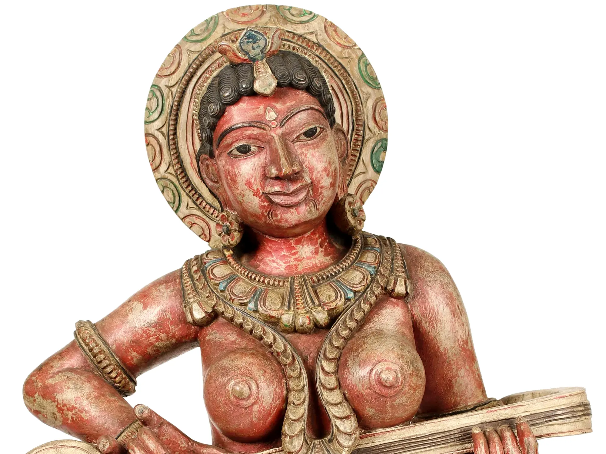The Apsara's posture suggests a moment of pure musical creation. Her fingers are positioned on the frets of the lute-like instrument, ready to coax forth a melody that would fill the heavens. Her eyes, though carved, convey a sense of serene focus and joy, as if lost in the rhythm and the sound. The vibrant hues of red and green, accented with touches of gold and blue, bring the wood to life, imbuing the figure with a sense of otherworldly vitality. This piece is a testament to the enduring power of traditional craftsmanship and the rich cultural heritage that inspires it, offering a focal point of beauty and spiritual contemplation for any space.