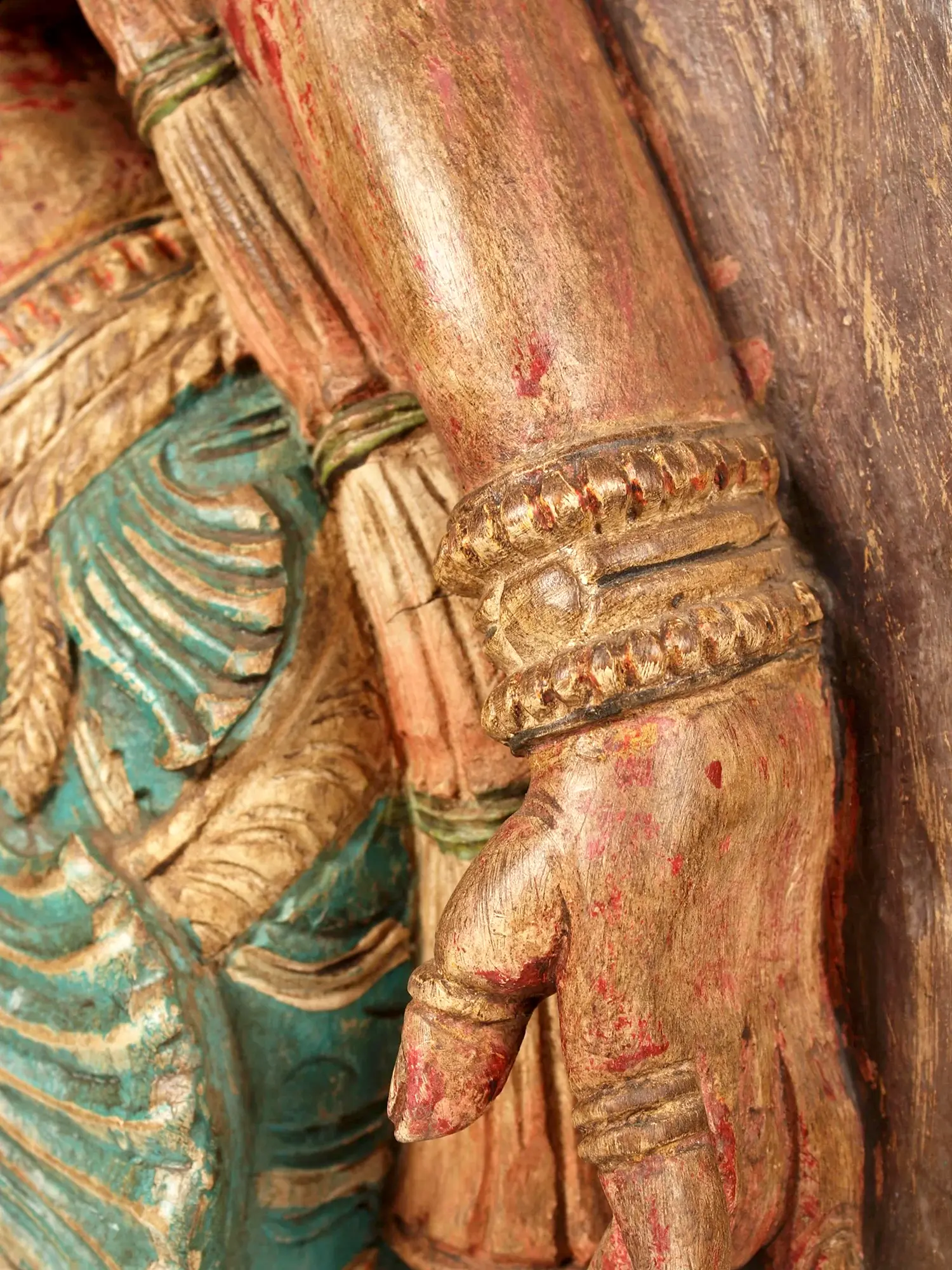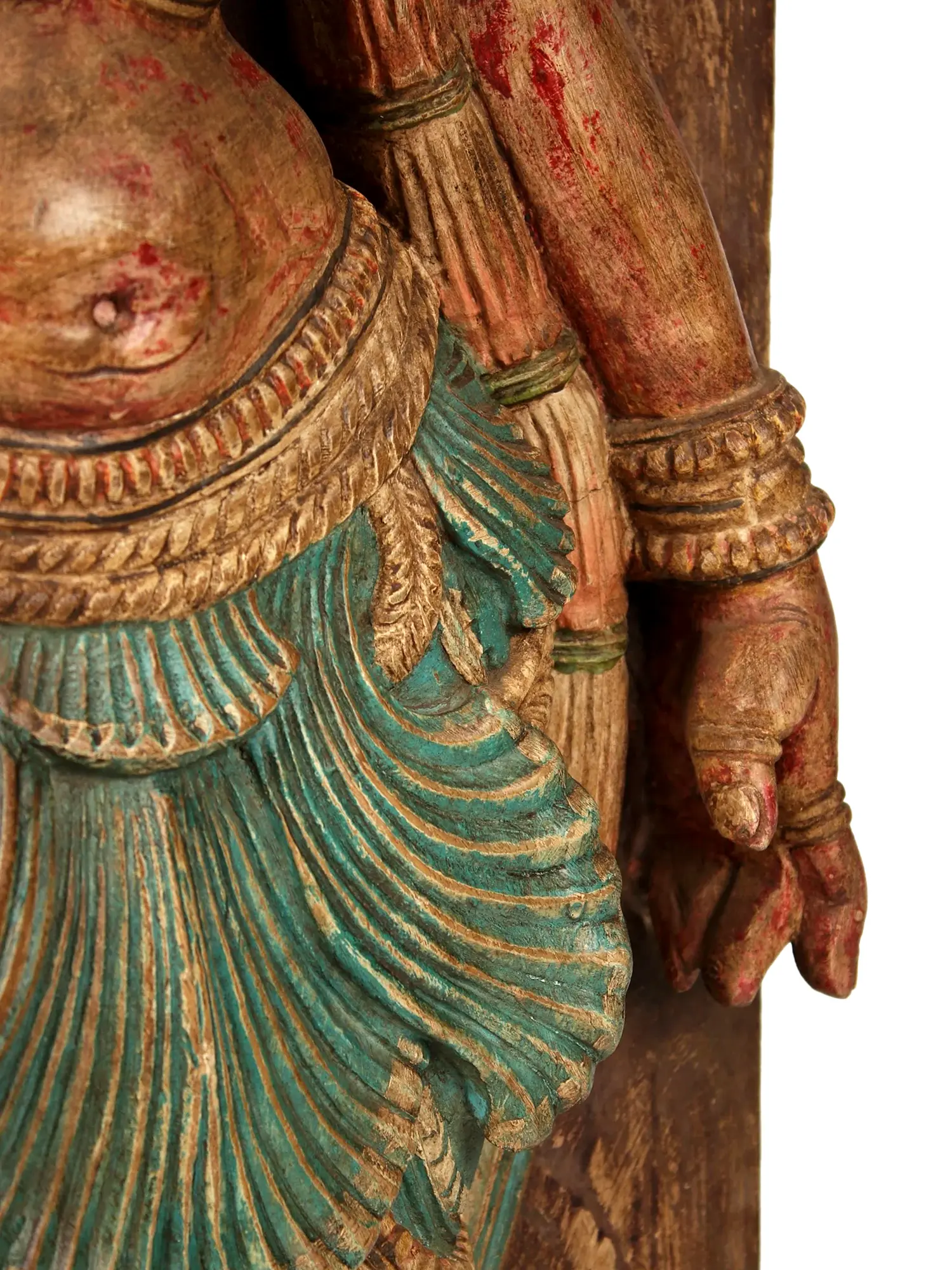 This wall panel is a testament to the skill of the artisan. Carved from solid wood, the depth and texture of the carving bring the figure to life. The weathered finish, with hints of subtle colors accentuating the carved details, adds a layer of authentic antiquity and character. The rich, earthy tones and the pops of turquoise and red on the attire and jewelry evoke the vibrant palette often seen in Indian temple art and folk traditions. The base upon which the figure stands is itself a masterpiece of decorative carving, featuring traditional motifs that further enhance the panel's aesthetic appeal. This piece is more than just a decorative item; it is a captured moment in artistry, a tangible link to a civilization that deeply valued beauty, spirituality, and the enduring power of craftsmanship. It's a statement piece that will undoubtedly become a focal point, sparking conversation and admiration for its unique cultural heritage and artistic merit.