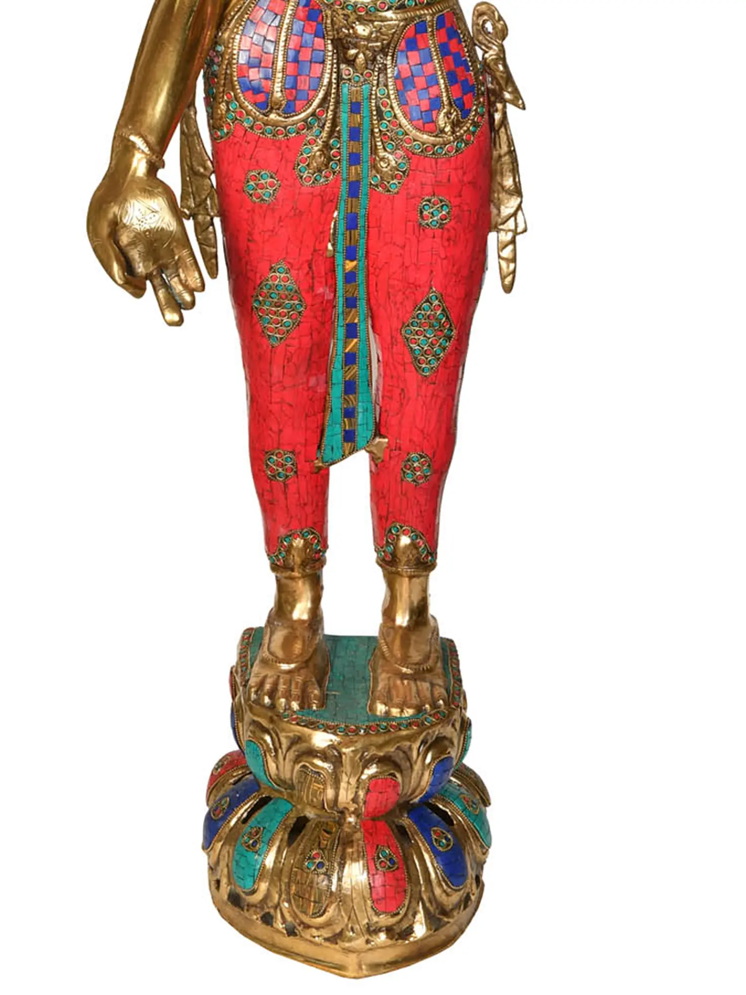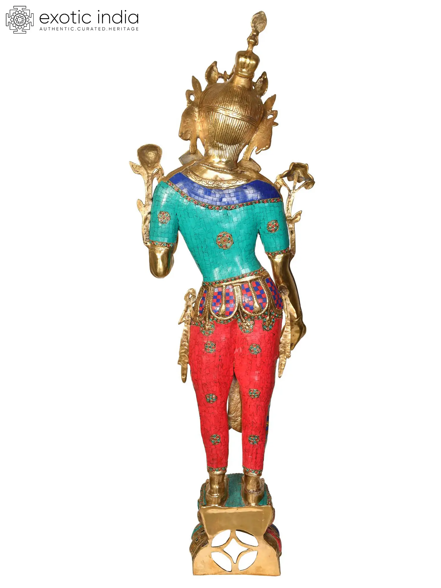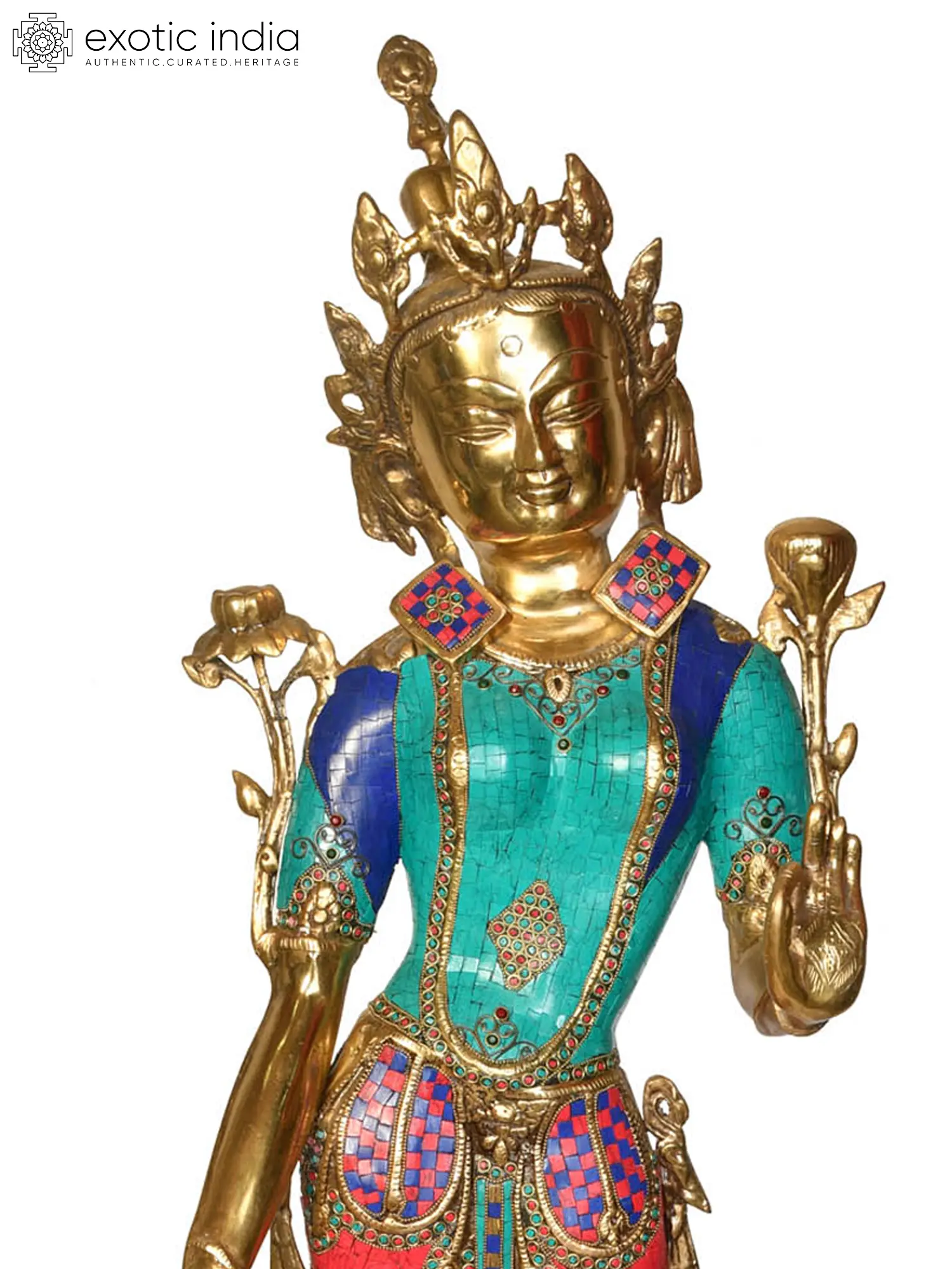 This exquisite standing figure of Tara, rendered in rich brass and adorned with vibrant inlays, is a breathtaking testament to the skill of Indian artisans. Standing at an impressive height, this statue embodies the serene and compassionate essence of Tara, a prominent Bodhisattva in Mahayana Buddhism. Her gentle gaze and graceful posture convey a sense of profound peace and unwavering support, inviting contemplation and spiritual solace. The meticulous craftsmanship, evident in every detail from the intricate crown to the delicate lotus blossoms she holds, speaks of a tradition steeped in devotion and artistic excellence.