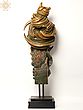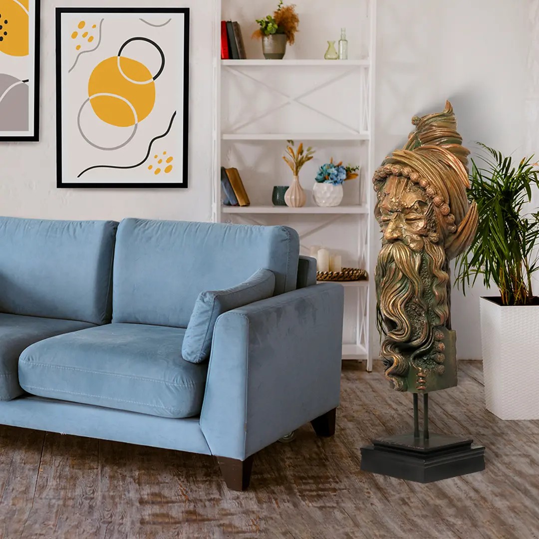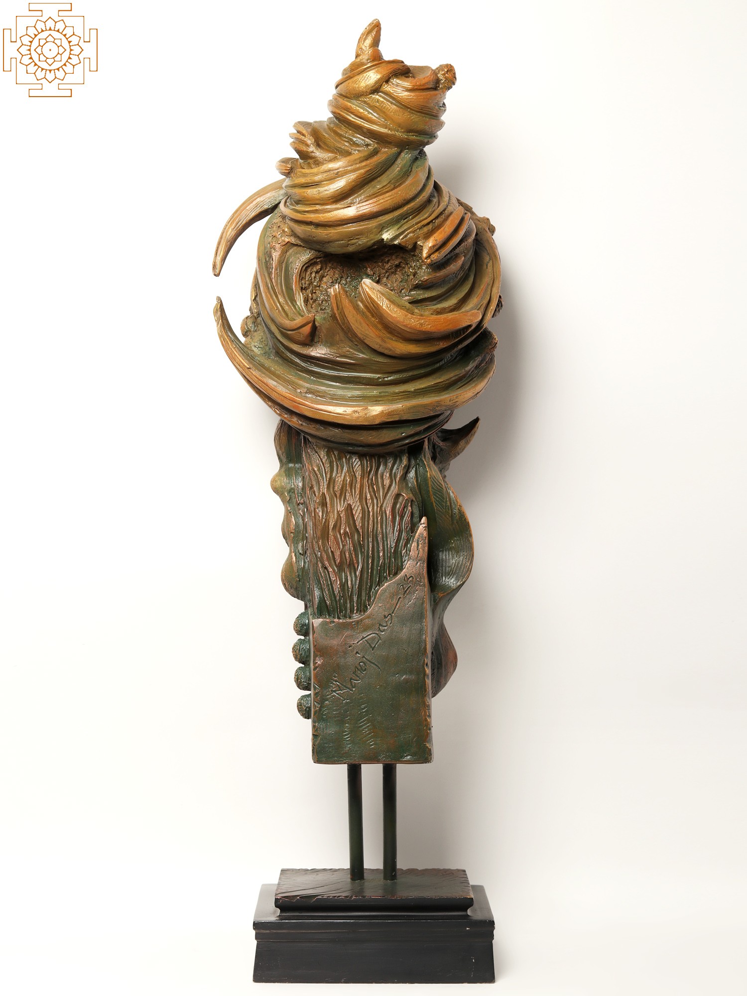 This breathtaking 48-inch sculpture, meticulously crafted by artist Manoj Das, stands as a powerful testament to the enigmatic Aghori tradition. The Aghoris, a sect of ascetics within Hinduism, are known for their unconventional practices and profound connection with the darker aspects of existence. They embrace the cycle of life and death, viewing even decay as a sacred process. This sculpture captures the essence of their spiritual journey with remarkable detail and artistic flair. The intense gaze of the Aghori, his weathered face etched with wisdom and experience, evokes a sense of both tranquility and power. His elaborate headdress, intricately sculpted with swirling textures, symbolizes the complexities of the spiritual path.