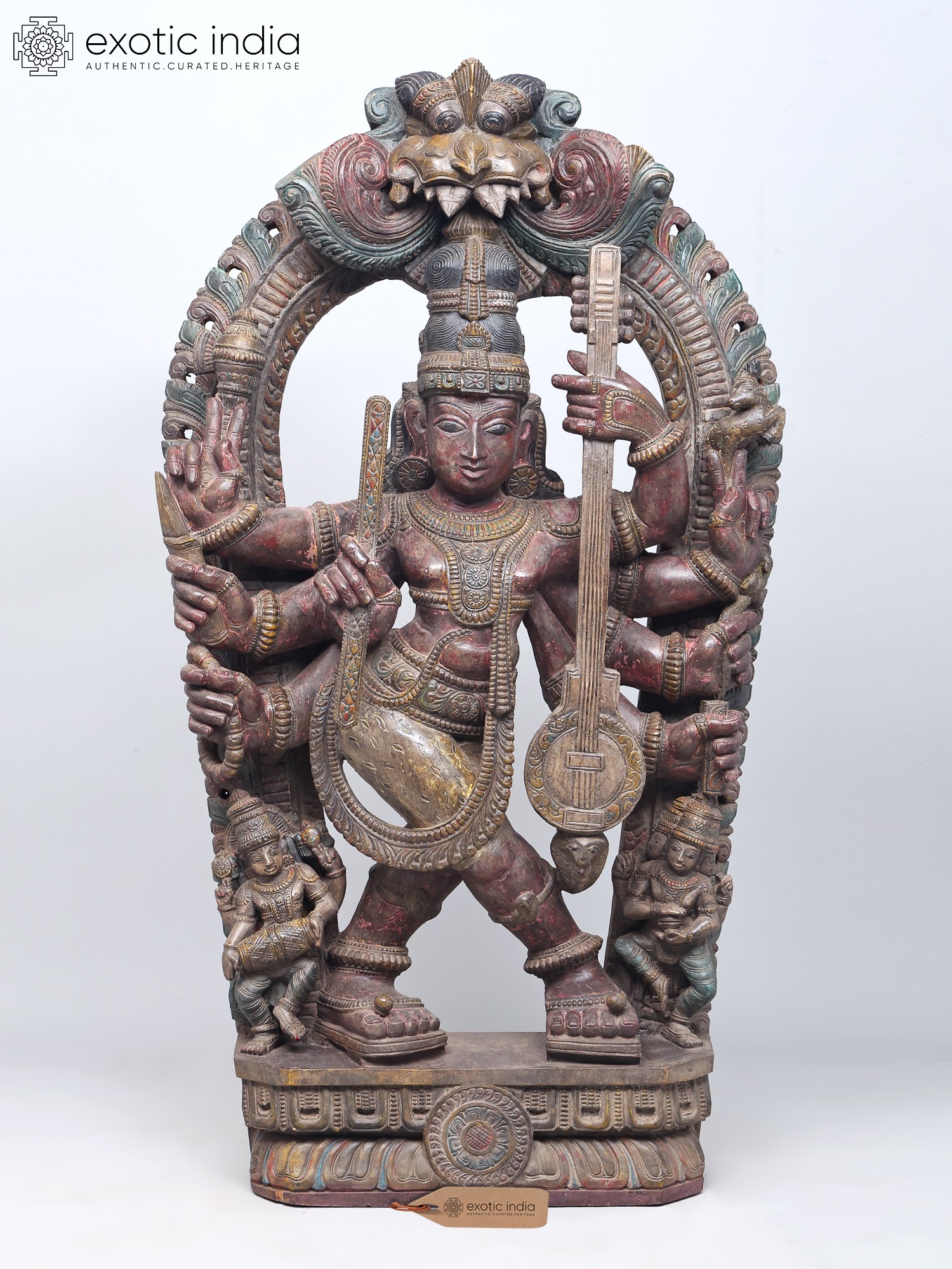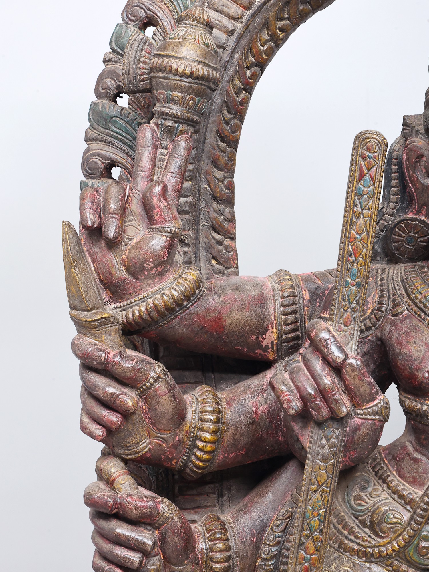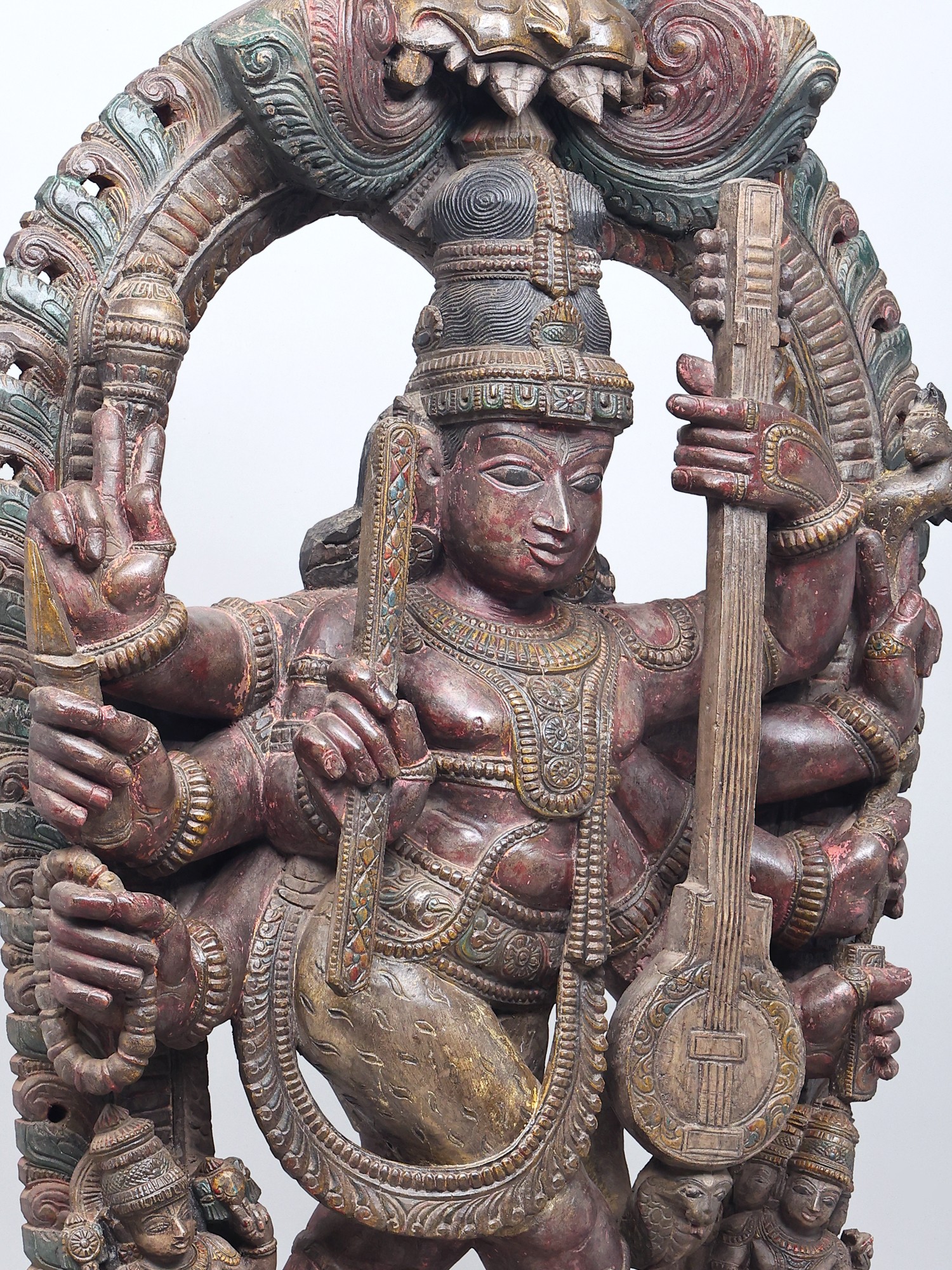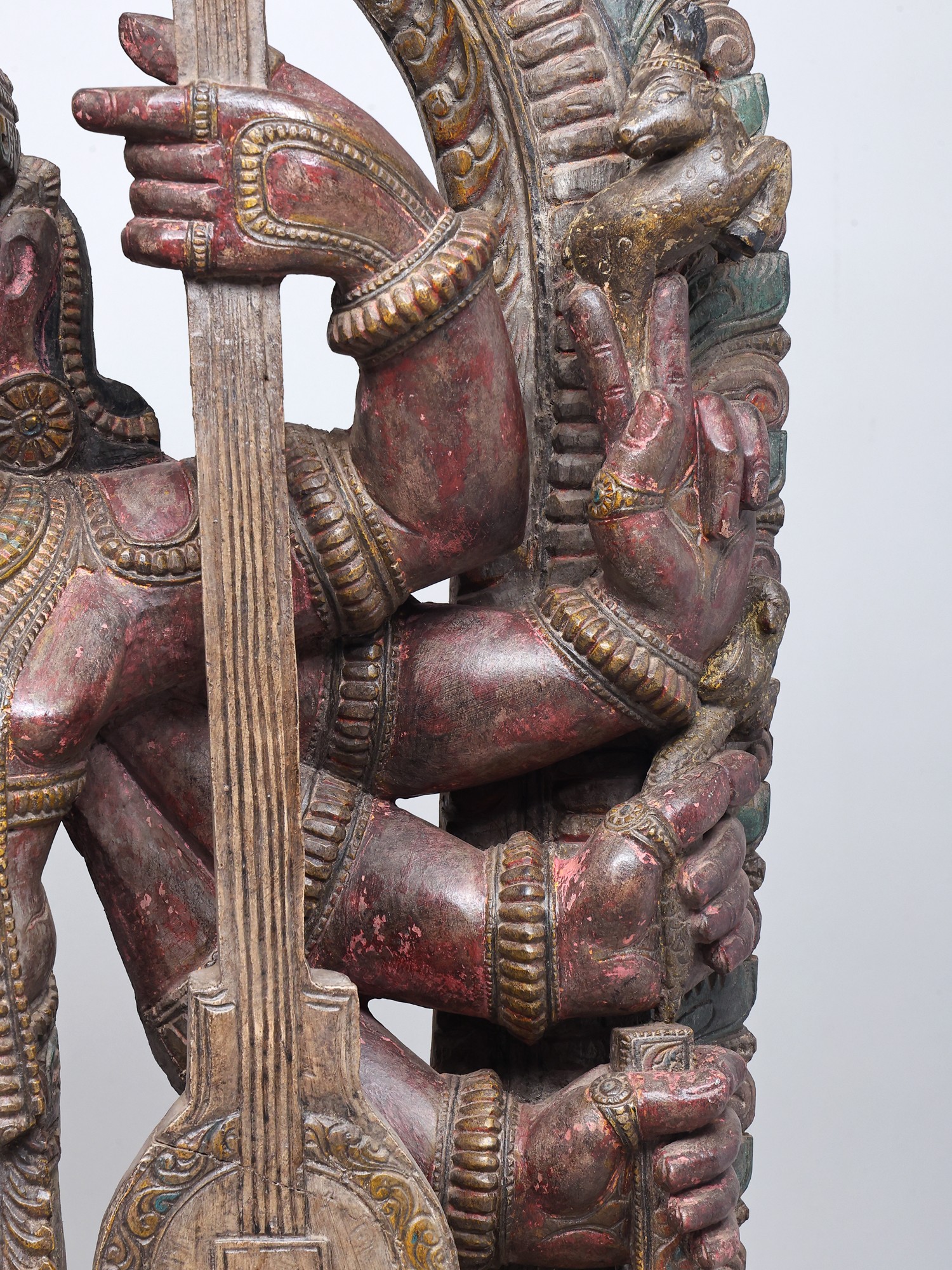 When we think of Shiva, the imagery is often singular in one’s mind, as a dancer in Ananda Tandava - Shiva, who’s beyond the regulation of imagination, carved into this stunning wooden figurine is depicted as a musician -Ashtabhujadhari Pasupati (eight-armed) about to perform the dance of cosmic essence within the Prabhamandala with a Kirtimukha. His eyes inspire an impression of fierceness, with his legs crossed; he holds an axe, dagger, Japa mala, Kartal, Sitar, antelope, fire, and sutra. Ornamented with chains and Naga coils, he wears the Khadau on his feet. Curved at his waist almost in the initiation of the movement, he’s accompanied by Lord Vishnu playing the mridangam and Lord Brahma playing the manjeera/jalra - together forming the rhythm of the world representing creation, preservation, and destruction.