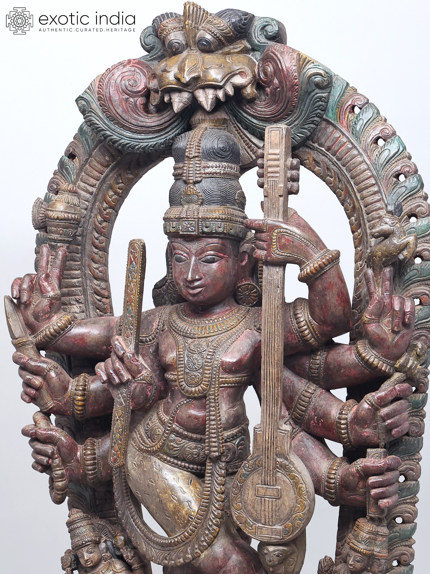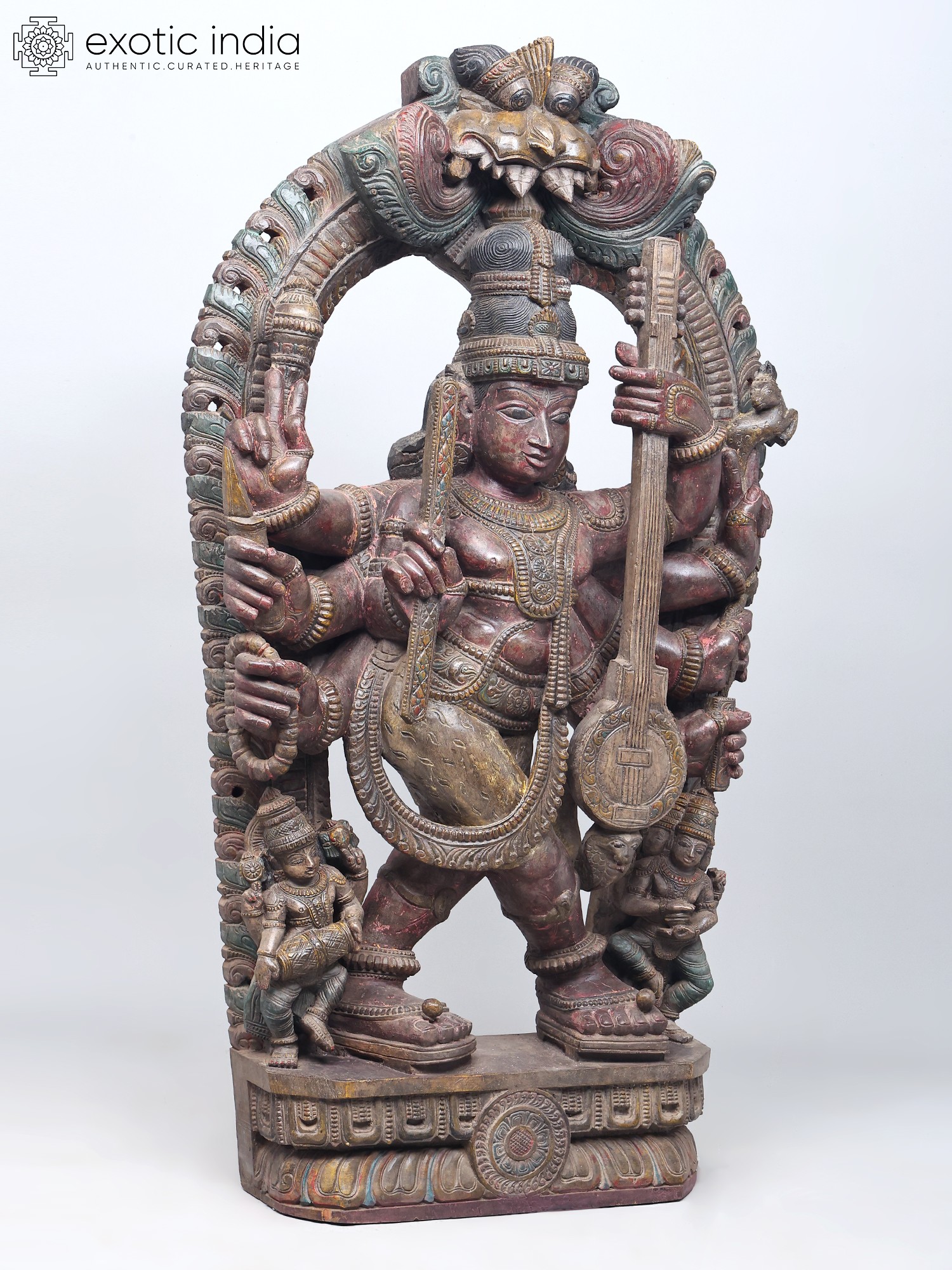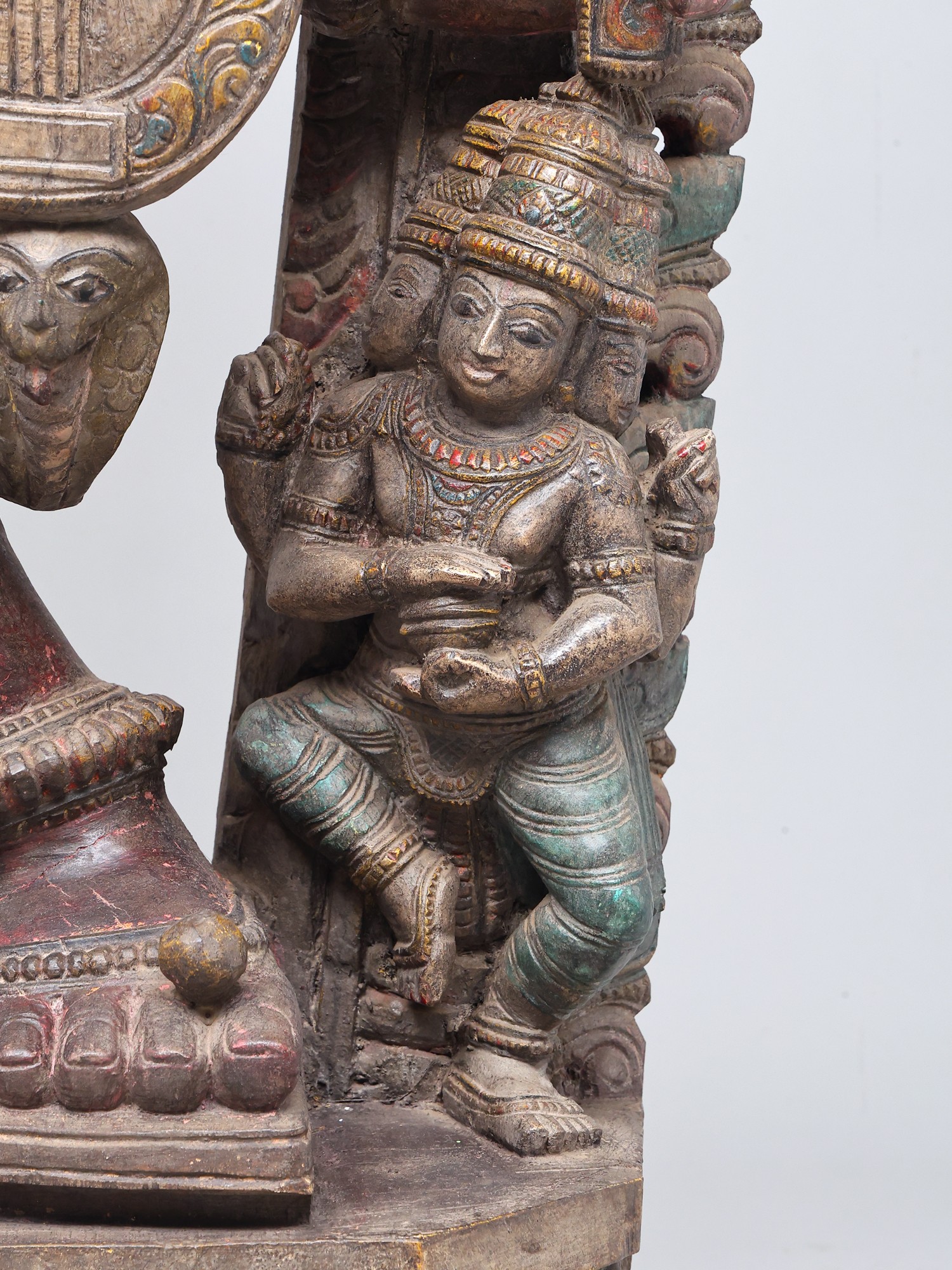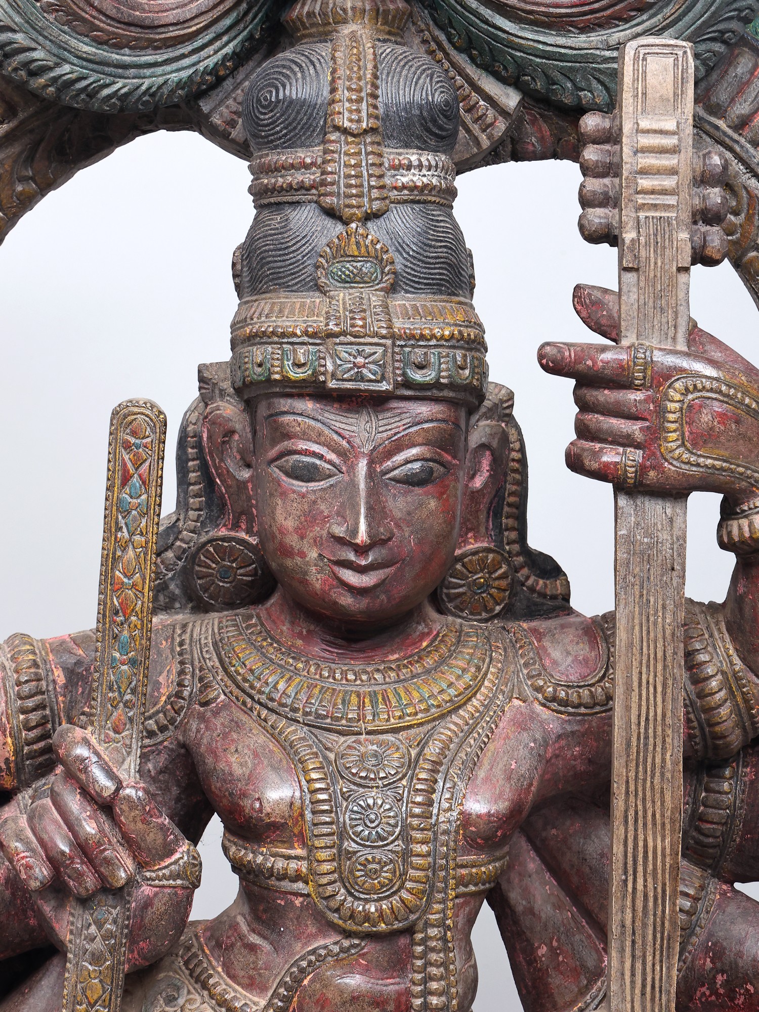 When we think of Shiva, the imagery is often singular in one’s mind, as a dancer in Ananda Tandava - Shiva, who’s beyond the regulation of imagination, carved into this stunning wooden figurine is depicted as a musician -Ashtabhujadhari Pasupati (eight-armed) about to perform the dance of cosmic essence within the Prabhamandala with a Kirtimukha. His eyes inspire an impression of fierceness, with his legs crossed; he holds an axe, dagger, Japa mala, Kartal, Sitar, antelope, fire, and sutra. Ornamented with chains and Naga coils, he wears the Khadau on his feet. Curved at his waist almost in the initiation of the movement, he’s accompanied by Lord Vishnu playing the mridangam and Lord Brahma playing the manjeera/jalra - together forming the rhythm of the world representing creation, preservation, and destruction.