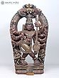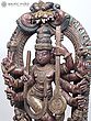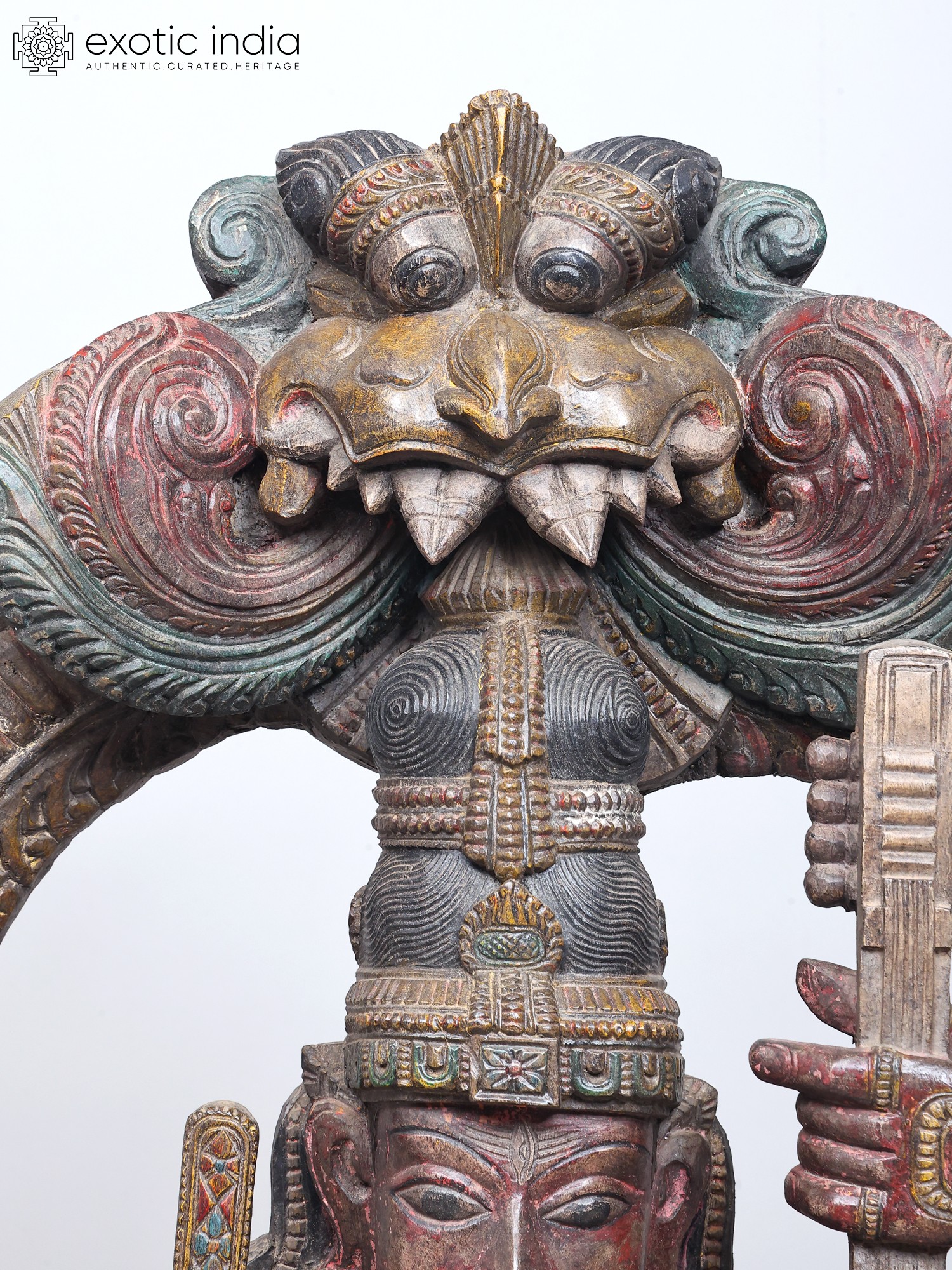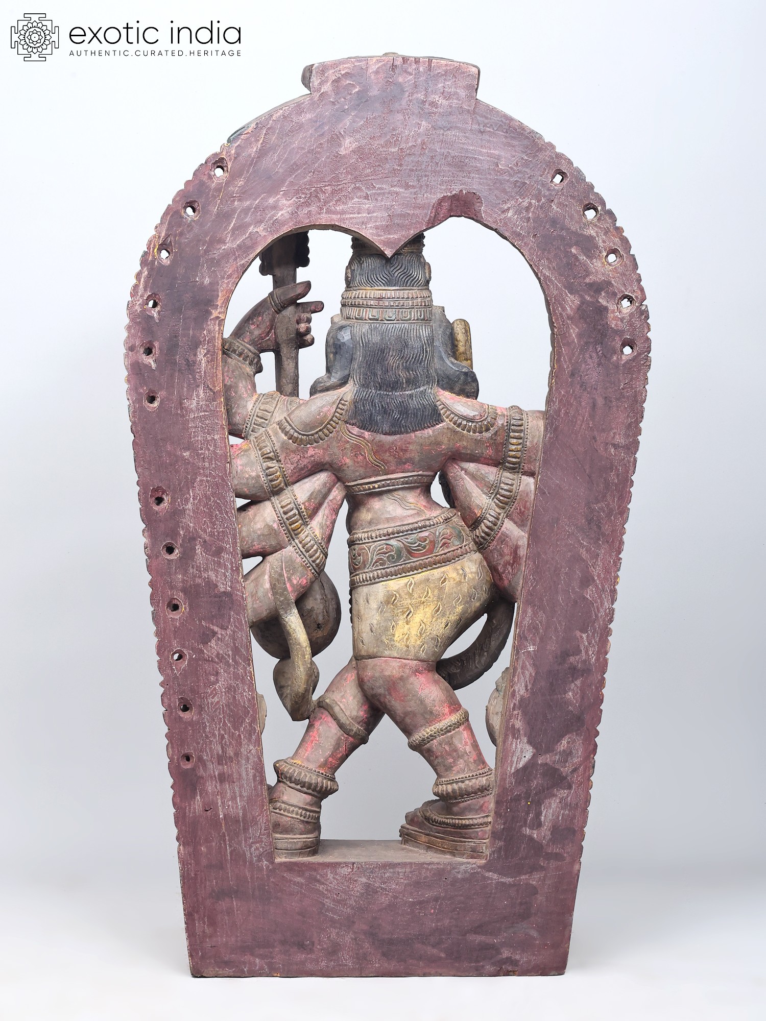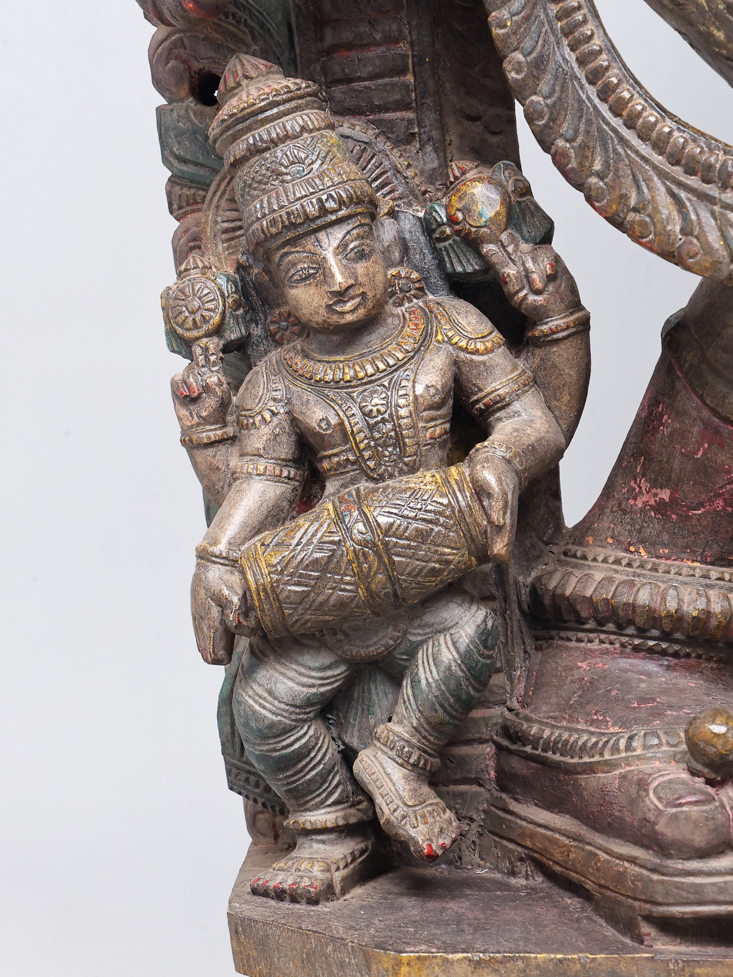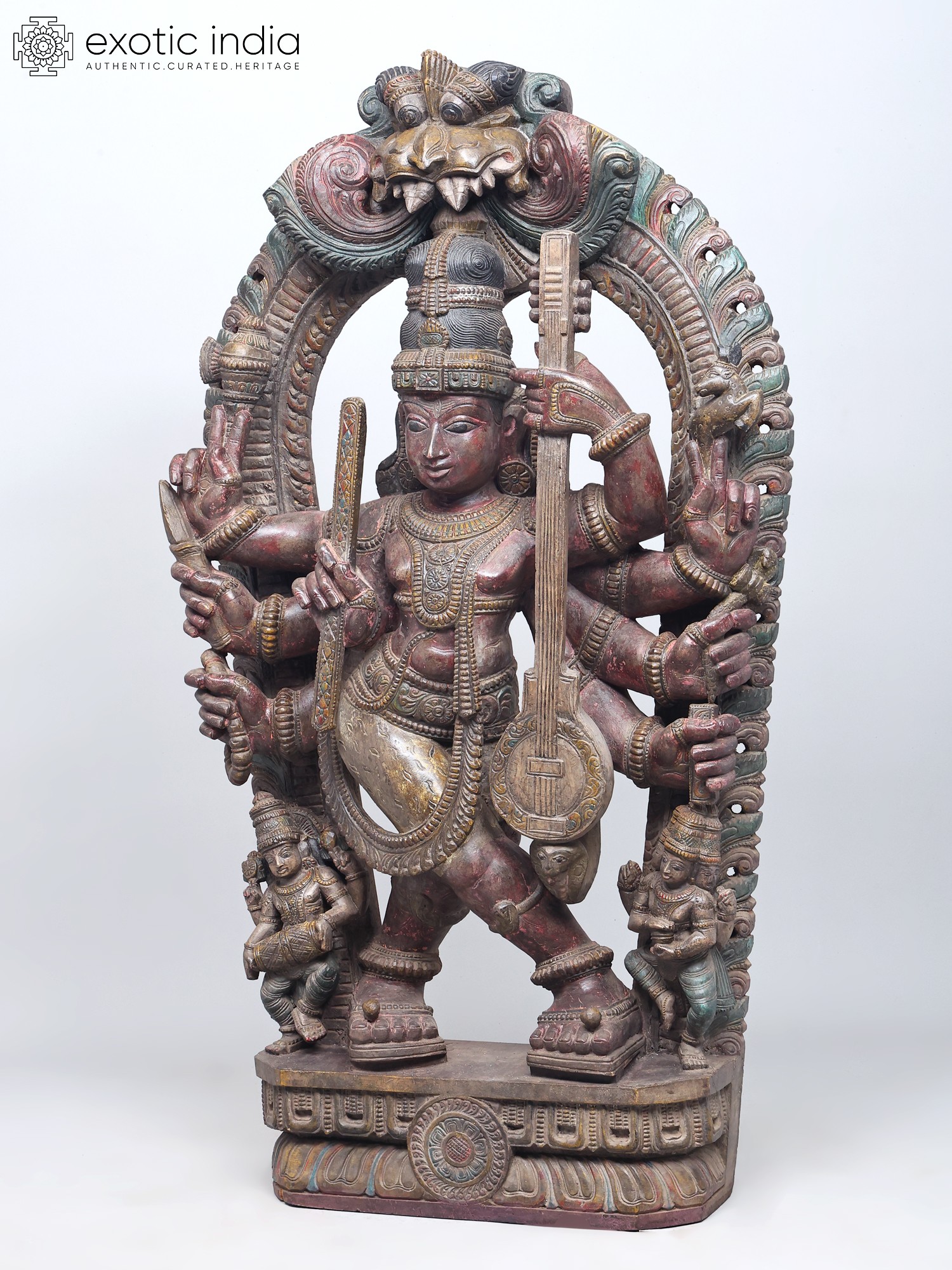 When we think of Shiva, the imagery is often singular in one’s mind, as a dancer in Ananda Tandava - Shiva, who’s beyond the regulation of imagination, carved into this stunning wooden figurine is depicted as a musician -Ashtabhujadhari Pasupati (eight-armed) about to perform the dance of cosmic essence within the Prabhamandala with a Kirtimukha. His eyes inspire an impression of fierceness, with his legs crossed; he holds an axe, dagger, Japa mala, Kartal, Sitar, antelope, fire, and sutra. Ornamented with chains and Naga coils, he wears the Khadau on his feet. Curved at his waist almost in the initiation of the movement, he’s accompanied by Lord Vishnu playing the mridangam and Lord Brahma playing the manjeera/jalra - together forming the rhythm of the world representing creation, preservation, and destruction.