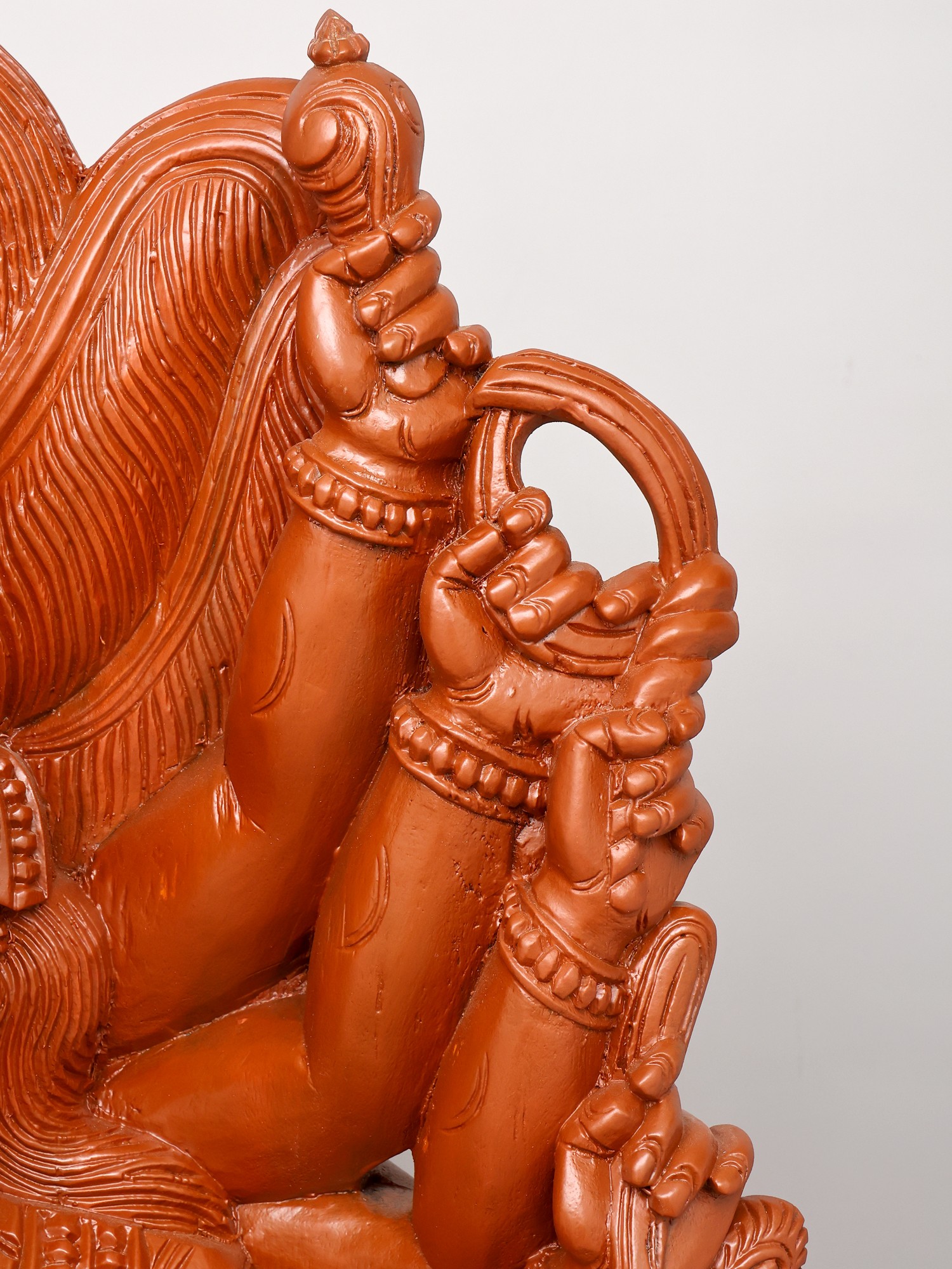 This magnificent wood carving captures the formidable and benevolent presence of Goddess Durga, also known as Sherawali Maa, the Great Goddess, the Mother of the Universe. Standing tall and commanding, this sculpture embodies her celestial might and maternal grace, making it a truly awe-inspiring piece for any sacred space or discerning collection. The goddess is depicted with her iconic eighteen arms, each extended in a posture of power, protection, or benediction. These numerous limbs symbolize her omnipotence and her ability to engage with and overcome any obstacle. In Hindu mythology, Durga's multiple arms are often seen as an indication of her divine energy, Shakti, which she uses to protect her devotees and vanquish evil forces. She is often shown holding various celestial weapons and emblems, each representing a different aspect of her power and wisdom. The intricate details of her adornments, from her regal crown to her ornate jewelry, speak to her status as a supreme deity.