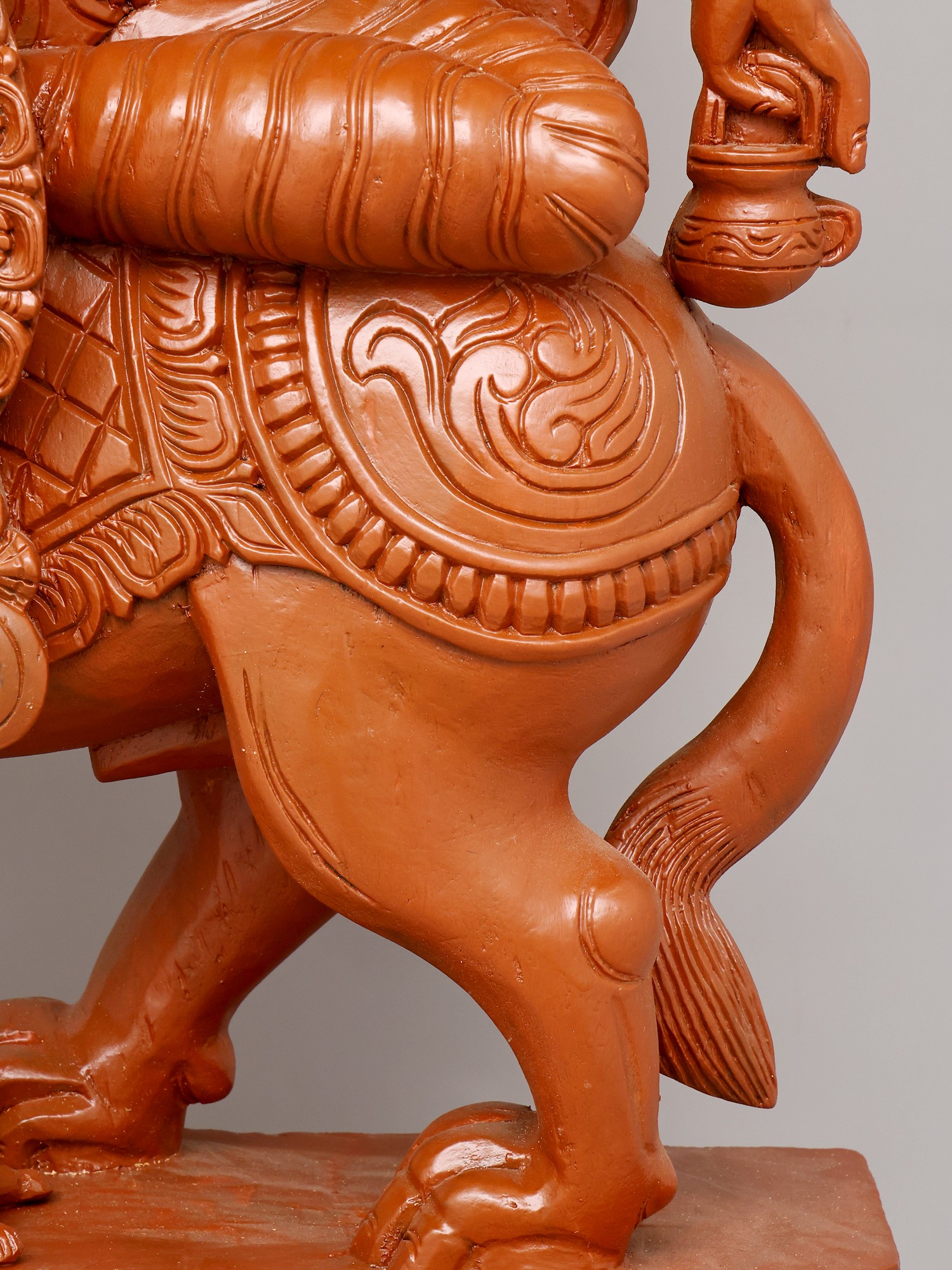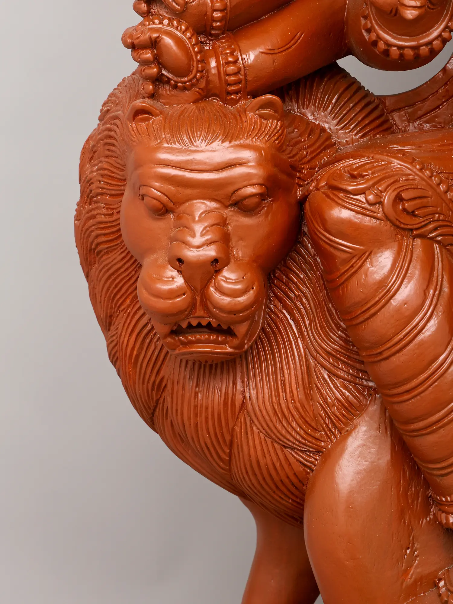 Seated upon her powerful vahana, the lion, this sculpture further emphasizes Durga's formidable nature. The lion, a symbol of strength, courage, and royalty, represents the untamed power that the Goddess controls. Her serene yet firm posture astride the majestic beast signifies her mastery over all primal forces and her unwavering resolve in combating injustice. The lion's fierce expression and muscular physique are rendered with remarkable skill, conveying both its ferocity and its unwavering loyalty to the Goddess. The depiction of the lion is not merely ornamental; it is an integral part of Durga's iconography, reinforcing her role as the destroyer of demons and the protector of the cosmos.