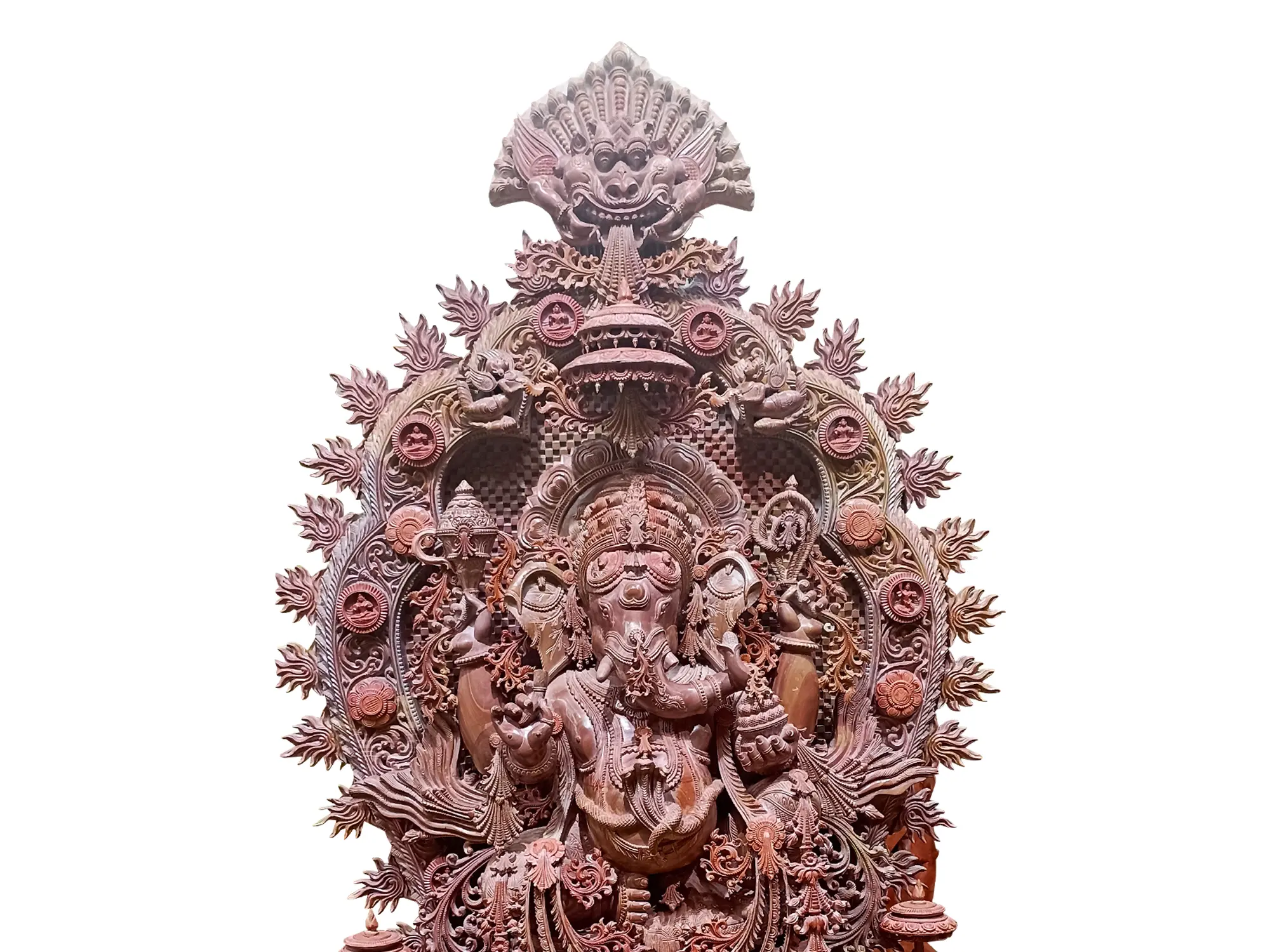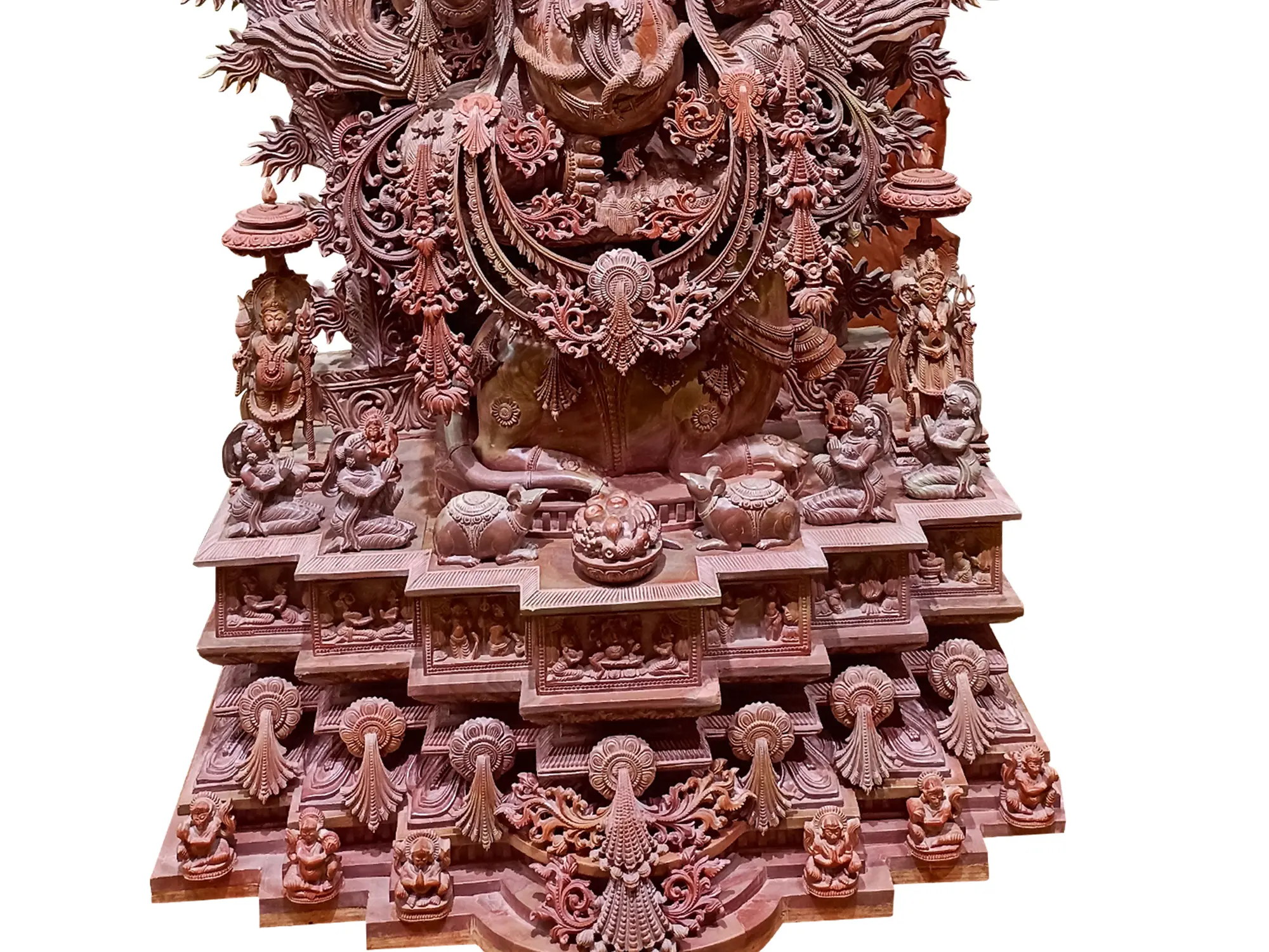 Behold a truly magnificent piece, a testament to divine artistry and enduring spirit. This monumental statue, crafted from exquisite pink serpentine stone, stands as a powerful representation of Gajanana, the beloved elephant-headed deity revered as the remover of obstacles and the bestower of wisdom and prosperity. The sheer scale of this piece, towering at an impressive height, commands attention and evokes a sense of awe, making it a truly remarkable addition to any garden or sacred space. The craftsmanship displayed here is nothing short of extraordinary. Every inch of this statue is adorned with super intricate carvings, creating a tapestry of divine imagery and symbolic motifs. From the serene yet powerful countenance of Gajanana himself to the elaborate ornamentation that surrounds him, each detail speaks of devotion and mastery. The delicate rendering of flora, celestial beings, and auspicious symbols woven into the design creates a visual narrative that is both captivating and spiritually resonant.